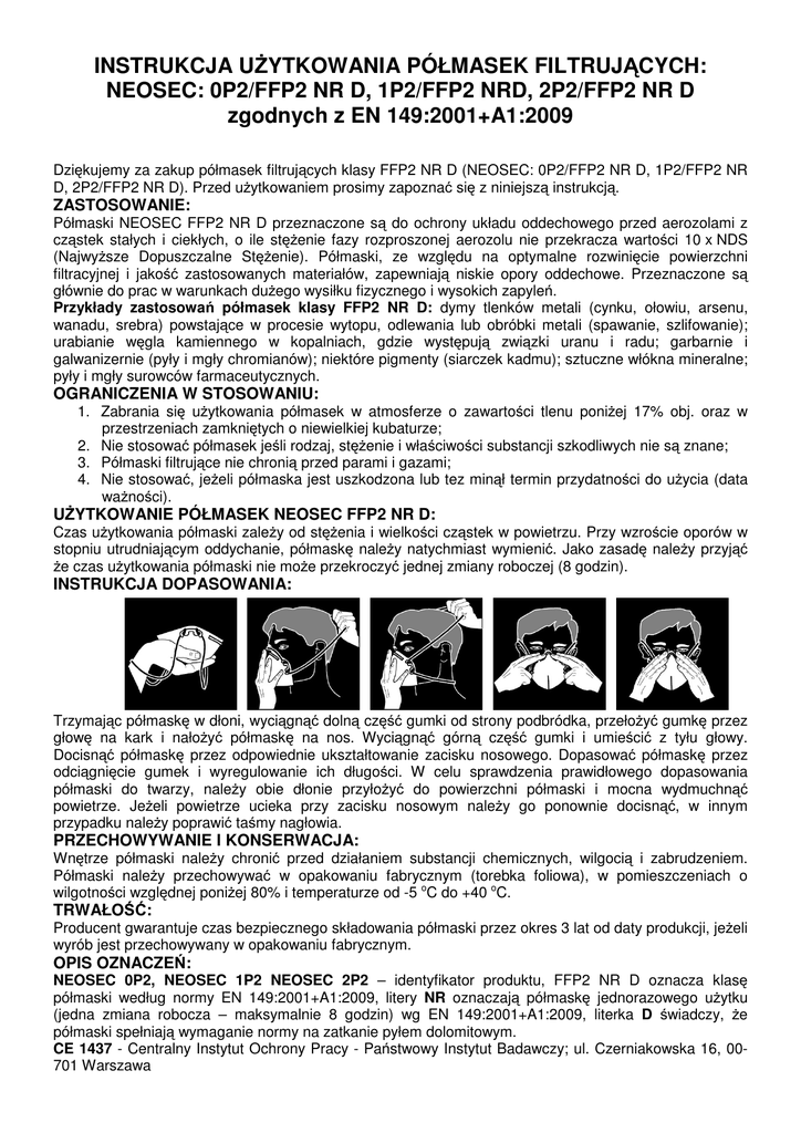 INSTRUKCJA U YTKOWANIA PÓŁMASEK FILTRUJ CYCH: NEOSEC: 0P2/FFP2 NR D, 1P2/FFP2 NRD, 2P2/FFP2 NR D zgodnych z EN 149:2001+A1:2009 Dzi kujemy za zakup półmasek filtruj cych klasy FFP2 NR D (NEOSEC: 0P2/FFP2 NR D, 1P2/FFP2 NR D, 2P2/FFP2 NR D). Przed u ytkowaniem prosimy zapozna si z niniejsz instrukcj . ZASTOSOWANIE: Półmaski NEOSEC FFP2 NR D przeznaczone s do ochrony układu oddechowego przed aerozolami z cz stek stałych i ciekłych, o ile st enie fazy rozproszonej aerozolu nie przekracza warto ci 10 x NDS (Najwy sze Dopuszczalne St enie). Półmaski, ze wzgl du na optymalne rozwini cie powierzchni filtracyjnej i jako zastosowanych materiałów, zapewniaj niskie opory oddechowe. Przeznaczone s głównie do prac w warunkach du ego wysiłku fizycznego i wysokich zapyle . Przykłady zastosowa półmasek klasy FFP2 NR D: dymy tlenków metali (cynku, ołowiu, arsenu, wanadu, srebra) powstaj ce w procesie wytopu, odlewania lub obróbki metali (spawanie, szlifowanie); urabianie w gla kamiennego w kopalniach, gdzie wyst puj zwi zki uranu i radu; garbarnie i galwanizernie (pyły i mgły chromianów); niektóre pigmenty (siarczek kadmu); sztuczne włókna mineralne; pyły i mgły surowców farmaceutycznych. OGRANICZENIA W STOSOWANIU: 1. Zabrania si u ytkowania półmasek w atmosferze o zawarto ci tlenu poni ej 17% obj. oraz w przestrzeniach zamkni tych o niewielkiej kubaturze; 2. Nie stosowa półmasek je li rodzaj, st enie i wła ciwo ci substancji szkodliwych nie s znane; 3. Półmaski filtruj ce nie chroni przed parami i gazami; 4. Nie stosowa , je eli półmaska jest uszkodzona lub tez min ł termin przydatno ci do u ycia (data wa no ci). U YTKOWANIE PÓŁMASEK NEOSEC FFP2 NR D: Czas u ytkowania półmaski zale y od st enia i wielko ci cz stek w powietrzu. Przy wzro cie oporów w stopniu utrudniaj cym oddychanie, półmask nale y natychmiast wymieni . Jako zasad nale y przyj e czas u ytkowania półmaski nie mo e przekroczy jednej zmiany roboczej (8 godzin). INSTRUKCJA DOPASOWANIA: Trzymaj c półmask w dłoni, wyci gn doln cz gumki od strony podbródka, przeło y gumk przez głow na kark i nało y półmask na nos. Wyci gn górn cz gumki i umie ci z tyłu głowy. Docisn półmask przez odpowiednie ukształtowanie zacisku nosowego. Dopasowa półmask przez odci gni cie gumek i wyregulowanie ich długo ci. W celu sprawdzenia prawidłowego dopasowania półmaski do twarzy, nale y obie dłonie przyło y do powierzchni półmaski i mocna wydmuchn powietrze. Je eli powietrze ucieka przy zacisku nosowym nale y go ponownie docisn , w innym przypadku nale y poprawi ta my nagłowia. PRZECHOWYWANIE I KONSERWACJA: Wn trze półmaski nale y chroni przed działaniem substancji chemicznych, wilgoci i zabrudzeniem. Półmaski nale y przechowywa w opakowaniu fabrycznym (torebka foliowa), w pomieszczeniach o wilgotno ci wzgl dnej poni ej 80% i temperaturze od -5 oC do +40 oC. TRWAŁO : Producent gwarantuje czas bezpiecznego składowania półmaski przez okres 3 lat od daty produkcji, je eli wyrób jest przechowywany w opakowaniu fabrycznym. OPIS OZNACZE : NEOSEC 0P2, NEOSEC 1P2 NEOSEC 2P2 – identyfikator produktu, FFP2 NR D oznacza klas półmaski według normy EN 149:2001+A1:2009, litery NR oznaczaj półmask jednorazowego u ytku (jedna zmiana robocza – maksymalnie 8 godzin) wg EN 149:2001+A1:2009, literka D wiadczy, e półmaski spełniaj wymaganie normy na zatkanie pyłem dolomitowym. CE 1437 - Centralny Instytut Ochrony Pracy - Pa stwowy Instytut Badawczy; ul. Czerniakowska 16, 00701 Warszawa