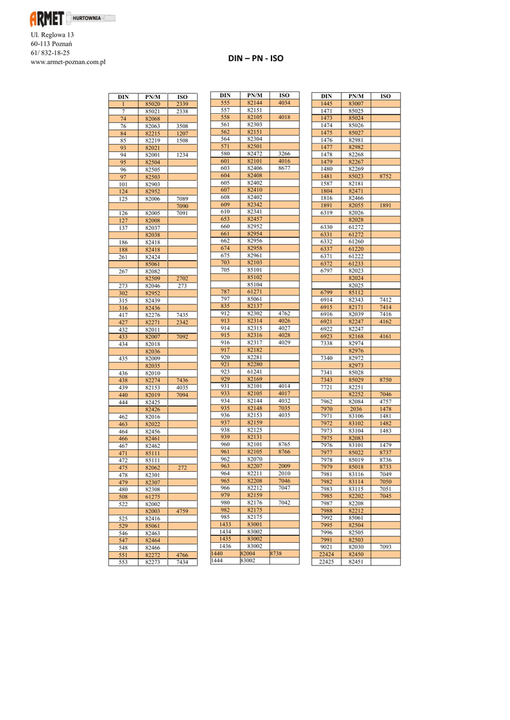Ul. Reglowa 13 60-113 Poznań 61/ 832-18-25 www.armet-poznan.com.pl DIN – PN - ISO DIN 1 7 74 76 84 85 93 94 95 96 97 101 124 125 PN/M 85020 85021 82068 82063 82215 82219 82021 82001 82504 82505 82503 82903 82952 82006 126 127 137 82005 82008 82037 82038 82418 82418 82424 85061 82082 82509 82046 82952 82439 82436 82276 82271 82011 82007 82018 82036 82009 82035 82010 82274 82153 82019 82425 82426 82016 82022 82456 82461 82462 85111 85111 82062 82301 82307 82308 61275 82002 82003 82416 85061 82463 82464 82466 82272 82273 186 188 261 267 273 302 315 316 417 427 432 433 434 435 436 438 439 440 444 462 463 464 466 467 471 472 475 478 479 480 508 522 525 529 546 547 548 551 553 ISO 2339 2338 3508 1207 1508 1234 7089 7090 7091 DIN 555 557 558 561 562 564 571 580 601 603 604 605 607 608 609 610 653 660 661 662 674 675 703 705 2702 273 7435 2342 7092 7436 4035 7094 272 4759 4766 7434 787 797 835 912 913 914 915 916 917 920 921 923 929 931 933 934 935 936 937 938 939 960 961 962 963 964 965 966 979 980 982 985 1433 1434 1435 1436 1440 1444 PN/M 82144 82151 82105 82303 82151 82304 82501 82472 82101 82406 82408 82402 82410 82402 82342 82341 82457 82952 82954 82956 82958 82961 82103 85101 85102 85104 61271 85061 82137 82302 82314 82315 82316 82317 82182 82281 82280 61241 82169 82101 82105 82144 82148 82153 82159 82125 82131 82101 82105 82070 82207 82211 82208 82212 82159 82176 82175 82175 83001 83002 83002 83002 82004 83002 ISO 4034 4018 3266 4016 8677 DIN 1445 1471 1473 1474 1475 1476 1477 1478 1479 1480 1481 1587 1804 1816 1891 6319 6330 6331 6332 6337 6371 6372 6797 4762 4026 4027 4028 4029 6799 6914 6915 6916 6921 6922 6923 7338 7340 4014 4017 4032 7035 4035 8765 8766 2009 2010 7046 7047 7042 8738 7341 7343 7721 7962 7970 7971 7972 7973 7975 7976 7977 7978 7979 7981 7982 7983 7985 7987 7988 7992 7995 7996 7991 9021 22424 22425 PN/M 83007 85025 85024 85026 85027 82981 82982 82268 82267 82269 85023 82181 82471 82466 82055 82026 82028 61272 61272 61260 61220 61222 61233 82023 82024 82025 85112 82343 82171 82039 82247 82247 82168 82974 82976 82972 82973 85028 85029 82251 82252 82084 2036 83106 83102 83104 82083 83101 85022 85019 85018 83116 83114 83115 82202 82208 82212 85061 82504 82505 82503 82030 82450 82451 ISO 8752 1891 7412 7414 7416 4162 4161 8750 7046 4757 1478 1481 1482 1483 1479 8737 8736 8733 7049 7050 7051 7045 7093
