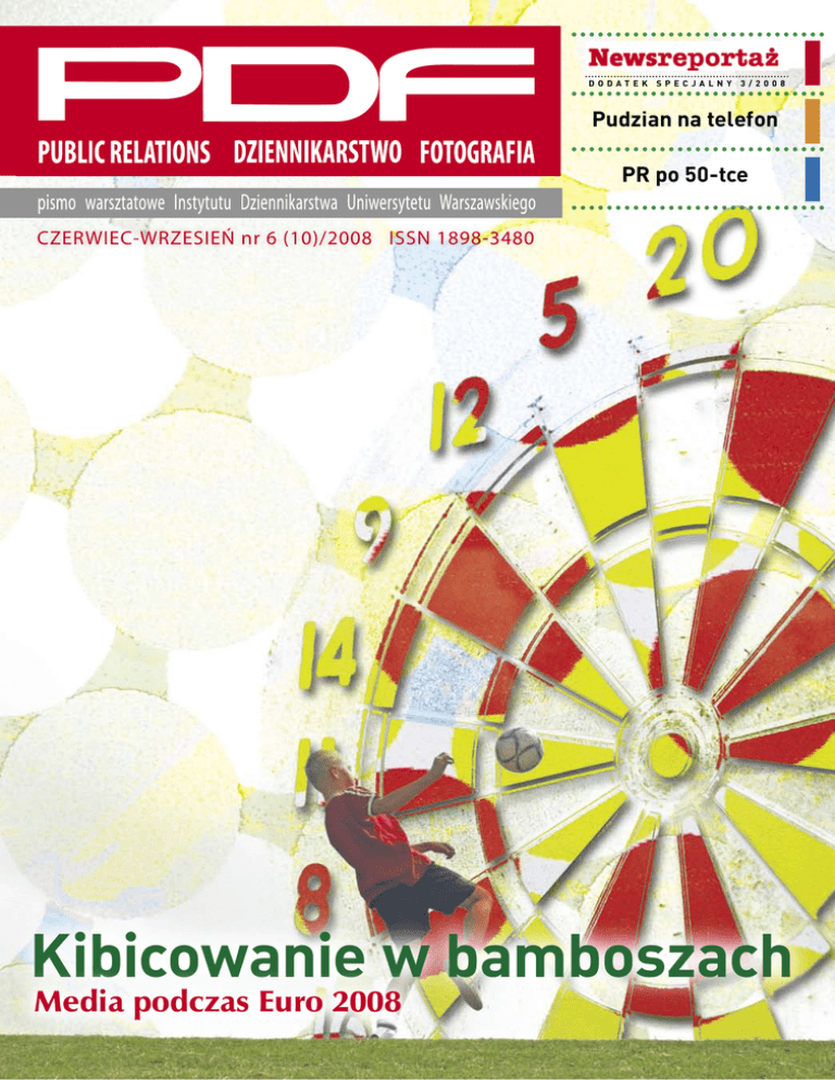 DODATEK SPECJALNY 3/2008 Pudzian na telefon PR po 50-tce CZERWIEC-WRZESIEŃ nr 6 (10)/2008 ISSN 1898-3480 Kibicowanie w bamboszach Media podczas Euro 2008 Przepis na wst´p Gdzie si´ zaczàłem ROZBIEGÓWK A ROZBIEGÓWK A redaktor naczelny: Paweł H. Olek redaktorzy: Alicja Bobrowicz, Magdalena Karst, Anita Kowalska zespół redakcyjny: Emil Borzechowski, Tomasz Betka, Jan Dąbkowski, Małgorzata Flejter, Agnieszka Juskowiak, Marcin Łączyński, Paweł Łysakiewicz, Alicja Matyja, Magdalena Mikulska, Joanna Maria Sawicka, Elżbieta Stryjek, Julian Tomala, Agnieszka Wójcińska, Wioletta Wysocka współpraca: Jan Brykczyński, Tomasz Borowski, Łukasz Cwojdziński, Urszula Ginalska, Kasper Grubba, Marzena Indra, Tomasz Jelski, Patrycja Mic, Maciej Pisuk, Maria I. Szulc, Łukasz Świecki, Bartosz Zaborowski rowe dodatki tematyczne, zespół redakcyjny składający się z najlepszych podkupionych dziennikarzy (np. Anna Marszałek, która niespecjalnie tropi afery po zmianie pracodawcy), walka cenowa (1,5 zł za egz.), atrakcyjna oferta dla reklamodawców. Minęły dwa lata i... hegemonia „Gazety Wyborczej” trwa w najlepsze. Choć największy dziennik opiniotwórczy kraju jest już passe (ale to za sprawą mocnego zaangażowania politycznego w walce z PiS, a nie działań konkurenta), nadal nadaje ton ogólnopolskiej dyskusji (chociażby ostatnia sprawa ciąży 14-letniej Aga- projekt graficzny i skład DTP: Karol Grzywaczewski / somato.blox.pl korekta: Joanna Maria Sawicka WYDAWCA: Instytut Dziennikarstwa Uniwersytetu Warszawskiego koordynator wydawcy: Grażyna Oblas druk: Agora, nakład: 10 tys. egz. adres redakcji: PDF pismo warsztatowe Instytutu Dziennikarstwa UW ul. Nowy Świat 69, pok. 51 (IV piętro), 00-046 Warszawa, tel. 022 5520293, e-mail: [email protected] więcej tekstów w portalu internetowym: www.redakcja24.pl Następny numer ukaże się 29 września 2008 roku R EK L A M A 02 Wyjechałem na studia do Rzeszowa, prowadziłem imprezy jako DJ i namiętnie grałem w brydża. Przez przypadek trafiłem do studenckiego radia – ktoś nie przyszedł na audycję i jeden z kolegów zaproponował, żebym go zastąpił. Już nie chciałem odejść. Ktoś kiedyś powiedział, co może jest stwierdzeniem banalnym, ale bardzo prawdziwym, że radio to teatr wyobraźni. I rzeczywiście, wszystko to, co jest okryte tajemnicą, bardziej przyciąga, pociąga i fascynuje. I tak jest z radiem. Rozstałem się z radiem na chwilę, celem odbycia dwuletniej służby wojskowej, a potem pojechałem na studia do Lublina i trafiłem do studenckiego „Radia Centrum”. To właśnie w Lublinie, w studenckim klubie „Chatka Żaka”, poznałem zespół Dżem i Ryśka Riedla. To spotkanie miało dla mnie poważne konsekwencje, bo zakolegowałem się z Ryśkiem. A potem widziałem, jak umierał. Zobaczyłem, że życie idola ma drugie, mroczne oblicze. stały felieton: Maciej Parowski, Andrzej Zygmuntowicz dyżury redakcyjne: wtorek, środa, czwartek 14:00-18:00 Kolegia: każda środa godz. 19:00 Dziennikar zem zostałem przez przypadek, ale nie przez przypadek znalazłem się w muzyce. W dzieciństwie uczyłem się gry na skrzypcach, potem śpiewałem w chórze prowadzonym przez Stanisława Steczkowskiego. Mój pierwszy kontakt z muzyką to był kontakt z muzyką poważną. Pewnego dnia zobaczyłem w telewizji koncert Diuka Ellingtona. Na tym koncercie wystąpili także Ray Charles, Areta Franik, Roberta Flack. Wbiło mnie w fotel i od razu poczułem, że to jest moja muzyka. R EK L A M A rys. Maria I. Szulc REDAKCJA Nie możesz stworzyć swojej silnej marki, to podkup tę konkurencyjną. Fiaskiem okazała się próba stworzenia serwisu społecznościowego Google Video, który miał być przeciwwagą dla Youtube. Internauci nowej funkcjnalności google nie dostrzegli, więc firma przejęła rywala. Podobną strategię przyjął koncern Axel Springer Polska. Dwa lata temu uruchomił polską wersję „Die Welt” - niemieckiego dziennika dla intelektualistów. Miał być alternatywą dla „Gazety Wyborczej”. Początki jak zawsze w takim projekcie - ambitne. Dotowane, kolo- gotówkę postanowił przeznaczyć na wrogie przejęcie największego konkurenta. Od kilkunastu tygodni za pośrednictwem BZ WBK skupuje akcje Agory (wydawcy „Gazety Wyborczej”). W krótkim czasie stał się największym mniejszościowym udziałowcem, mając około 20 proc. akcji. Chce mieć wpływ na losy spółki, domaga się przedstawiciela w Radzie Nadzorczej oraz zmiany statutu spółki. Co dalej? Zapowiada się krótszy żywot „Dziennika” niż projektu „Polska. The Times”. I tak powstanie „Dziennik wyborczy”. Nowe pismo po połączeniu „Gazety Wyborczej” i „Dziennika”. Paweł H. Olek redaktor naczelny Scenariusz: Uuulala Dziennik wyborczy ty). Tymczasem „Dziennik” zanotował blisko 40 proc. sprzedaż nakładu (do 140 tys. egz., większość dodatków zlikwidował, zwolnił w ostatnim czasie 50 dziennikarzy, podwyższył cenę egzemplarzową pisma, mocno odchudził dwa z trzech dodatków - „kultura” i „program tv”, nie podejmuje żadnych działań marketingowych na szeroką skalę (po co ładować pieniądze w coś, co i tak zaraz zniknie z rynku?). Więc „Dziennik” opiniotwórczo skręca w lewo, zrywając z wizerunkiem pisma dla konserwatystów (lewicujący Cezary Michalski zostaje z-cą naczelnego, pojawiają się strony dla ekologów), stając się wersją light „GW”. Jednocześnie Axel Springer Polska po fiasku negocjacji o kupnie Polsatu, zgromadzoną Jako pracownik studenckiego radia pojechałem na wakacyjną praktykę do radiowej Trójki. To było spełnienie marzeń. Poznałem wspaniałych dziennikarzy muzycznych: Jana Chojnackiego, Grzesia Wasowskiego, Janusza Kosę-Kosińskiego. Pamiętam, jak któregoś popołudnia do pokoju, w którym urzędowałem, zajrzał Wojciech Mann i zapytał: „To ty jesteś ten młody, zdolny? Czy mógłbyś wybrać muzykę do mojego jutrzejsz