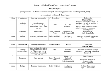 Szkolny wieloletni (2016/2017 – 2018/2019) zestaw bezpłatnych podręczników i materiałów ćwiczeniowych obowiązujący od roku szkolnego 2016/2017 we wszystkich oddziałach danej klasy. Klasa Przedmiot Nazwa podręcznika Edukacja wczesnoszkolna Nasz elementarz. Podręcznik do szkoły podstawowej. Klasa I. część 1; 2; 3; 4 J. angielski płatny Klasa Autor Ćwiczenia Nazwa/Autor „Ćwiczenia z pomysłem” WSiP 4 cz. Brzózka J., Harmak K., Izbińska K., Jasiocha A., Went W. „Piszę” 2 części Bredek-Morawska J. „Liczę” Brzózka J., Jasiocha A. Super Sparks 1 Szpotowicz M., Szulc-Kurpaska M. MEN Lorek M. Wollman L. Super Sparks 1 Oxford University Press Szpotowicz M., Szulc-Kurpaska M. Religia Jesteśmy w rodzinie Pana Jezusa Święty Wojciech red. Szpet J. Jackowiak D. Jesteśmy w rodzinie Pana Jezusa Szpet J., Jackowiak D. Przedmiot Nazwa podręcznika Wydawnictwo Autor Ćwiczenia Nazwa/Autor MEN Lorek M. Zatorska M. „Ćwiczenia z pomysłem” 4 części Filipowicz J., Harmak K., Izbińska K., Fuszara M. Davies P. A, Graham C. Szpotowicz M., Szulc-Kurpaska M. Super Sparks 2 I Edukacja wczesnoszkolna II płatny Wydawnictwo Nasza szkoła. Podręcznik do szkoły podstawowej. Klasa II. Część 1A; 1B; 2; 3; 4 Nasza szkoła. Matematyka. Część 1; 2; 3; 4 J. angielski Super Sparks 2 Oxford University Press Religia Kochamy Pana Jezusa Święty Wojciech red. Szpet J. Jackowiak D. Davies P.A., Lambert V. Szpotowicz M., Szulc-Kurpaska M. Kochamy Pana Jezusa Szpet J., Jackowiak D. Klasa Przedmiot Nazwa podręcznika Ed. wczesnoszkolna Nasza Szkoła. Podręcznik do szkoły podstawowej. Klasa III. Cześć 1A; 1B; 2; 3A; 3B; 4 Nasza szkoła. Matematyka. Część 1; 2; 3; 4 J. angielski Super Sparks 3 Oxford University Press Religia Przyjmujemy Pana Jezusa Święty Wojciech III płatny Wydawnictwo Autor MEN Lorek M. Zatorska M. Ćwiczenia Nazwa/Autor „Moje ćwiczenia” 4 części Dulemba E., Faliszewska J., Lech G., Opala A., Parlicka I., Ziewiecka A. Davies P.A. Graham C. Szpotowicz M., Szulc-Kurpaska M. Super Sparks 3 red. Szpet J. Jackowiak D. Przyjmujemy Pana Jezusa red. Szpet J. Jackowiak D. Davies P.A.; Lambert V. Szkolny wieloletni (2016/2017 – 2018/2019) zestaw bezpłatnych podręczników i materiałów ćwiczeniowych obowiązujący od roku szkolnego 2016/2017 we wszystkich oddziałach danej klasy. Klasa Przedmiot J. polski J. angielski Historia i społeczeństwo Przyroda IV Matematyka Zajęcia techniczne Zajęcia komputerowe płatny Nazwa podręcznika Wydawnictwo Autor Ćwiczenia Nazwa / Autor Teraz polski Nowa Era Klimowicz A. Steps Forward 1 Oxford University Press Teraz polski Klimowicz A., Brząkalik K. Step Forward 1 (wersja Wczoraj i dziś Nowa Era Tajemnice przyrody Nowa Era Matematyka z plusem Gdańskie Wydawnictwo Oświatowe Karta rowerowa. Zajęcia techniczne w klasach IV-VI szkoły podstawowej Zajęcia komputerowe Falla T., Davies P.A. Shipton P., Wheeldon S., Palczak E., Szpotowicz M. Wojciechowski G. Marko-Worłowska M., Szlajfer F. Stawarz J. Dobrowolska M. Zarzycki P. Jucewicz M. podstawowa) Falla T., Davies P.A., Wheeldon S. Wczoraj i dziś Maćkowski T. Tajemnice przyrody cz. I, cz. II; Golonko I., Moździerz U., Stawarz J. Wersja B – 2 zeszyty ćw. Stan Pol Stanecka B. Stanecki Cz. Podręcznik z ćwiczeniami Operon Dulian J. NIE Muzyka Lekcja muzyki Nowa Era Gromek M. Kilbach G. NIE Plastyka Do dzieła Nowa Era NIE J. niemiecki Wir smart Lektor Klett Jestem chrześcijaninem Święty Wojciech Lukas J. Onak K. Motta G; Kania B; Książek-Kempa E. Wieszczeczyńska E; Kubicka A. red. Szpet J. Jackowiak D. Religia Wir smart Motta G., Kania B. Jestem chrześcijaninem Szpet J., Jackowiak D. Szkolny wieloletni (2016/2017 – 2018/2019) zestaw bezpłatnych podręczników i materiałów ćwiczeniowych obowiązujący od roku szkolnego 2016/2017 we wszystkich oddziałach danej klasy. Klasa Przedmiot J. polski J. angielski Historia i społeczeństwo Przyroda V płatny Nazwa podręcznika Wydawnictwo Autor Ćwiczenia Nazwa / Autor Teraz polski Nowa Era Klimowicz A. Steps Forward 2 Oxford University Press Falla T., Davies P.A. Shipton P., Wheeldon S., Palczak E., Szpotowicz M. Teraz polski Klimowicz A., Brząkalik K. Step Forward 2 (wersja Wczoraj i dziś Nowa Era Wojciechowski G. Wczoraj i dziś Maćkowiak T. Tajemnice przyrody Nowa Era Ślósarczyk J., Szlajfer F., Kozik R. Tajemnice przyrody Golanko I., Moździerz U., Marszał D. (2 zeszyty) podstawowa) Falla T., Davies P.A., Wheeldon S.; Shipton P. Matematyka Nowa Matematyka z plusem Gdańskie Wydawnictwo Oświatowe Dobrowolska M. Zarzycki P. Jucewicz M., Karpiński M. Wersja B – 2 zeszyty ćwiczeń Zajęcia techniczne Zajęcia Techniczne. Podręcznik, część 1 Agencja Wydawnicza Stan Pol Stanecka B. Stanecki Cz. Zajęcia Techniczne Stanecka B. Stanecki Cz. Zajęcia komputerowe Zajęcia komputerowe Operon Dulian J. NIE Muzyka Lekcja Muzyki Nowa Era Gromek M. Kilbach G. NIE Plastyka Do dzieła Nowa Era NIE Wir smart 2 Lektor Klett Lukas J. Onak K. Motta G; Kania B; Książek-Kempa E. Wieszczeczyńska E; Kubicka A. Wierzę w Boga Święty Wojciech J. niemiecki Religia red. Szpet J. Jackowiak D. Wir smart Motta G., Kania B. Wierzę w Boga red. Szpet J. Jackowiak D. Dopuszczam do użytku szkolnego zestaw podręczników dla klasy VI a; b od roku szkolnego 2016/2017 Klasa VI Przedmiot Nazwa podręcznika Wydawnictwo Autor Nr ewidencyjny w wykazie Język polski Teraz polski ! Podręcznik + zeszyt ćwiczeń Nowa Era Klimowicz A. 538/3/2014 Historia i społ. Wczoraj i dziś. Podręcznik. + zeszyt ćwiczeń I gra muzyka. Podręcznik dla Muzyka klas IV-VI szkoły podstawowej + zeszyt ćwiczeń Do dzieła! Podręcznik do Plastyka plastyki dla klas IV-VI szkoły podstawowej Nowa Era Wojciechowski G. 443/3/2014 Nowa Era Gromek M. Kilbach G. 569/2012 Nowa Era Lukas J. Onak K. 326/2011 Język angielski Steps in English 3 + zeszyt ćwiczeń Oxford University Press Język niemiecki Punkt. Język niemiecki. Podręcznik z ć