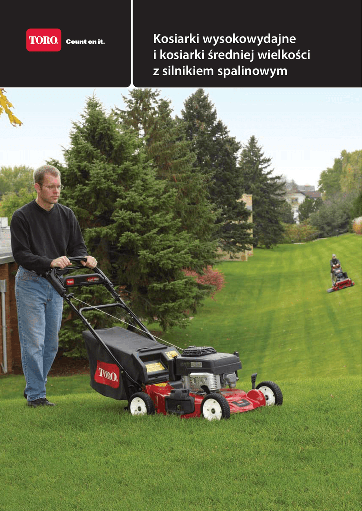 Kosiarki wysokowydajne i kosiarki średniej wielkości z silnikiem spalinowym Wysokowydajne kosiarki z silnikiem spalinowym HD53 53 cm 3 w 1 NOWOŚĆ! Niewiarygodne połączenie wysokiej wydajności, jakości i przystępnej ceny. Prezentowana kosiarka typu lekkiego, o szerokości 53 cm, doskonale nadaje się do precyzyjnego koszenia i przycinania. • Automatyczny układ napędowy ADS PRO – w pełni automatyczny układ kontroli prędkości, który dostosowuje prędkość do zmieniających się warunków w terenie. Maksymalna prędkość kosiarki w terenie wynosi 6,4 km/h Automatyczny układ napędowy ADS PRO • Profesjonalne koła – Koła ze stali technicznej z łożyskami kulkowymi i wytrzymałymi półpneumatycznymi radialnymi oponami gumowymi 20 cm x 5 cm Profesjonalne koła • Silnik o dużej mocy – Napęd pochodzi z mocnego i niezawodnego silnika Kawasaki® FJ180V. Konstrukcja jednostki tnącej 3 w 1 Mocny silnik • Konstrukcja jednostki tnącej 3 w 1 – funkcja rozdrabniania, wyrzut trawy z boku kosiarki lub ładowanie ścinek trawy do worka. W wyposażeniu standardowym kosiarki znajduje się boczny kanał wyrzutowy, zaślepka do zestawu rozdrabniającego oraz worek do trawy. • Wysokowydajna jednostka tnąca – Odporna na rdzę jednostka tnąca wykonana z aluminium Wysokowydajna jednostka tnąca Jednostka tnąca z zestawem Recycler • Technologia rozdrabniania Recycler® – Opatentowana przez Toro technologia rozdrabniania za pomocą Recyclera zyskała sobie miano najlepszej na rynku, zapewniając znaczne skrócenie czasu koszenia w porównaniu z funkcją ładowania do worka. HD53 53 cm 3 w 1 SPECYFIKACJA TECHNICZNA – KOSIARKA HD53 3 w 1 MODEL 22164TE - z układem ADS PRO i funkcją Zone Start Silnik Kawasaki, 4-suwowy, 6,0 KM (4,5kW) Układ napędowy Układ ADS PRO z płynną regulacją prędkości, napęd na tylne koła, prędkość w zakresie od 0-6,4 km/h Szerokość cięcia 53 cm Rozrusznik mechaniczny (linkowy) Układ smarowania Pełnociśnieniowy układ smarowania Obecność operatora funkcja Zone Start (ZS) Filtr powietrza filtr z podwójnym wkładem Pojemność worka 65 litrów Wysokość cięcia 32 mm – 108 mm Pojemność zbiornika paliwa 2 litry Waga 44 kg Certyfikaty CE i EPA Wysokowydajne kosiarki z silnikiem spalinowym 53 cm Recycler® Specjaliści od pielęgnacji zieleni wybierają kosiarki z funkcją recyklingu i workowania. Kosiarki Toro® Recycler 53 cm są trwałe i niezawodne oraz charakteryzują się wysoką wydajnością, na której profesjonaliści mogą polegać. Wysokowydajne kosiarki z silnikiem spalinowym są dostępne z szeregiem dodatkowych funkcji zaspokajających wszystkie potrzeby użytkownika. • Układ sprzęgła z blokadą noża tnącego (BBC) – układ zatrzymuje pracę noża tnącego nawet przy włączonej kosiarce. Funkcja ta umożliwia opróżnianie worka podczas pracy silnika. (jedynie model 22177TE) Układ sprzęgła z blokadą noża tnącego (BBC) • Największy wał korbowy na rynku – Solidny wał korbowy o średnicy 25 mm oraz stalowa osłona wału pełniąca rolę zabezpieczenia przed uderzeniami. Największy wał korbowy • Stalowe koła – Koła zbudowane ze stali technicznej wyposażone w łożyska kulkowe i trwałe półpneumatyczne opony gumowe. • Silnik o dużej mocy – Mocny i niezawodny silnik Kawasaki® FJ180V z wymiennym puszkowym filtrem oleju. Stalowe koła Mocny silnik • Najsolidniejsza jednostka tnąca na rynku – stosunkowo lekka konstrukcja z odlewanego ciśnieniowo aluminium o gr. 6 mm, przystosowana do pracy w trudnych warunkach terenowych i na dużych obszarach. Najbardziej solidna jednostka tnąca Jednostka tnąca z zestawem Recycler • Technologia rozdrabniania Recycler® – Opatentowana przez Toro technologia rozdrabniania za pomocą Recyclera zyskała sobie miano najlepszego systemu na rynku, zapewniając znaczne skrócenie czasu koszenia w porównaniu z funkcją workowania. 53 cm Recycler® SPECYFIKACJA TECHNICZNA – KOSIARKI RECYCLER O SZER. 53 CM MODEL 22176TE - 3-biegowy, z funkcją Zone Start 22177TE - 3-biegowy, z funkcją BBC Silnik Kawasaki®, 4-suwowy, 6,0 KM (4,5 kW) Kawasaki, 4-suwowy, 6,0 KM (4,5kW) Drgania (wibracje) 2,1 m/sec2 wg EN 836 2,8 m/sec2 wg EN 836 Układ napędowy 3-biegowy, napęd na tylne koła, zakres prędkości: 0-6,1 km/h 3-biegowy, napęd na tylne koła, zakres prędkości: 0-6,1 km/h Szerokość cięcia 53 cm 53 cm Rozrusznik mechaniczny (linkowy) mechaniczny (linkowy) Układ smarowania pełnociśnieniowy układ smarowania (z filtrem oleju) pełnociśnieniowy układ smarowania (z filtrem oleju) Obecność operatora funkcja Zone Start (ZS) Sprzęgło z blokadą noża tnącego (BBC) Filtr powietrza filtr z podwójnym wkładem filtr z podwójnym wkładem Pojemność worka 70 litrów 70 litrów Wysokość cięcia 19 mm – 76 mm 19 mm – 76 mm Pojemność zbiornika paliwa 3,8 litra 3,8 litra Waga 52 kg 52 kg Certyfikaty CE i EPA CE i EPA Wysokowydajne kosiarki z silnikiem spalinowym Kosiarka z workiem z serii Hi-Vac Bagger o szer. 53 cm Tam, gdzie konieczne jest załadowanie ścinków trawy wyrzutowym, sprzyjającym dobremu przepływowi do worka (z opcją wyrzutu bocznego), profesjonaliści powietrza i maksymalnemu zasysaniu. Ścinki trawy wybierają wysokowydajne kosiarki Toro® z serii Hi-Vac są sprawnie podawane i gęsto pakowane do dużego, 53 cm, które wyposażone są w funkcję workowania. łatwego w opróżnianiu, worka wykonanego ze specjalnie Kosiarka ta charakteryzuje się wyjątkową, stożkową wzmocnionego materiału. konstrukcją jednostki tnącej z szerokim kanałem • Silnik o dużej mocy – Napęd pochodzący z mocnego i niezawodnego silnika Kawasaki® FJ180V z wymiennym puszkowym filtrem oleju. Mocny silnik • Specjalna konstrukcja zespołu workowania – konstrukcja jednostki tnącej kosiarki z dużym otworem wylotowym z tyłu umożliwia swobodne odprowadzanie ścinek trawy do worka. Tylny otwór wyrzutowy • Układ sprzęgła 