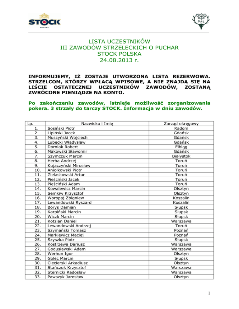LISTA UCZESTNIKÓW III ZAWODÓW STRZELECKICH O PUCHAR STOCK POLSKA 24.08.2013 r. INFORMUJEMY, Iś ZOSTAJE UTWORZONA LISTA REZERWOWA. STRZELCOM, KTÓRZY WPŁACĄ WPISOWE, A NIE ZNAJDĄ SIĘ NA LIŚCIE OSTATECZNEJ UCZESTNIKÓW ZAWODÓW, ZOSTANĄ ZWRÓCONE PIENIĄDZE NA KONTO. Po zakończeniu zawodów, istnieje moŜliwość zorganizowania pokera. 3 strzały do tarczy STOCK. Informacja w dniu zawodów. Lp. 1. 2. 3. 4. 5. 6. 7. 8. 9. 10. 11. 12. 13. 14. 15. 16. 17. 18. 19. 20. 21. 22. 23. 24. 25. 26. 27. 28. 29. 30. 31. 32. 33. Nazwisko i Imię Sosiński Piotr Lipiński Jacek Muszyński Wojciech Lubecki Władysław Dorniak Robert Makowski Sławomir Szymczuk Marcin Herba Andrzej Kujaczyński Mirosław Aniołkowski Piotr Zielaskowski Artur Pieściński Jacek Pieściński Adam Kowalewicz Marcin Semkiw Krzysztof Woropaj Zbigniew Lewandowski Ryszard Borys Damian Karpiński Marcin Wiczk Marcin Kotzian Daniel Lewandowski Andrzej Szymański Tomasz Markiewicz Maciej Szyszka Piotr Kostrzewa Dariusz Godusławski Adam Werhun Igor Golec Marcin Ciecierski Arkadiusz Stańczuk Krzysztof Sternicki Radosław Pawszyk Jarosław Zarząd okręgowy Radom Gdańsk Gdańsk Gdańsk Elbląg Gdańsk Białystok Toruń Toruń Toruń Toruń Toruń Toruń Olsztyn Olsztyn Koszalin Koszalin Słupsk Słupsk Słupsk Warszawa Toruń Poznań Poznań Słupsk Warszawa Warszawa Olsztyn Słupsk Olsztyn Warszawa Warszawa Olsztyn 1 34. 35. 36. 37. 38. 39. 40. 41. 42. 43. 44. 45. 46. 47. 48. 49. 50. 51. 52. 53. 54. 55. 56. 57. 58. 59. 60. 61. 62. 63. 64. 65. 66. 67. 68. 69. 70. 71. 72. 73. 74. 75. 76. 77. 78. 79. 80. 81. 82. 83. 84. 85. 86. Sarnowski Marcin Skibiak Dariusz Kapuściński Rafał Smoliński Piotr Stosik Robert Olkowski Marek Olkowski Marcel Szewczyk Robert Kurzyński Adam Łakomy Wojciech Łakomy Jakub Szczypka Hubert Pilc Marek Kramer Tadeusz Skibiak Rafał Burnos Kamil Goerick Marek Onopiak Ryszard Szczęch Krzysztof Urban Wojciech Skonieczny Jarosław Biernat Stanisław Sztuczka Janusz Przeorek Jerzy Szramka Michał Witczyk Rafał Hajczuk Wiesław Henning Rafał Marięga Sławomir Karpiński Piotr Karpiński Krzysztof Kufel Mirosław Bialic Juliusz Radziewicz Daniel Wojciechowski Sławomir Kaszewski Andrzej Ziółkowski Wojciech Piotrowski Grzegorz Jędrzejewski Waldemar Prill Tomasz Golec Mariusz Szwamber Jerzy Dutkiewicz Władysław Kociubian Marek Niedziałek Kamil Gromacki Krzysztof Niemiec Piotr Kruziński Karol Piekarec Marcin Weiler Marian Jakubowski Zbigniew Bobkowski Leszek Perskiewicz Tadeusz Elbląg Elbląg Elbląg Elbląg Elbląg Elbląg Elbląg Elbląg Elbląg Olsztyn Olsztyn Płock Poznań Poznań Elbląg Elbląg Elbląg Elbląg Tarnobrzeg Poznań Płock Gorzów Słupsk Ciechanów Gdańsk Piła Ciechanów Słupsk Ciechanów Toruń Toruń Toruń Gorzów Wlk. Zielona Góra Płock Płock Szczecin Płock Ciechanów Elbląg Słupsk Elbląg Szczecin Szczecin Wrocław Olsztyn Elbląg Elbląg Elbląg Szczecin Szczecin Bydgoszcz Koszalin 2 87. 88. 89. 90. 91. 92. 93. 94. 95. 96. 97. 98. 99. 100. 101. 102. 103. 104. 105. 106. 107. 108. 109. 110. 111. 112. 113. 114. 115. 116. 117. 118. 119. 120. Lubowicki Andrzej Pietrzak Robert Pankowski Marcin Kmieć Tomasz Rachwał Marcin Kmieć Krystian Stopczyński Andrzej Kołodziński Jacek Runowski Hubert Kiszkurno Stefan Kaiser Waldemar Winkowski Leszek Jóźwiak Zbigniew Wit Adam Kasperek Adam Zygowski Paweł Kiszkurno Hubert Skorobogaty Tadeusz Pulikowski Eugeniusz Turczyn Paweł Bałdyga Grzegorz Cichy Dariusz Mierzejewski Jacek Kurzyński Andrzej Mizerski Maciej Gaweł Patrycjusz Grzybowski Rafał Ostrowski Waldemar Tuszkowski Ryszard Madej Jakub Zawadzki Krzysztof Rubiś Mariusz rezerwacja rezerwacja ŁomŜa Płock Płock Szczecin Szczecin Szczecin Warszawa Gorzów Poznań Warszawa Poznań Poznań Poznań Poznań Poznań Bydgoszcz Warszawa Gorzów Gorzów Ostrołęka Olsztyn Olsztyn Olsztyn Elbląg Lublin Rzeszów Olsztyn Olsztyn Suwałki Radom Radom Kraków LISTA REZERWOWA 1. 2. 3. 4. 5. 6. 7. 8. 9. 10. 11. Niczyporuk Leszek Niczyporuk Michał Gdańsk Gdańsk 3