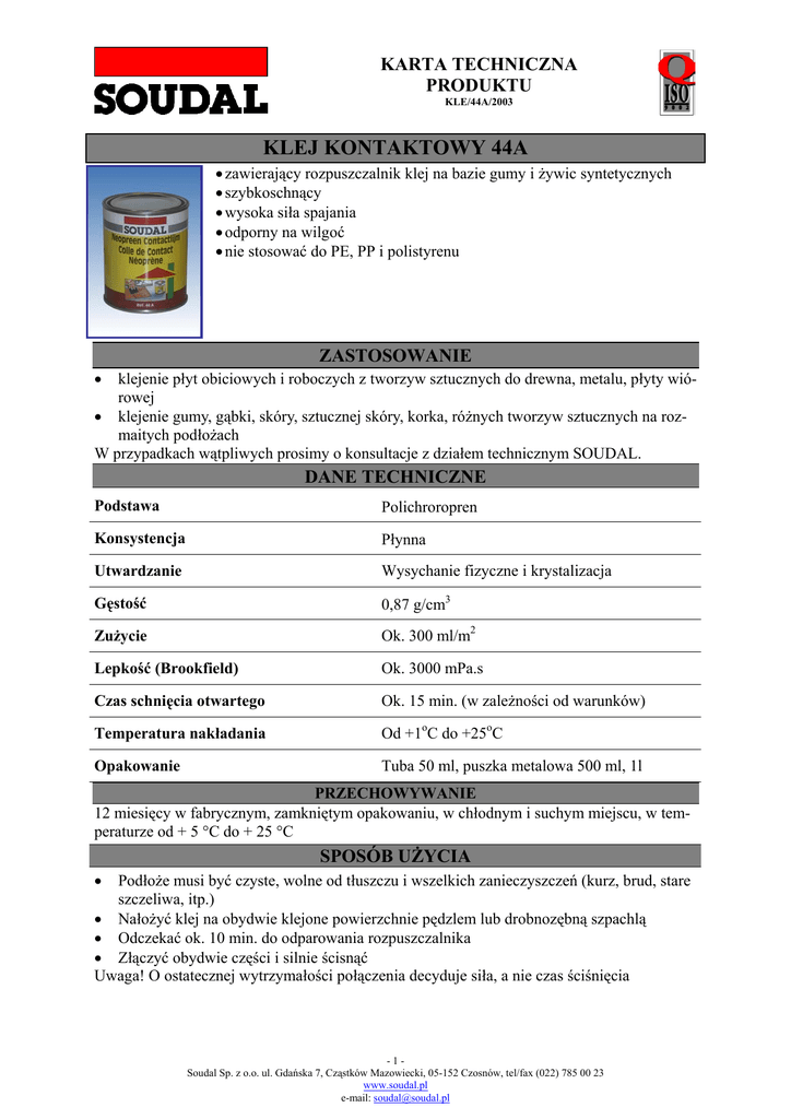 KARTA TECHNICZNA PRODUKTU KLE/44A/2003 KLEJ KONTAKTOWY 44A • zawierający rozpuszczalnik klej na bazie gumy i żywic syntetycznych • szybkoschnący • wysoka siła spajania • odporny na wilgoć • nie stosować do PE, PP i polistyrenu ZASTOSOWANIE • klejenie płyt obiciowych i roboczych z tworzyw sztucznych do drewna, metalu, płyty wiórowej • klejenie gumy, gąbki, skóry, sztucznej skóry, korka, różnych tworzyw sztucznych na rozmaitych podłożach W przypadkach wątpliwych prosimy o konsultacje z działem technicznym SOUDAL. DANE TECHNICZNE Podstawa Polichroropren Konsystencja Płynna Utwardzanie Wysychanie fizyczne i krystalizacja Gęstość 0,87 g/cm3 Zużycie Ok. 300 ml/m2 Lepkość (Brookfield) Ok. 3000 mPa.s Czas schnięcia otwartego Ok. 15 min. (w zależności od warunków) Temperatura nakładania Od +1oC do +25oC Opakowanie Tuba 50 ml, puszka metalowa 500 ml, 1l PRZECHOWYWANIE 12 miesięcy w fabrycznym, zamkniętym opakowaniu, w chłodnym i suchym miejscu, w temperaturze od + 5 °C do + 25 °C SPOSÓB UŻYCIA • Podłoże musi być czyste, wolne od tłuszczu i wszelkich zanieczyszczeń (kurz, brud, stare szczeliwa, itp.) • Nałożyć klej na obydwie klejone powierzchnie pędzlem lub drobnozębną szpachlą • Odczekać ok. 10 min. do odparowania rozpuszczalnika • Złączyć obydwie części i silnie ścisnąć Uwaga! O ostatecznej wytrzymałości połączenia decyduje siła, a nie czas ściśnięcia -1Soudal Sp. z o.o. ul. Gdańska 7, Cząstków Mazowiecki, 05-152 Czosnów, tel/fax (022) 785 00 23 www.soudal.pl e-mail: [email protected] NORMY I CERTYFIKATY Produkt wytwarzany przez firmę SOUDAL NV w Turnhout w Belgii, zgodnie z wymogami jakościowymi normy ISO 9002. Posiada następujące dopuszczenia do obrotu: Atest PZH – HK/B/0354/01/2000 ZALECENIA BHP Przy użyciu kleju kontaktowego 44A przestrzegać zwykłych zasad higieny pracy, a w szczególności: • unikać kontaktu ze skórą • w przypadku kontaktu ze skórą przemyć natychmiast wodą • może wywoływać podrażnienia oczu • chronić przed dziećmi • w czasie pracy dobrze wietrzyć pomieszczenie • nie palić • przy braku odpowiedniej wentylacji wskazane jest zabezpieczenie dróg oddechowych Uwaga: Wskazówki zawarte w tym dokumencie są wynikami naszych doświadczeń i praktyki. Ze względu na różnorodność materiałów i podłoży oraz wielorakość możliwych zastosowań, które pozostają poza naszą kontrolą, nie możemy przyjmować jakiejkolwiek odpowiedzialności za otrzymane rezultaty. We wszystkich przypadkach zaleca się przeprowadzenie próby. -2Soudal Sp. z o.o. ul. Gdańska 7, Cząstków Mazowiecki, 05-152 Czosnów, tel/fax (022) 785 00 23 www.soudal.pl e-mail: [email protected]