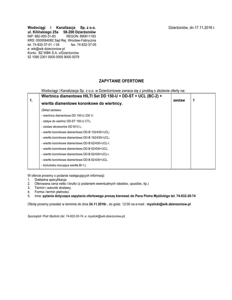Dzierżoniów, dn.17.11.2016 r. Wodociągi i Kanalizacja Sp. z o.o. ul. Kilińskiego 25a 58-200 Dzierżoniów NIP: 882-000-31-83 REGON: 890611183 KRS: 0000064082 Sąd Rej. Wrocław-Fabryczna tel. 74-832-37-01 ÷ 04 fax. 74-832-37-05 e: [email protected] Konto: BZ WBK S.A. o/Dzierżoniów 52 1090 2301 0000 0005 9000 0079 ZAPYTANIE OFERTOWE Wodociągi i Kanalizacja Sp. z o.o. w Dzierżoniowie zwraca się z prośbą o złożenie oferty na: Wiertnica diamentowa HILTI Set DD 150-U + DD-ST + UCL (BC-2) + 1. wiertła diamentowe koronkowe do wiertnicy. zestaw 1 (Skład zestawu: - wiertnica diamentowa DD 150-U 230 V; - statyw do wiertnic DD-ST 150-U CTL; - zestaw akcesoriów DD M12 L; - wiertło koronkowe diamentowe DD-B 102/430+UCL; - wiertło koronkowe diamentowe DD-B 162/430+UCL; - wiertło koronkowe diamentowe DD-B 62/430+UCL+; - wiertło koronkowe diamentowe DD-B 62/430+UCL; - wiertło koronkowe diamentowe DD-B 82/430+UCL+. - wiertło koronkowe diamentowe DD-B 82/430+UCL. - końcówka mocująca wiertła BI-1;) W ofercie prosimy o podanie następujących informacji: 1. Dokładna specyfikacja 2. Oferowana cena netto i brutto (z podaniem ewentualnych rabatów, upustów, itp.) 3. Termin i warunki dostawy. 4. Forma i termin płatności. 5. Inne: pytania dotyczące zapytania ofertowego proszę kierować do Pana Piotra Myślickigo tel. 74-832-20-74 Ofertę prosimy przesłać w terminie do dnia 24.11.2016r., do godz. 12:00 na e-mail : [email protected] Sporządził: Piotr Myślicki (tel. 74-832-20-74, e: [email protected])