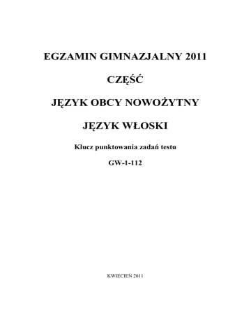 EGZAMIN GIMNAZJALNY 2011 CZĘŚĆ JĘZYK OBCY NOWOŻYTNY JĘZYK WŁOSKI Klucz punktowania zadań testu GW-1-112 KWIECIEŃ 2011 Zadania zamknięte Zadanie 1. Obszar standardów Jednostka testu Standard odbiór tekstu słuchanego 1.1. 1.2. 1.3. 1.4. Uczeń określa główną myśl tekstu (1.1.) Uczeń stwierdza, czy tekst zawiera określone informacje; wyszukuje lub selekcjonuje informacje (1.3.) Poprawna odpowiedź (1 pkt) B C C A Zadanie 2. Obszar standardów Jednostka testu Standard odbiór tekstu słuchanego 2.1. 2.2. 2.3. Uczeń stwierdza, czy tekst zawiera określone informacje; wyszukuje lub selekcjonuje informacje (1.3.) Obszar standardów Jednostka testu Standard odbiór tekstu słuchanego 3.1. 3.2. 3.3. Uczeń stwierdza, czy tekst zawiera określone informacje; wyszukuje lub selekcjonuje informacje (1.3.) Jednostka testu Standard Poprawna odpowiedź (1 pkt) F V F Zadanie 3. Poprawna odpowiedź (1 pkt) B D A Zadanie 4. Obszar standardów 4.1. reagowanie językowe 4.2. 4.3. 4.4. Uczeń właściwie reaguje językowo w określonych kontekstach sytuacyjnych, w szczególności w celu uzyskania, udzielenia, przekazania lub odmowy udzielenia informacji, rozpoczęcia, podtrzymania i zakończenia rozmowy (3.1.) Strona 2 z 5 Poprawna odpowiedź (1 pkt) A B C A Zadanie 5. Obszar standardów Jednostka testu 5.1. reagowanie językowe 5.2. 5.3. 5.4. Standard Uczeń właściwie reaguje językowo w określonych kontekstach sytuacyjnych, w szczególności w celu uzyskania, udzielenia, przekazania lub odmowy udzielenia informacji, rozpoczęcia, podtrzymania i zakończenia rozmowy (3.1.) Poprawna odpowiedź (1 pkt) D E C B Zadanie 6. Obszar standardów Jednostka testu Standard reagowanie językowe 6.1. 6.2. 6.3. 6.4. Uczeń przetwarza treści tekstu przeczytanego w języku polskim lub treści przedstawione w materiale ikonograficznym i wyraża je w języku obcym (3.3.) Poprawna odpowiedź (1 pkt) C B B B Zadanie 7. Obszar standardów Jednostka testu Standard reagowanie językowe 7.1. 7.2. 7.3. 7.4. Uczeń rozpoznaje i poprawnie stosuje struktury leksykalno-gramatyczne niezbędne do skutecznej komunikacji (3.2.) Poprawna odpowiedź (1 pkt) B A B C Zadanie 8. Obszar standardów Jednostka testu Standard reagowanie językowe 8.1. 8.2. 8.3. 8.4. Uczeń przetwarza treści tekstu przeczytanego w języku polskim lub treści przedstawione w materiale ikonograficznym i wyraża je w języku obcym (3.3.) Strona 3 z 5 Poprawna odpowiedź (1 pkt) B A C B Zadanie 9. Obszar standardów odbiór tekstu czytanego Jednostka testu Standard Poprawna odpowiedź (1 pkt) 9.1. Uczeń określa kontekst sytuacyjny (2.5.) C 9.2. Uczeń określa intencję nadawcy tekstu (2.4.) B 9.3. 9.4. Uczeń stwierdza, czy tekst zawiera określone informacje; wyszukuje lub selekcjonuje informacje (2.3.) A C Zadanie 10. Obszar standardów Jednostka testu Standard odbiór tekstu czytanego 10.1. 10.2. 10.3. 10.4. Uczeń określa główną myśl poszczególnych części tekstu (2.2.) Obszar standardów Jednostka testu Standard odbiór tekstu czytanego 11.1. 11.2. 11.3. Uczeń rozpoznaje związki między poszczególnymi częściami tekstu (2.6.) Obszar standardów Jednostka testu Standard odbiór tekstu czytanego 12.1. 12.2. 12.3. 12.4. Uczeń stwierdza, czy tekst zawiera określone informacje; wyszukuje lub selekcjonuje informacje (2.3.) Poprawna odpowiedź (1 pkt) B A C E Zadanie 11. Poprawna odpowiedź (1 pkt) C B A Zadanie 12. Strona 4 z 5 Poprawna odpowiedź (1 pkt) D E C A Zadanie 13. Obszar standardów Jednostka testu odbiór tekstu czytanego 13.1. 13.2. 13.3. 13.4. 13.5. Standard Uczeń stwierdza, czy tekst zawiera określone informacje; wyszukuje lub selekcjonuje informacje (2.3.) Uczeń określa intencję nadawcy tekstu (2.4.) Strona 5 z 5 Poprawna odpowiedź (1 pkt) B B A B C