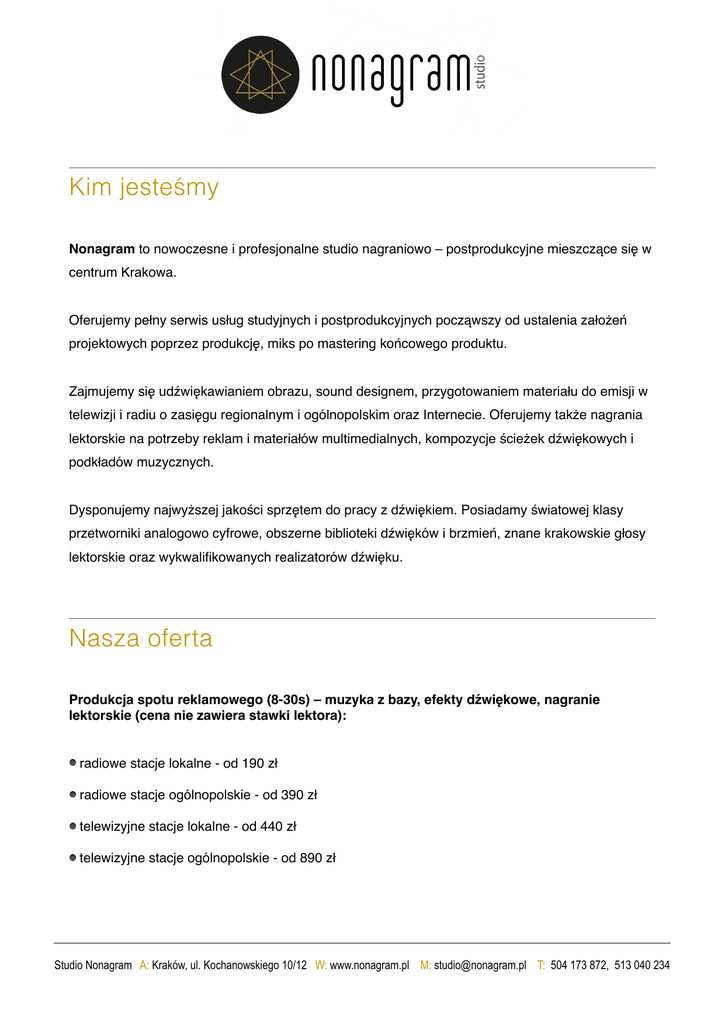 Kim jesteśmy Nonagram to nowoczesne i profesjonalne studio nagraniowo – postprodukcyjne mieszczące się w centrum Krakowa. Oferujemy pełny serwis usług studyjnych i postprodukcyjnych począwszy od ustalenia założeń projektowych poprzez produkcję, miks po mastering końcowego produktu. Zajmujemy się udźwiękawianiem obrazu, sound designem, przygotowaniem materiału do emisji w telewizji i radiu o zasięgu regionalnym i ogólnopolskim oraz Internecie. Oferujemy także nagrania lektorskie na potrzeby reklam i materiałów multimedialnych, kompozycje ścieżek dźwiękowych i podkładów muzycznych. Dysponujemy najwyższej jakości sprzętem do pracy z dźwiękiem. Posiadamy światowej klasy przetworniki analogowo cyfrowe, obszerne biblioteki dźwięków i brzmień, znane krakowskie głosy lektorskie oraz wykwalifikowanych realizatorów dźwięku. Nasza oferta Produkcja spotu reklamowego (8-30s) – muzyka z bazy, efekty dźwiękowe, nagranie lektorskie (cena nie zawiera stawki lektora): radiowe stacje lokalne - od 190 zł radiowe stacje ogólnopolskie - od 390 zł telewizyjne stacje lokalne - od 440 zł telewizyjne stacje ogólnopolskie - od 890 zł Studio Nonagram A: Kraków, ul. Kochanowskiego 10/12 W: www.nonagram.pl M: [email protected] T: 504 173 872, 513 040 234 Nagrania lektorskie (reklama, animacje, prezentacje, audiobooki): Godzina nagrania w studiu z realizatorem – 50zł/h Wynagrodzenie lektora z bazy ustalane indywidualnie (istnieje możliwość wykorzystania własnego lektora), Obróbka nagrania (wycięcie oddechów, pomyłek i niechcianych odgłosów, korekcja barwy głosu, przygotowanie plików zgodnie ze specyfikacją) – 75zł/15min materiału Udźwiękowienie animacji – muzyka z bazy, efekty dźwiękowe, nagranie lektorskie (cena nie zawiera stawki lektora): Udźwiękowienie animacji - od 200zł/min Udźwiękowienie aplikacji na urządzenia mobilne– muzyka z bazy, efekty dźwiękowe Udźwiękowienie aplikacji iOS/Android/WIndows - od 400 zł Nie oferujemy usługi zleceń express, ponieważ wszystkie nasze zlecenia są wykonywane w możliwie jak najkrótszym czasie, zachowując najwyższe standary jakości. Przy większych projektach lub stałej współpracy istnieje możliwość negocjacji cen. Podane ceny są cenami netto. Wystawiamy faktury VAT. Osoba kontaktowa ds. reklamy Michał Korzeniowski T: 504 173 872 E: [email protected] Studio Nonagram A: Kraków, ul. Kochanowskiego 10/12 W: www.nonagram.pl M: [email protected] T: 504 173 872, 513 040 234