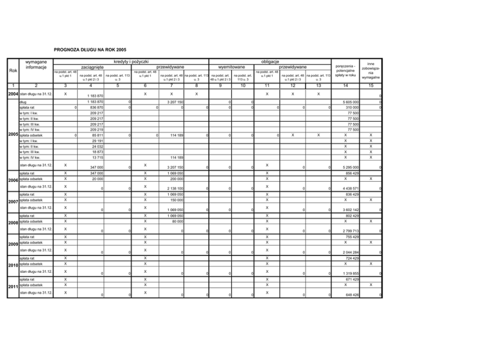 PROGNOZA DŁUGU NA ROK 2005 Rok na podst. art. 48 u.1 pkt 1 1 2 3 stan długu na 31.12. X spłata rat 0 w tym: I kw. 2008 2009 2010 2011 na podst. art. 113 u. 3 4 5 1 183 870 0 836 870 0 na podst. art. 48 u.1 pkt 1 wyemitowane na podst. art. 48 na podst. art. 113 na podst. art. u.1 pkt 2 i 3 u. 3 48 u.1 pkt 2 i 3 6 7 8 X X X 9 3 207 150 0 0 0 na podst. art. 113 u. 3 10 0 0 0 0 na podst. art. 48 u.1 pkt 1 na podst. art. 48 na podst. art. 113 u.1 pkt 2 i 3 u. 3 11 12 13 X X X 0 0 poręczenia potencjalne spłaty w roku inne zobowiązania wymagalne 14 15 0 0 5 605 000 0 310 000 0 209 217 77 500 w tym: II kw. 209 217 77 500 w tym: III kw. 209 217 77 500 w tym: IV kw. 209 219 77 500 X X 29 191 X X w tym: II kw. 24 032 X X w tym: III kw. 18 873 X X w tym: IV kw. 13 715 X X spłata odsetek 0 w tym: I kw. 2007 na podst. art. 48 u.1 pkt 2 i 3 1 183 870 dług 2006 przewidywane zaciągnięte 2004 2005 obligacje przewidywane kredyty i poŜyczki wymagane informacje 85 811 0 0 114 189 0 0 0 0 stan długu na 31.12. X X 347 000 X 1 069 050 X spłata odsetek X 20 000 X 200 000 X 0 X 0 0 0 X stan długu na 31.12. X X X 1 069 050 X spłata odsetek X X 150 000 X 0 X 3 207 150 spłata rat 0 0 0 0 X stan długu na 31.12. X X X 1 069 050 X spłata odsetek X X 80 000 X 0 X 2 138 100 spłata rat 0 0 0 0 X stan długu na 31.12. X X X X spłata odsetek X X X 0 X 1 069 050 spłata rat 0 0 0 0 X stan długu na 31.12. X X X X spłata odsetek X X X 0 X 0 spłata rat 0 0 0 0 X stan długu na 31.12. X X X X spłata odsetek X X X stan długu na 31.12. X X X 0 0 0 X 0 spłata rat 0 X 114 189 spłata rat 347 000 X 0 0 0 0 0 0 0 0 X 0 0 5 295 000 0 856 429 X 0 0 X 4 438 571 0 836 429 X 0 0 X 3 602 142 0 802 429 X 0 0 X 2 799 713 0 755 429 X 0 0 X 2 044 284 0 724 429 X 0 0 X 1 319 855 0 671 429 X 0 0 648 426 X 0 INSTRUKCJA OBSŁUGI ARKUSZA: 1.Aruksz zapisany jest jako szablon. Aby z niego korzystać naleŜy wpierw wcisnąć dwa klawisze razem CTRL i a. Wówczas pokaŜe się okno dialogowe, do którego naleŜy wpisać katalog, w którym ma być zapisany arkusz oraz jego nazwę. Przykład wpisu podany jest w oknie dialogowym. 2.Utworzony w ten sposób arkusz jest gotów do pracy jako arkusz xls. Z szablonu o nazwie prognoza.xlt moŜna korzystać do tworzenia nowej prognozy. 3. Arkusz ma zabezpieczone komórki, w których zawarte są formuły przeliczeniowe. 4. Małe trójkąciki w lewym rogu komórki wskazują, Ŝe do komórki dołączony jest komentarz wyjaśniający co naleŜy wpisać do komórki. Aby odczytać komentarz naleŜy myszką najechać na komórkę. WYLICZENIA dochody budŜetu wartości ogółem 16 17 wskaźnik % art. 113 wskaźnik % u.f.p art. 114 u.f.p 18 23 150 506 1 183 870 23 104 862 3 207 150 19 X 5,11 3 465 729 X X 1 146 870 X X 286 717 X 17,76 X 286 717 X 16,52 X 286 717 X 15,28 X 286 719 X X 200 000 X 29 191 X 24 032 X X 18 873 X X X 127 904 X X X 8 849 150 22 620 000 X X X 1 871 479 X 755 429 X 724 429 671 429 20,40 X 1 951 479 X 12,17 X 3,27 X 755 429 X 8,85 X 3,12 1 319 855 23 400 000 X X 8,48 0 X 29,07 2 055 479 2 044 284 23 200 000 X X X 0 X 38,30 X 8,98 2 799 713 23 100 000 X 2 492 479 80 000 X X X 4 671 192 23 000 000 1 346 870 11,02 150 000 X X 1 905 479 X X 6 576 671 22 900 000 14,04 5,83 X 220 000 X X 2 272 479 X X 724 429 X 5,69 X 0 2,87 648 426 671 429 X 2,77