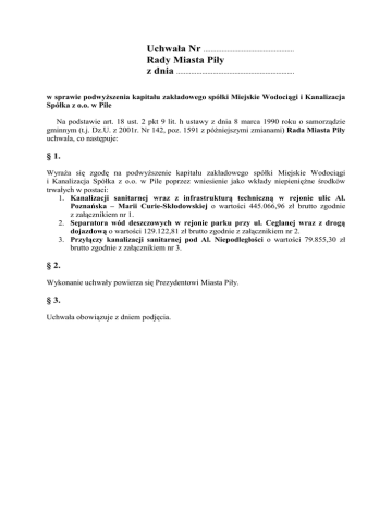 Uchwała Nr .................................................. Rady Miasta Piły z dnia ................................................................. w sprawie podwyŜszenia kapitału zakładowego spółki Miejskie Wodociągi i Kanalizacja Spółka z o.o. w Pile Na podstawie art. 18 ust. 2 pkt 9 lit. h ustawy z dnia 8 marca 1990 roku o samorządzie gminnym (t.j. Dz.U. z 2001r. Nr 142, poz. 1591 z późniejszymi zmianami) Rada Miasta Piły uchwala, co następuje: § 1. WyraŜa się zgodę na podwyŜszenie kapitału zakładowego spółki Miejskie Wodociągi i Kanalizacja Spółka z o.o. w Pile poprzez wniesienie jako wkłady niepienięŜne środków trwałych w postaci: 1. Kanalizacji sanitarnej wraz z infrastrukturą techniczną w rejonie ulic Al. Poznańska – Marii Curie-Skłodowskiej o wartości 445.066,96 zł brutto zgodnie z załącznikiem nr 1. 2. Separatora wód deszczowych w rejonie parku przy ul. Ceglanej wraz z drogą dojazdową o wartości 129.122,81 zł brutto zgodnie z załącznikiem nr 2. 3. Przyłączy kanalizacji sanitarnej pod Al. Niepodległości o wartości 79.855,30 zł brutto zgodnie z załącznikiem nr 3. § 2. Wykonanie uchwały powierza się Prezydentowi Miasta Piły. § 3. Uchwała obowiązuje z dniem podjęcia. Załącznik nr 1 do Uchwały Nr ........................ Rady Miasta Piły z dnia .................................... Kanalizacja sanitarna wraz z infrastrukturą techniczną w rejonie ulic Al. Poznańska – Marii Curie-Skłodowskiej Charakterystyka: Kanalizacja sanitarna od Al. Poznańskiej 3 do 79 i w ul. Kościuszki do skrzyŜowania z ul. Marii Curie-Skłodowskiej: - kanalizacja sanitarna tłoczna Ø 63 mm – 456,00 mb, - kanalizacja sanitarna grawitacyjna Ø 200 mm – 137,90 mb - kanalizacja sanitarna grawitacyjna Ø 160 mm – 89,10 mb - przydomowe przepompownie ścieków sanitarnych Ø 600 z PE (PS1, PS3, PS4, PS5, PS6, PS7, PS8) – 7 kpl - przepompownia ścieków sanitarnych PS2 Ø 1000 mm betonowa – 1 kpl.. - szafki sterownicze z okablowaniem dla przepompowni j.w. – 8 kpl. - studnia pomiarowa Ø 1000 mm betonowa z wyposaŜeniem przy przepompowni PD8 - studnia rozpręŜna Ø 1000 mm , betonowa - studnia rewizyjna z kręgów betonowych Ø1000 mm – szt. 6 - studnia rewizyjna z PVC Ø 400 mm – szt. 1 Kanalizacja sanitarna wraz z przepompownią P-9 przy ul. M. Curie-Skłodowskiej i przepompownią P-10 przy ul. Wysokiej: - przepompownia sieciowa P-10 ścieków sanitarnych betonowa o Ø 1500 mm - przepompownia sieciowa P-9 ścieków sanitarnych betonowa o Ø 2000 mm - szafka sterownicza z okablowaniem dla przepompowni P-10 i kablem zasilającym YKY 5x6 mm2 o dlugości 30 mb - szafka sterownicza z okablowaniem dla przepompowni P-9 - kanalizacja sanitarna tłoczna Ø 63 mm – 31,40 mb - kanalizacja sanitarna tłoczna Ø 90 mm – 98,80 mb - kanalizacja sanitarna grawitacyjna Ø 160 mm – 19,00 mb - kanalizacja sanitarna grawitacyjna Ø 315 mm – 7,5 mb Plac utwardzony przy przepompowni P-9 przy ul. M. Curie-Skłodowskiej: - powierzchnia ok. 7,5 m2 z kostki typu „Polbruk” - obrzeŜe betonowe z krawęŜnikiem o szerokości 30 cm wokół przepompowni poza jego obrysem Ogrodzenie przepompowni P-9 przy ul. M. Curie-Skłodowskiej: - wysokość 1,8 m, długości ok. 12 mb (w tym dwie bramy dwudrzwiowe o długości 2 m kaŜda) z siatki stalowej w ramach z kątownika na słupkach stalowych Ø 50 mm i Ø 60 mm Ogrodzenie przepompowni P-10 przy ul. Wysokiej: - wysokość 1,8 m, długość – ok. 15 mb (w tym brama dwudrzwiowa o długości 2 mb) z siatki stalowej w ramach kątownika 35 x 35 mm na słupkach stalowych Ø 50 mm Załącznik nr 2 do Uchwały nr ......................... Rady Miasta Piły z dnia .................................... Separator wód deszczowych w rejonie parku przy ul. Ceglanej wraz z drogą dojazdową Charakterystyka: - separator koalescencyjny PSK KOALA NG 125 o przepustowości 125 dm3 firmy EKOLUNICON wraz z wyposaŜeniem rurociąg z PVC klasy S o średnicy Ø 250 mm i długości L=9,0mb i rurociąg z PVC klasy S o średnicy Ø 300 mm i długości L=4,0mb) - studnia rewizyjna z kręgów betonowych Ø 1000 mm z włazem Ŝeliwnym typu cięŜkiego - droga z płyt Ŝelbetowych drogowych pełnych o długości 15 mb i szerokości 3,0 m Załącznik nr 3 do Uchwały Nr .......................... Rady Miasta Piły z dnia ........................................ Przyłącza kanalizacji sanitarnej pod Al. Niepodległości Charakterystyka: Przyłącze dla budynków: nr 96, 96a, 98, 98a: - kanał z rur PVC klasy S(SN8) o Ø 160 mm – 24,00 mb - kanał z rur PVC klasy S(SN8) o Ø 200 mm – 63,00 mb - studnia kanalizacyjna z kręgów betonowych o Ø 1000 mm – 1 szt. - studnia kanalizacyjna z PVC Ø 425 mm – szt. 4. Przyłącze dla budynków: nr 100, 102a, 102b: - kanał z rur PVC klasy S (SN8) o Ø 160 mm – 12 mb, - kanał z rur PVC klasy S (SN8) o Ø 200 mm - 25,5 mb, - studnia kanalizacyjna z PVC o Ø 425 mm – szt. 1. Przyłącze dla budynków nr 126, 126a: - kanał z rur PVC klasy S (SN8) o Ø 200 mm – 17,5 mb, - studnia kanalizacyjna z kręgów betonowych Ø 1000 mm – szt. 1, - studnia kanalizacyjna z PVC Ø 425 mm – szt. 1. Przyłącze dla budynków nr 146, 150, 152: - kanał z rur klasy S(SN8) o Ø 160 mm – 2,5 mb, - kanał z rur PVC klasy S(SN8) o Ø 200 mm – 39,0 mb, - studnia kanalizacyjna z PVC Ø 425 mm – szt. 4. Uzasadnienie Przedmiotem aportu jest wniesienie środków trwałych w postaci: 1. Sieci kanalizacji sanitarnej grawitacyjnej i tłocznej wraz z towarzyszącą infrastrukturą (studnie rewizyjne, rozpręŜne i pomiarowe, przydomowe i sieciowe przepompownie ścieków sanitarnych) w rejonie ulic Aleja Poznańska – Marii Curie-Skłodowskiej wg charakterystyki za załącznikiem nr 1 do niniejszej uchwały. 2. Separator wód deszczowych wraz z droga dojazdową wg charakterystyki za załącznikiem nr 2 do niniejszej uchwały. 3. Przyłącza kanalizacji sanitarnej pod Aleją niepodległości wg 