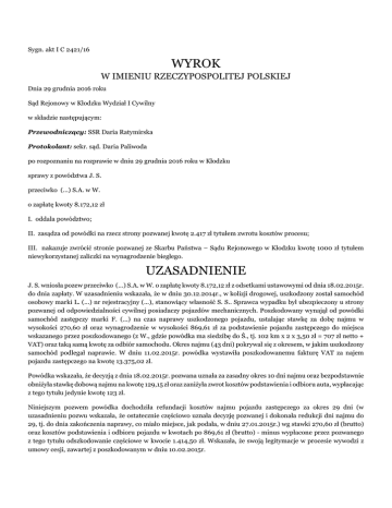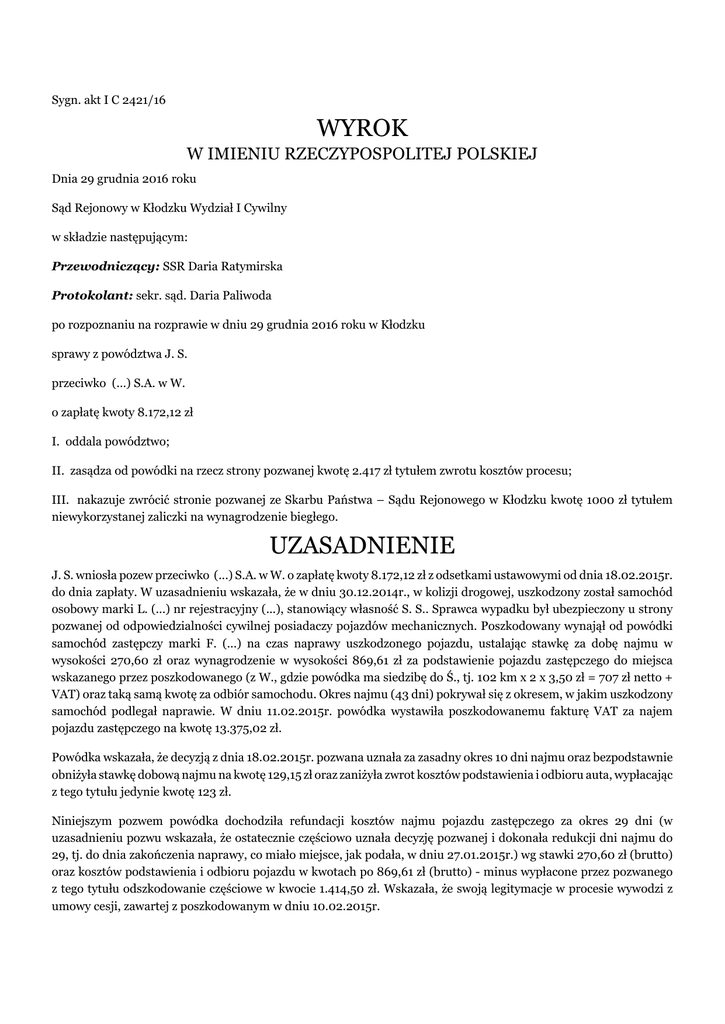 Sygn. akt I C 2421/16 WYROK W IMIENIU RZECZYPOSPOLITEJ POLSKIEJ Dnia 29 grudnia 2016 roku Sąd Rejonowy w Kłodzku Wydział I Cywilny w składzie następującym: Przewodniczący: SSR Daria Ratymirska Protokolant: sekr. sąd. Daria Paliwoda po rozpoznaniu na rozprawie w dniu 29 grudnia 2016 roku w Kłodzku sprawy z powództwa J. S. przeciwko (...) S.A. w W. o zapłatę kwoty 8.172,12 zł I. oddala powództwo; II. zasądza od powódki na rzecz strony pozwanej kwotę 2.417 zł tytułem zwrotu kosztów procesu; III. nakazuje zwrócić stronie pozwanej ze Skarbu Państwa – Sądu Rejonowego w Kłodzku kwotę 1000 zł tytułem niewykorzystanej zaliczki na wynagrodzenie biegłego. UZASADNIENIE J. S. wniosła pozew przeciwko (...) S.A. w W. o zapłatę kwoty 8.172,12 zł z odsetkami ustawowymi od dnia 18.02.2015r. do dnia zapłaty. W uzasadnieniu wskazała, że w dniu 30.12.2014r., w kolizji drogowej, uszkodzony został samochód osobowy marki L. (...) nr rejestracyjny (...), stanowiący własność S. S.. Sprawca wypadku był ubezpieczony u strony pozwanej od odpowiedzialności cywilnej posiadaczy pojazdów mechanicznych. Poszkodowany wynajął od powódki samochód zastępczy marki F. (...) na czas naprawy uszkodzonego pojazdu, ustalając stawkę za dobę najmu w wysokości 270,60 zł oraz wynagrodzenie w wysokości 869,61 zł za podstawienie pojazdu zastępczego do miejsca wskazanego przez poszkodowanego (z W., gdzie powódka ma siedzibę do Ś., tj. 102 km x 2 x 3,50 zł = 707 zł netto + VAT) oraz taką samą kwotę za odbiór samochodu. Okres najmu (43 dni) pokrywał się z okresem, w jakim uszkodzony samochód podlegał naprawie. W dniu 11.02.2015r. powódka wystawiła poszkodowanemu fakturę VAT za najem pojazdu zastępczego na kwotę 13.375,02 zł. Powódka wskazała, że decyzją z dnia 18.02.2015r. pozwana uznała za zasadny okres 10 dni najmu oraz bezpodstawnie obniżyła stawkę dobową najmu na kwotę 129,15 zł oraz zaniżyła zwrot kosztów podstawienia i odbioru auta, wypłacając z tego tytułu jedynie kwotę 123 zł. Niniejszym pozwem powódka dochodziła refundacji kosztów najmu pojazdu zastępczego za okres 29 dni (w uzasadnieniu pozwu wskazała, że ostatecznie częściowo uznała decyzję pozwanej i dokonała redukcji dni najmu do 29, tj. do dnia zakończenia naprawy, co miało miejsce, jak podała, w dniu 27.01.2015r.) wg stawki 270,60 zł (brutto) oraz kosztów podstawienia i odbioru pojazdu w kwotach po 869,61 zł (brutto) - minus wypłacone przez pozwanego z tego tytułu odszkodowanie częściowe w kwocie 1.414,50 zł. Wskazała, że swoją legitymacje w procesie wywodzi z umowy cesji, zawartej z poszkodowanym w dniu 10.02.2015r. Strona pozwana wniosła o oddalenie powództwa w całości i zasądzenie kosztów postępowania. Zarzuciła, że, po przeprowadzeniu postępowania likwidacyjnego, wypłaciła na rzecz powódki odszkodowanie, uznając za zasadne 10 dni najmu pojazdu zastępczego, przy przyjęciu stawki 129,15 zł za dobę, oraz 123 zł za podstawienie i odbiór auta zastępczego. Zdaniem pozwanej, stawka, zastosowana przez powódkę, była zawyżona, przy czym również okres najmu, przyjęty przez powódkę był niezasadny, a wywołany tym koszt nie był celowy i ekonomicznie uzasadniony. Pozwana zakwestionowała ponadto wysokość kosztów podstawienia i odbioru pojazdu zastępczego do miejscowości znacząco oddalonej od miejsca zamieszkania poszkodowanego oraz sposób naliczenia tych kosztów wg kilometrów. Zarzuciła, że nie został tu dochowany obowiązek minimalizacji szkody, spoczywający na poszkodowanym. Pozwana zarzuciła ponadto, że twierdzenia powódki odnośnie daty zakończenia naprawy w dniu 27.01.2015r. były sprzeczne z datą faktury nr (...) wystawionej już w dniu 14.01.2015r. przez zakład naprawczy za wykonaną naprawę pojazdu. Podniosła, że uszkodzony samochód został oddany do naprawy dopiero 7.01.2015r. i to do warsztatu, który mieści się pod tym samym adresem, co miejsce zamieszkania poszkodowanego. Zarzuciła, że rodzaj uszkodzeń w pojeździe nie czynił go niezdatnym do ruchu drogowego przed dniem 7.01.2015r. Stan faktyczny: W dniu 30 grudnia 2014r. w kolizji drogowej został uszkodzony samochód osobowy marki L. (...) nr rejestracyjny (...), stanowiący własność S. S.. Sprawca wypadku był ubezpieczony u strony pozwanej od odpowiedzialności cywilnej posiadaczy pojazdów mechanicznych. Powódka prowadzi działalność gospodarczą pod firmą(...) z siedzibą we W., w ramach której wynajmuje samochody zastępcze osobom poszkodowanym w wypadkach drogowych. W następstwie zgłoszenia szkody przez powódkę – która nabyła prawa do wierzytelności, z tytułu kosztów najmu pojazdu zastępczego, na podstawie umowy cesji z dnia 10.02.2015r. i zgłosiła swoje roszczenie, przedstawiając fakturę VAT nr (...) z dnia 11.02.2015r. na kwotę 13.375,02 zł - strona pozwana przeprowadziła postępowanie likwidacyjne i wypłaciła powódce odszkodowanie w kwocie 1.414,50 zł, uznając - decyzją z dnia 18.02.2015r. - za zasadny okres 10 dni najmu ze stawką dobową w wysokości 129,15 zł oraz przyznając zwrot kosztów podstawienia i odbioru auta w kwocie 123 zł. Bezsporne. Sąd ustalił: Poszkodowany S. S. jest mechanikiem samochodowym, mieszka i prowadzi działalność warsztatową w Ś. przy ul. (...). Pod tym samym adresem działalność gospodarczą w zakresie naprawy pojazdów mechanicznych prowadzi jego brat P. S., z zawodu lakiernik i blacharz samochodowy, który dodatkowo, w zakresie swojej działalności, zajmuje się wynajmowaniem pojazdów zastępczych – aktualnie w ofercie ma sześć samochodów, zaś w styczniu 2015r. dysponował dwoma pojazdami marki S. (...). Oferował wynajem pojazdów tzw. klasy C za cenę 130 zł za dobę. Często współpracował także z powódką w zakresie wynajmu pojazdów, które na jego prośbę dostarczane były z W.. W następstwie przedmiotowego wypadku z dnia 30.12.2014r., b