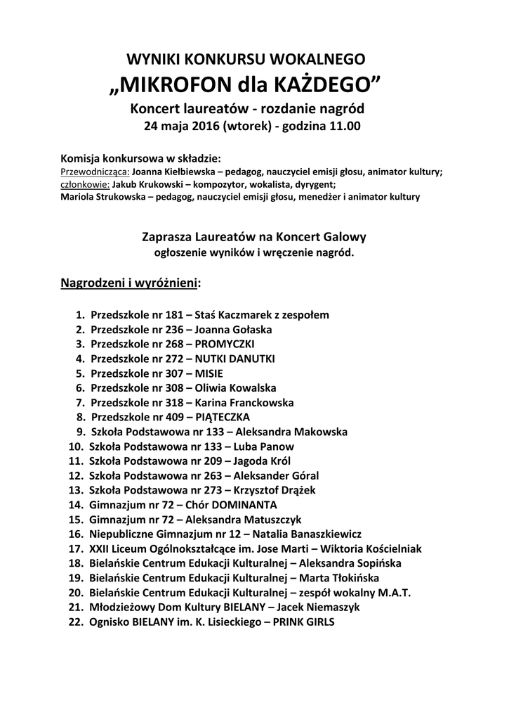WYNIKI KONKURSU WOKALNEGO „MIKROFON dla KAŻDEGO” Koncert laureatów - rozdanie nagród 24 maja 2016 (wtorek) - godzina 11.00 Komisja konkursowa w składzie: Przewodnicząca: Joanna Kiełbiewska – pedagog, nauczyciel emisji głosu, animator kultury; członkowie: Jakub Krukowski – kompozytor, wokalista, dyrygent; Mariola Strukowska – pedagog, nauczyciel emisji głosu, menedżer i animator kultury Zaprasza Laureatów na Koncert Galowy ogłoszenie wyników i wręczenie nagród. Nagrodzeni i wyróżnieni: 1. Przedszkole nr 181 – Staś Kaczmarek z zespołem 2. Przedszkole nr 236 – Joanna Gołaska 3. Przedszkole nr 268 – PROMYCZKI 4. Przedszkole nr 272 – NUTKI DANUTKI 5. Przedszkole nr 307 – MISIE 6. Przedszkole nr 308 – Oliwia Kowalska 7. Przedszkole nr 318 – Karina Franckowska 8. Przedszkole nr 409 – PIĄTECZKA 9. Szkoła Podstawowa nr 133 – Aleksandra Makowska 10. Szkoła Podstawowa nr 133 – Luba Panow 11. Szkoła Podstawowa nr 209 – Jagoda Król 12. Szkoła Podstawowa nr 263 – Aleksander Góral 13. Szkoła Podstawowa nr 273 – Krzysztof Drążek 14. Gimnazjum nr 72 – Chór DOMINANTA 15. Gimnazjum nr 72 – Aleksandra Matuszczyk 16. Niepubliczne Gimnazjum nr 12 – Natalia Banaszkiewicz 17. XXII Liceum Ogólnokształcące im. Jose Marti – Wiktoria Kościelniak 18. Bielańskie Centrum Edukacji Kulturalnej – Aleksandra Sopińska 19. Bielańskie Centrum Edukacji Kulturalnej – Marta Tłokińska 20. Bielańskie Centrum Edukacji Kulturalnej – zespół wokalny M.A.T. 21. Młodzieżowy Dom Kultury BIELANY – Jacek Niemaszyk 22. Ognisko BIELANY im. K. Lisieckiego – PRINK GIRLS Wykonawcy wybrani do Koncertu Laureatów: 1. Przedszkole nr 97 – Aleksandra Sondij 2. 3. 4. 5. 6. 7. 8. – „ A ja patrzę, a ja słucham” Przedszkole nr 181 – Emil Maksymiuk i SŁONECZKA – „U zegarmistrza” Przedszkole nr 327 – Antonina Wildner – „Ogrodniczka” Społeczna Szkoła Integracyjna nr 100 – DUSZKI – „Do Laury” Społeczna Szkoła Katolicka nr 109 – CONQUEST OF MUSIC – „Legenda o smoku” Szkoła Podstawowa nr 293 – Franciszek Szajewski – „My way” Bielańskie Centrum Edukacji Kulturalnej – Gabriela Biesiakirska – „Tańczące Eurydyki” Młodzieżowy Dom Kultury im. M. Gwizdak – Iwona Janus – „Take a bow” UWAGA Bardzo prosimy o przygotowanie podkładów na płycie Audio CD (nie mp3) – nie będzie możliwości odtworzenia podkładu z pendriv’a. Na scenie dostępny dla akompaniatora fortepian. W razie pytań, prosimy o kontakt: Mariola Strukowska tel. 506 356 869