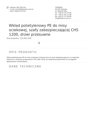 infolinia: 801 000 501 e-mail: [email protected] www: topserw.com.pl TOPSERW 05-220 Zielonka, ul. Marecka 66a tel. +48 22 771 04 56 tel. +48 22 761 11 80 fax +48 22 771 93 80 [email protected] Wkład polietylenowy PE do misy ociekowej, szafy zabezpieczającej CHS 1200, drzwi przesuwne Kod produktu: 124.901.020 OPIS PRODUKTU Wkład polietylenowy PE do misy ociekowej. Przeznaczony do szaf zabezpieczających na materiały toksyczne z drzwiami przesuwnymi CHS 1200. Służy do ustawiania pojemników ze szczególnie agresywnymi chemikaliamii. DANE TECHNICZNE