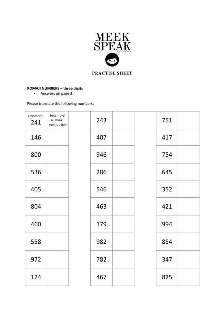 ROMAJI NUMBERS – three digits ▪ Answers on page 2 Please translate the following numbers: (example) (example) Ni hyaku yon juu ichi 243 751 146 407 417 800 946 754 536 286 645 405 546 352 804 463 421 460 179 994 558 982 854 972 782 347 124 467 825 241 Answers: 241 (example) Ni hyaku yon juu ichi 243 Ni hyaku yon juu san 751 Nana hyaku go juu ichi 146 Hyaku yon jū roku 407 Yon hyaku nana 417 Yon hyaku juu nana 800 Happyaku 946 Kyuu hyaku yon juu roku 754 Nana hyaku go juu yon 536 Go hyaku san juu roku 286 Ni hyaku hachi juu roku 645 Roppyaku yon juu go 405 Yon hyaku go 546 Go hyaku yon juu roku 352 Sanbyaku go juu ni 804 Happyaku yon 463 Yon hyaku roku juu san 421 Yon hyaku ni juu ichi 460 Yon hyaku roku juu 179 Hyaku nana juu kyuu 994 Kyuu hyaku kyuu juu yon 558 Go hyaku go juu hachi 982 Kyuu hyaku hachi juu ni 854 Happyaku go juu yon 972 Kyuu hyaku nana juu ni 782 Nana hyaku hachi juu ni 347 Sanbyaku yon juu nana 124 Hyaku ni juu yon 467 Yon hyaku roku juu nana 825 Happyaku ni juu go (example)