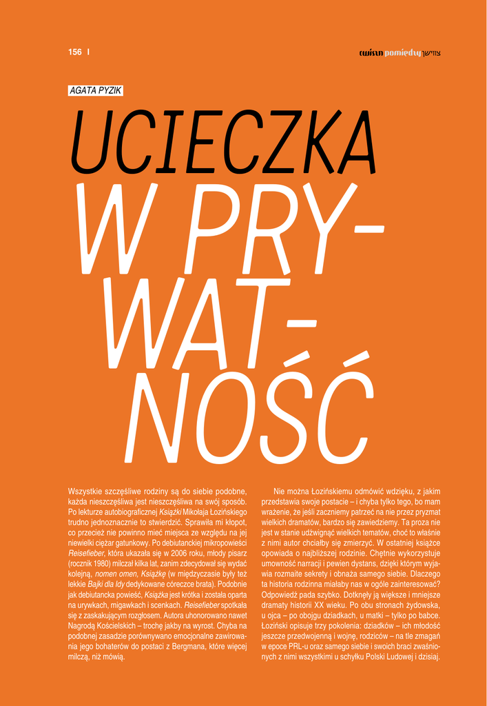 156 Agata Pyzik Ucieczka w prywatność Wszystkie szczęśliwe rodziny są do siebie podobne, każda nieszczęśliwa jest nieszczęśliwa na swój sposób. Po lekturze autobiograficznej Książki Mikołaja Łozińskiego trudno jednoznacznie to stwierdzić. Sprawiła mi kłopot, co przecież nie powinno mieć miejsca ze względu na jej niewielki ciężar gatunkowy. Po debiutanckiej mikropowieści Reisefieber, która ukazała się w 2006 roku, młody pisarz (rocznik 1980) milczał kilka lat, zanim zdecydował się wydać kolejną, nomen omen, Książkę (w międzyczasie były też lekkie Bajki dla Idy dedykowane córeczce brata). Podobnie jak debiutancka powieść, Książka jest krótka i została oparta na urywkach, migawkach i scenkach. Reisefieber spotkała się z zaskakującym rozgłosem. Autora uhonorowano nawet Nagrodą Kościelskich – trochę jakby na wyrost. Chyba na podobnej zasadzie porównywano emocjonalne zawirowania jego bohaterów do postaci z Bergmana, które więcej milczą, niż mówią. Nie można Łozińskiemu odmówić wdzięku, z jakim przedstawia swoje postacie – i chyba tylko tego, bo mam wrażenie, że jeśli zaczniemy patrzeć na nie przez pryzmat wielkich dramatów, bardzo się zawiedziemy. Ta proza nie jest w stanie udźwignąć wielkich tematów, choć to właśnie z nimi autor chciałby się zmierzyć. W ostatniej książce opowiada o najbliższej rodzinie. Chętnie wykorzystuje umowność narracji i pewien dystans, dzięki którym wyjawia rozmaite sekrety i obnaża samego siebie. Dlaczego ta historia rodzinna miałaby nas w ogóle zainteresować? Odpowiedź pada szybko. Dotknęły ją większe i mniejsze dramaty historii XX wieku. Po obu stronach żydowska, u ojca – po obojgu dziadkach, u matki – tylko po babce. Łoziński opisuje trzy pokolenia: dziadków – ich młodość jeszcze przedwojenną i wojnę, rodziców – na tle zmagań w epoce PRL-u oraz samego siebie i swoich braci zwaśnionych z nimi wszystkimi u schyłku Polski Ludowej i dzisiaj. recenzje Narracja Książki dodatkowo wzbogacona została o historie związane z przedmiotami krążącymi w rodzinie autora. Szuflada, obrączka, zeszyt, klucze, telefon, pistolet, fifka – wychodząc od nich, Łoziński opowiada o ludziach, którzy ich używali. Autor niby chciał „małą historię rodzinną wpisać w dużo większą”, jednocześnie pamiętając, by „empatia” nie przysłoniła mu „ostrości widzenia”. Niestety, ta mała rodzinna historia po wielokroć przyćmiewa tę większą. To, co prywatne, nie zawsze jest bardziej interesujące, a często też jest mniej komunikowalne i mniej mówi nam o świecie. Największym dramatem w tej rodzinie nie jest Holokaust, ale rozwody. Liczą się tylko uczucia – trudno zrekonstruować szczegóły dotyczące życia bohaterów, nie wiadomo, czym się zajmują lub w jakich warunkach żyją. Tylko dzięki postaci dziadka ze strony matki, generała-komunisty, przedstawianego jako tyrana, poznajemy trochę tła społecznego, także gdy mowa o blokowisku i pijaczku, który rzucił w tatę bohatera butelką. Poza tym widzimy niewiele, nawet gdy nadchodzi rok 1968, kiedy brat dziadka zostaje zamknięty w więzieniu, a jego siostra „jedzie do I jak Irena”. Historia stała się atrakcyjnym tematem dla młodych pisarzy, od Masłowskiej po Dehnela. Coraz częściej staje się ona przedmiotem manipulacji. Używa się jej po to, by uczynić dzieło bardziej poruszającym, a literaturę – poważną. To niestety nie wystarczy. I nie chodzi o to, żeby nie poruszać tematów historycznych, ale o to, że nastąpiła ich inflacja, szczególnie w przypadku tematyki związanej z żydowską genealogią. Jeszcze kilka lat temu autorzy czuli, że muszą mieć poważny powód, żeby poruszać tego typu problemy. Wtedy nie było koniunktury na literaturę historyczną. Nie pisano jej, bo panowała cenzura, bo antysemityzm wciąż był odczuwalny. Obecnie tematyka żydowska dewaluuje się. Podobnie jak twórczość feministyczna lub queer, literatura żydowska zamyka się w pewnego rodzaju getcie. Dziedzictwo PRL-u i stosunek do niego to najciekawsza część książki. Można pisać o własnej rodzinie, kiedy się jeszcze nic nie powiedziało o kimś innym. Ja jednak cały czas zastanawiałam się, dlaczego mamy czytać akurat o tej. Wybierając prywatny świat intymnych relacji, autor stracił możliwość opowiedzenia prawdziwych dramatów rozgrywających się na tle społecznym. Chętnie dowiedziałabym się czegoś więcej o babce ze strony ojca, najbardziej poruszającej postaci, kobiety ukrywającej się samodzielnie z małym synem przez lata wojny, zmieniającej kilkakrotnie tożsamość, która w końcu otrzymała list od męża z sanatorium w Szwajcarii, w którym powiadamiał ją, że poznał inną kobietę i chce się rozwieść. Nigdy nie wyszła ponownie za mąż, okres PRL-u wypełniała jej praca i cotygodniowe wizyty u byłego męża i jego żony, gdzie zmuszała się do słuchania muzyki współczesnej, której nie lubiła. Wierzyła w system i Stalina, w latach 80. popadła w głęboką depresję i popełniła samobójstwo. Jej zacytowane (prawdziwe?) listy do siostry męża w Izraelu są rozdzierające. Na swój sposób tragiczną, zasługującą na uwagę postacią jest wspomniany dziadek-komunista, człowiek bez szkoły, który chciał zdać maturę. Otwierający konserwy bagnetem, nieszczęśliwy 157 w małżeństwie i raniący najbliższych, odgradzający się coraz bardziej od świata po utracie stanowiska, chodzący do końca życia w mundurze. Postać, której motywów postępowania nigdy nie poznamy. Człowiek, który utożsamił się z przypisaną mu przez reżim komunistyczny rolą. Łozińskiego to niestety nie interesuje. Może jednak uczyniono zbyt mało, żeby odkryć te tajemnice. Niewiele dowiadujemy się też o kompleksach związanych z żydowskim pochodzeniem. Bodaj najbardziej dramatycznie mówi o tym ów dziadek-despota