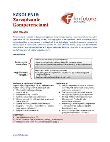 SZKOLENIE: Zarządzanie Kompetencjami OPIS TEMATU Przygotowanie i wdrożenie Systemu Zarządzania Kompetencjami zależy zarówno od jakości narzędzi i opracowań jak i od kompetencji zespołu realizującego to przedsięwzięcie. Celem oferowanej usługi szkoleniowej jest przygotowanie przedstawicieli firmy do budowy i wdrożenia systemu kompetencji zawodowych w wybranych zakresach polityki ZZL. Warsztatowa forma, praca nad konkretnymi narzędziami i studiami przypadków oraz wypracowywanie własnych rozwiązań to optymalna formuła działań rozwojowych nad tym zagadnieniem. Cele szkolenia Kompetencje uczestników Wypracowane narzędzia • Przyswojenie zasad opisu kompetencji • Rozwój umiejętności budowania profili kompetencyjncy • Poznanie zasad wdrozenia modelu kompetencji w wybrane obszary ZZL • Firmowy model systemu kompetencji • Arkusz Wyboru Kompetencji – narzędzie IT do budowania profili kompetencyjnych • Szablony opisów i dodatkowych narzędzi Kiedy warto zrealizować szkolenie Co oferujemy: Organizacja przygotowuje się do wykorzystania Mapa Kompetencji© wraz ze zbiorem modelu kompetencji w takich obszarach jak: dodatkowych opracowań (skale, karty, Ocena potencjału zawodowego wskazówki rozwojowe) pracowników Szablony opisu kompetencji wraz ze Proces rekrutacji i selekcji szczegółową instrukcją postępowania Systemowe zarządzanie szkoleniami Dostęp do testów kompetencyjnych Ocena potrzeb (i efektywności procesów) (Competency Profiler©) dla szkoleniowych uczestników szkolenia System okresowych ocen pracowniczych Wzorcowy Arkusz Wyboru Kompetencji Program rozwoju menedżerów (kadra – narzędzie IT do budowania profili rezerwowa – sukcesorzy) kompetencyjnych Program rozwoju talentów Książka: Zarządzanie Kompetencjami – perspektywa firmowa i osobista UCZESTNICY: Specjaliści w dziedzinie ZZL Osoby uczestniczące w procesach rozwoju pracowników Przedstawiciele kadry menedżerskiej i zarządzającej www.forfuture.eu Skrócony program szkolenia (2 dni) ZAKRES Strategiczne znaczenie i wykorzystanie modelu kompetencyjnego Model kompetencyjny w ZZL Metodologia opisu kompetencji – wskaźniki, budowa skali kompetencji Przygotowanie narzędzi uzupełniających – wskazówki rozwojowe, karty kompetencyjne Mapa Kompetencji© oraz sposoby tworzenia własnych pakietów kompetencyjnych Budowa profili kompetencyjnych OPIS Paradygmat efektywności w praktyce organizacyjnej Wpływ kompetencji na efektywność pracowników, zespołów i organizacji Zakresy wykorzystania systemu zarządzania kompetencjami Warunki powodzenia we wdrażaniu modelu kompetencji Wybór i opisywanie kompetencji (definicja, wskaźniki, skala) Przygotowanie opisu kompetencji specjalistycznych Budowa i wykorzystanie wskazówek rozwojowych Karty kompetencyjne – przygotowanie i zakres wykorzystania Firmowa Mapa (katalog) kompetencji Narzędzia wspierające zarządzanie opisami kompetencji Zasady przygotowania i realizacji audytu kompetencji Etapy wdrożenia opracowań SKZ w poszczególne obszary ZZL - przykładowe wdrożenia Przygotowanie profili kompetencji na bazie Arkusza Wyboru Kompetencji Narzędzia audytu: Testy kompetencyjne (wykonanie testu on-line) Wywiady behawioralne Systemy ocen (kwestionariusze, skale obserwacyjne) Assessment & Development Center Opis procesu wdrożenia systemu kompetencji Weryfikacja potrzeb organizacyjnych i wstępny plan wdrożenia Określenie niezbędnych zasobów Szacunkowy koszt Zakres Koszt Obejmuje Realizacja dwudniowego warsztatu w grupie 7200 zł Przygotowanie i realizację szkolenia od 6 od 15 uczestników Materiały dla uczestników Realizacja jednodniowego warsztatu w Certyfikaty i raport 4000 zł grupie od 6 od 15 uczestników Podany koszt nie obejmuje kwestii organizacyjnych (sala, pobyt, wyżywienie etc.) Działania opcjonalne Zbudowanie firmowej Mapy Kompetencji OPCJA 1 Konsultacje i wsparcie we wdrażaniu Systemu Kompetencji OPCJA 2 Spotkania szkoleniowo – informacyjne dla pracowników i kadry menedżerskiej OPCJA 3 Kontakt Kwestie organizacyjno - handlowe Kwestie merytoryczne www.forfuture.eu Grzegorz Filipowicz; [email protected]