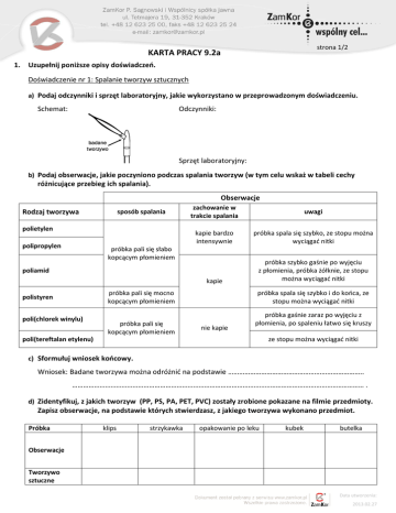 strona 1/2 KARTA PRACY 9.2a 1. Uzupełnij poniższe opisy doświadczeo. Doświadczenie nr 1: Spalanie tworzyw sztucznych a) Podaj odczynniki i sprzęt laboratoryjny, jakie wykorzystano w przeprowadzonym doświadczeniu. Schemat: Odczynniki: Sprzęt laboratoryjny: b) Podaj obserwacje, jakie poczyniono podczas spalania tworzyw (w tym celu wskaż w tabeli cechy różnicujące przebieg ich spalania). Obserwacje Rodzaj tworzywa sposób spalania polietylen polipropylen zachowanie w trakcie spalania uwagi kapie bardzo intensywnie próbka spala się szybko, ze stopu można wyciągad nitki kapie próbka szybko gaśnie po wyjęciu z płomienia, próbka żółknie, ze stopu można wyciągad nitki próbka pali się słabo kopcącym płomieniem poliamid próbka pali się mocno kopcącym płomieniem polistyren poli(chlorek winylu) próbka pali się kopcącym płomieniem próbka spala się szybko i do kooca, ze stopu można wyciągad nitki nie kapie próbka gaśnie zaraz po wyjęciu z płomienia, po spaleniu łatwo się kruszy poli(tereftalan etylenu) ze stopu można wyciągad nitki c) Sformułuj wniosek koocowy. Wniosek: Badane tworzywa można odróżnid na podstawie ……………………………………………………………….. …………………………………………………………………………………………………………………………………………… . d) Zidentyfikuj, z jakich tworzyw (PP, PS, PA, PET, PVC) zostały zrobione pokazane na filmie przedmioty. Zapisz obserwacje, na podstawie których stwierdzasz, z jakiego tworzywa wykonano przedmiot. Próbka klips strzykawka opakowanie po leku kubek butelka Obserwacje Tworzywo sztuczne Data utworzenia: 2013.02.27 strona 2/2 Doświadczenie nr 2: Identyfikacja PVC a) Narysuj schemat doświadczenia. Schemat: b) Zapisz obserwacje z przeprowadzonego doświadczenia. W tym celu uzupełnij poniższe zdania. Po włożeniu miedzianego drucika z niewielką ilością PVC do płomienia palnika ……………………………………… ………………………………………………………………………………………………………………………………………………..……………….. Po włożeniu miedzianego drucika z niewielką ilością opakowania po lekach do płomienia palnika ………… ………………………………………………………………………………………………………………………………………………..……………….. c) Sformułuj wniosek koocowy wynikający z poczynionych obserwacji. Wniosek: …………………………………………………………………………………………………………………………..………………..…… ………………………………………………………………………………………………………………………………………………..……………….. ………………………………………………………………………………………………………………………………………………..……………….. d) Wyjaśnij, dlaczego pokazanego na filmie opakowania po lekach nie wolno spalad w ognisku lub w palenisku domowym? Data utworzenia: 2013.02.27