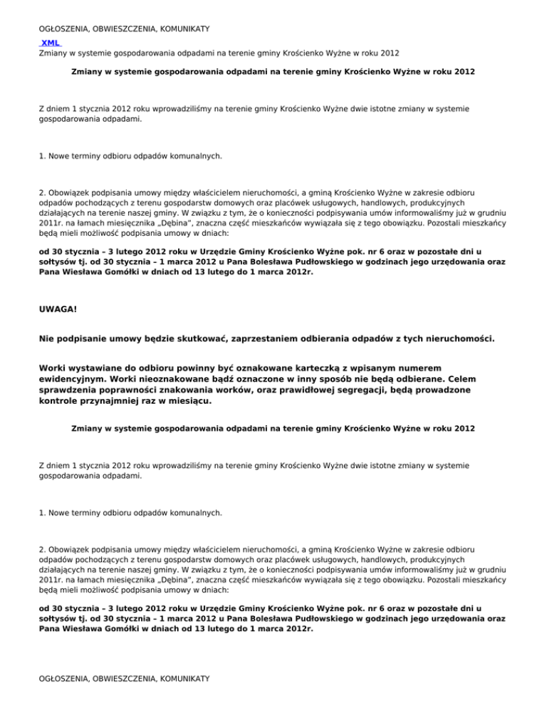 OGŁOSZENIA, OBWIESZCZENIA, KOMUNIKATY XML Zmiany w systemie gospodarowania odpadami na terenie gminy Krościenko Wyżne w roku 2012 Zmiany w systemie gospodarowania odpadami na terenie gminy Krościenko Wyżne w roku 2012 Z dniem 1 stycznia 2012 roku wprowadziliśmy na terenie gminy Krościenko Wyżne dwie istotne zmiany w systemie gospodarowania odpadami. 1. Nowe terminy odbioru odpadów komunalnych. 2. Obowiązek podpisania umowy między właścicielem nieruchomości, a gminą Krościenko Wyżne w zakresie odbioru odpadów pochodzących z terenu gospodarstw domowych oraz placówek usługowych, handlowych, produkcyjnych działających na terenie naszej gminy. W związku z tym, że o konieczności podpisywania umów informowaliśmy już w grudniu 2011r. na łamach miesięcznika „Dębina”, znaczna część mieszkańców wywiązała się z tego obowiązku. Pozostali mieszkańcy będą mieli możliwość podpisania umowy w dniach: od 30 stycznia – 3 lutego 2012 roku w Urzędzie Gminy Krościenko Wyżne pok. nr 6 oraz w pozostałe dni u sołtysów tj. od 30 stycznia – 1 marca 2012 u Pana Bolesława Pudłowskiego w godzinach jego urzędowania oraz Pana Wiesława Gomółki w dniach od 13 lutego do 1 marca 2012r. UWAGA! Nie podpisanie umowy będzie skutkować, zaprzestaniem odbierania odpadów z tych nieruchomości. Worki wystawiane do odbioru powinny być oznakowane karteczką z wpisanym numerem ewidencyjnym. Worki nieoznakowane bądź oznaczone w inny sposób nie będą odbierane. Celem sprawdzenia poprawności znakowania worków, oraz prawidłowej segregacji, będą prowadzone kontrole przynajmniej raz w miesiącu. Zmiany w systemie gospodarowania odpadami na terenie gminy Krościenko Wyżne w roku 2012 Z dniem 1 stycznia 2012 roku wprowadziliśmy na terenie gminy Krościenko Wyżne dwie istotne zmiany w systemie gospodarowania odpadami. 1. Nowe terminy odbioru odpadów komunalnych. 2. Obowiązek podpisania umowy między właścicielem nieruchomości, a gminą Krościenko Wyżne w zakresie odbioru odpadów pochodzących z terenu gospodarstw domowych oraz placówek usługowych, handlowych, produkcyjnych działających na terenie naszej gminy. W związku z tym, że o konieczności podpisywania umów informowaliśmy już w grudniu 2011r. na łamach miesięcznika „Dębina”, znaczna część mieszkańców wywiązała się z tego obowiązku. Pozostali mieszkańcy będą mieli możliwość podpisania umowy w dniach: od 30 stycznia – 3 lutego 2012 roku w Urzędzie Gminy Krościenko Wyżne pok. nr 6 oraz w pozostałe dni u sołtysów tj. od 30 stycznia – 1 marca 2012 u Pana Bolesława Pudłowskiego w godzinach jego urzędowania oraz Pana Wiesława Gomółki w dniach od 13 lutego do 1 marca 2012r. OGŁOSZENIA, OBWIESZCZENIA, KOMUNIKATY OGŁOSZENIA, OBWIESZCZENIA, KOMUNIKATY UWAGA! Nie podpisanie umowy będzie skutkować, zaprzestaniem odbierania odpadów z tych nieruchomości. Worki wystawiane do odbioru powinny być oznakowane karteczką z wpisanym numerem ewidencyjnym. Worki nieoznakowane bądź oznaczone w inny sposób nie będą odbierane. Celem sprawdzenia poprawności znakowania worków, oraz prawidłowej segregacji, będą prowadzone kontrole przynajmniej raz w miesiącu. Zmiana terminów wywozu odpadów z terenu naszej gminy jest podyktowana koniecznością prowadzenia rzetelnej segregacji u źródła. Obliguje nas do tego zmieniona ustawa o utrzymaniu czystości i porządku w gminach. Zmiany obowiązują od 1 stycznia 2012 roku. Zgodnie z zapisami ustawy gminy zobowiązane są do wprowadzenia szeregu istotnych zmian w zakresie gospodarki odpadami. Głównym celem ustawodawcy jest ograniczenie masy odpadów kierowanych na składowiska. W gminie Krościenko Wyżne system segregacji odpadów został wprowadzony już w 2007 roku. Powoli przyłączyło się do niego ok. 90 % mieszkańców naszej gminy. Analizując ilość zebranych w tych latach odpadów, stwierdzamy że ilość odpadów zmieszanych w stosunku do roku 2006 (czyli sprzed wprowadzenia systemu segregacji u źródła), jest nieco mniejsza, ale to wciąż za mało. Nadal zbyt duża liczba odpadów trafia na wysypisko śmieci. W związku z powyższym wprowadziliśmy zmiany w harmonogramie wywozu odpadów, dając możliwość częstszego oddawania odpadów segregowanych - surowców wtórnych (dwa razy, a nie jak było do tej pory raz w miesiącu). Odbieranie pozostałych odpadów tzw. zmieszanych dwa razy w miesiącu, może wydawać się niektórym z nas problematyczne - zbyt rzadkie, ale jest na to sposób - wystarczy rzetelnie prowadzić segregację śmieci w swoim gospodarstwie i szybko okaże się, że to odpadów segregowanych mamy więcej niż zmieszanych. Prawidłowo prowadzona segregacja oraz zmiana naszych codziennych zachowań może znacznie zmniejszyć ilość powstających śmieci, które wciąż w znacznym stopniu zasilają i tak przepełnione już składowiska odpadów. JAK POPRAWNIE SEGREGOWAĆ ODPADY W NASZYM GOSPODARSTWIE. Wystarczy zaopatrzyć się w dwa rodzaje worków: - worek czarny przeznaczony na odpady zmieszane, do którego wrzucamy: ● ● pozostałe odpady komunalne, których nie można już poddać dalszej segregacji: odpady kuchenne, kartony wielowarstwowe po sokach, mleku, tubki po pastach, kremach, produktach spożywczych, opakowania po cukierkach, chipsach, paluszkach, zupkach, opakowania z zawartością, ubrania, tkaniny, buty, ceramika, porcelana, fajans, szkło gospodarcze (miski, talerze, figurki itp.), artykuły higieniczne (pieluchy, chusteczki, waciki). Do worka nie wrzucamy: odpadów, które można poddać segregacji, odpadów niebezpiecznych (oleje, smary, farby, kleje itp.), gruzu, materiałów budowlanych, leków przeterminowanych, zużytego sprzętu RTV –AGD, odpadów wielkogabarytowych, akumulatorów, baterii, popiołów, - worek żółty – przeznaczony na odpady segregowane, do którego wrzucamy: ● ● butelki szklane (czyste i bez zawartości), słoiki szklane (bez na