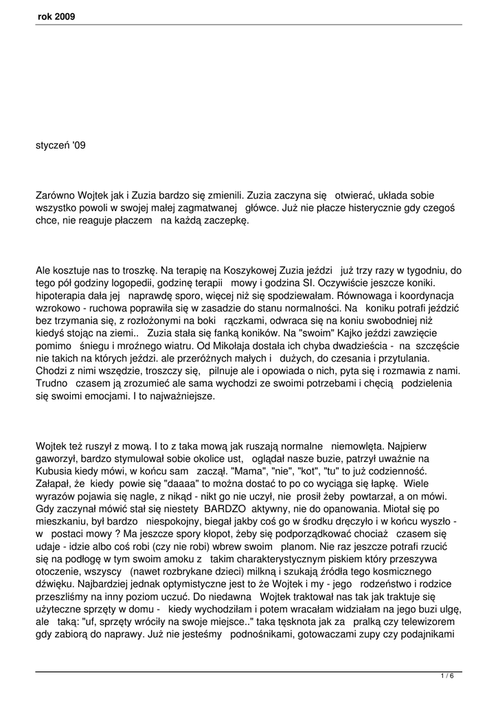 rok 2009 styczeń '09 Zarówno Wojtek jak i Zuzia bardzo się zmienili. Zuzia zaczyna się otwierać, układa sobie wszystko powoli w swojej małej zagmatwanej główce. Już nie płacze histerycznie gdy czegoś chce, nie reaguje płaczem na każdą zaczepkę. Ale kosztuje nas to troszkę. Na terapię na Koszykowej Zuzia jeździ już trzy razy w tygodniu, do tego pół godziny logopedii, godzinę terapii mowy i godzina SI. Oczywiście jeszcze koniki. hipoterapia dała jej naprawdę sporo, więcej niż się spodziewałam. Równowaga i koordynacja wzrokowo - ruchowa poprawiła się w zasadzie do stanu normalności. Na koniku potrafi jeździć bez trzymania się, z rozłożonymi na boki rączkami, odwraca się na koniu swobodniej niż kiedyś stojąc na ziemi.. Zuzia stała się fanką koników. Na "swoim" Kajko jeździ zawzięcie pomimo śniegu i mroźnego wiatru. Od Mikołaja dostała ich chyba dwadzieścia - na szczęście nie takich na których jeździ. ale przeróżnych małych i dużych, do czesania i przytulania. Chodzi z nimi wszędzie, troszczy się, pilnuje ale i opowiada o nich, pyta się i rozmawia z nami. Trudno czasem ją zrozumieć ale sama wychodzi ze swoimi potrzebami i chęcią podzielenia się swoimi emocjami. I to najważniejsze. Wojtek też ruszył z mową. I to z taka mową jak ruszają normalne niemowlęta. Najpierw gaworzył, bardzo stymulował sobie okolice ust, oglądał nasze buzie, patrzył uważnie na Kubusia kiedy mówi, w końcu sam zaczął. "Mama", "nie", "kot", "tu" to już codzienność. Załapał, że kiedy powie się "daaaa" to można dostać to po co wyciąga się łapkę. Wiele wyrazów pojawia się nagle, z nikąd - nikt go nie uczył, nie prosił żeby powtarzał, a on mówi. Gdy zaczynał mówić stał się niestety BARDZO aktywny, nie do opanowania. Miotał się po mieszkaniu, był bardzo niespokojny, biegał jakby coś go w środku dręczyło i w końcu wyszło w postaci mowy ? Ma jeszcze spory kłopot, żeby się podporządkować chociaż czasem się udaje - idzie albo coś robi (czy nie robi) wbrew swoim planom. Nie raz jeszcze potrafi rzucić się na podłogę w tym swoim amoku z takim charakterystycznym piskiem który przeszywa otoczenie, wszyscy (nawet rozbrykane dzieci) milkną i szukają źródła tego kosmicznego dźwięku. Najbardziej jednak optymistyczne jest to że Wojtek i my - jego rodzeństwo i rodzice przeszliśmy na inny poziom uczuć. Do niedawna Wojtek traktował nas tak jak traktuje się użyteczne sprzęty w domu - kiedy wychodziłam i potem wracałam widziałam na jego buzi ulgę, ale taką: "uf, sprzęty wróciły na swoje miejsce.." taka tęsknota jak za pralką czy telewizorem gdy zabiorą do naprawy. Już nie jesteśmy podnośnikami, gotowaczami zupy czy podajnikami 1/6 rok 2009 rzeczy trudniej osiągalnych. Jesteśmy z nim, nie gdzieś obok niego. W kwietniu odbywały się zapisy do przedszkola. W Piastowie nie ma przedszkola integracyjnego, ale Wojtuś ma Opinię o potrzebie kształcenia specjalnego, gdzie jest wyszczególnione, że może chodzić do przedszkola ogólnodostępnego. Poza tym ma przyznanego asystenta, z którym mógłby chodzić na 2-3 godziny 2-3 razy w tygodniu, kiedy nie miałby terapii. Złożyliśmy dokumenty do przedszkola do którego chodzi już brat bliźniąt -Kubuś. Przedstawiłam dokładnie sytuację Wojtusia (Zuzi diagnozy jeszcze nie mieliśmy) i dostałam zapewnienie od pani dyrektor, że raczej problemu nie będzie. Niestety, pomimo zapewnień dyrekcji Przedszkola Miejskiego nr 3 w Piastowie na liście dzieci przyjętych znalazła się tylko Zuzia. Wojtuś nie został przyjęty... bo ma autyzm... zapytałam w czym to przeszkadza, a może mu przecież tak pomóc.. Ano w tym, że TAKIE dziecko wymaga więcej uwagi, i nie ma w przedszkolu żadnej dodatkowej oferty dla TAKICH dzieci, "dla TAKICH dzieci są specjalne ośrodki" -ale on ma terapie różnego rodzaju poza przedszkolem, tu miałby tylko i AŻ grupę zdrowych dzieci.. miałby asystenta który by się nim zajmował co zupełnie odciążyłoby wychowawcę grupy.. -"skoro ma tyle zajęć i taką opiekę to SZKODA DLA NIEGO MIEJSCA W PRZEDSZKOLU" odpowiedziała pani dyrektor przedszkola... 2/6 rok 2009 Jeszcze po kilku tygodniach jesteśmy w szoku.... sierpień '09 Wojtuś w czasie wakacji zdobywa całe mnóstwo umiejętności. Uczył się czekania np. przy stoliku na frytki... trochę trudne... Szczególnie wtedy, gdy ktoś przy stoliku obok już te frytki ma! Jak zrozumieć te niewiele znaczące słowa "zaraz", "za chwilę"... przyzwyczailiśmy się do traktowania naszego synka jak chodzącą porażkę wychowawczą.. Nie chcemy tłumaczyć go przed wszystkimi dookoła. Może kiedyś zrozumie że są pewne zasady do których trzeba się choć trochę dostosować. Może kiedyś zacznie mu na tym zależeć?... poczucie zagrożenia... Do tej pory coś takiego po prostu nie istniało, choć ostrożnie poruszał się po drabinkach, lepiej planował swoje kroki a to że nie uległ wypadkowi nie zawdzięczaliśmy tylko dobremu refleksowi i ogromowi szczęścia. Wojtuś nie obawiał się jadących samochodów, motorów, rowerów. Nawet autobus wzbudzał w nim lęk, tylko wtedy gdy miał do niego wsiąść. Na wakacjach przez kilka dni chodziliśmy droą podzieloną na część dla pieszych i dla pojazdów jedynie namalowaną po środku białą linią. Za każdym razem Wojtek robił wszystko, żeby choć jedną nóżką, tę bardzo symboliczną linię przekroczyć. dopiero po powrocie z wakacji pokazał nam że zrozumiał. Narysował drogę - z "linią", powycinał kółeczka na których dorysował buźki, poustawiał na tej drodze, po czym ze skupieniem rozjeżdżał buźki samochodzikiem. Kiedy powiedziałam mu jak rozumiem to co mi pokazuje, uśmiechnął się z akceptacją. Teraz nie wybiega na ulicę, rozgląda się czy nic mu nie zagraża, przechodzi przez ulicę sprawnie i zawsze trzymając mnie za rękę. Już nie biegnie radośnie pod p