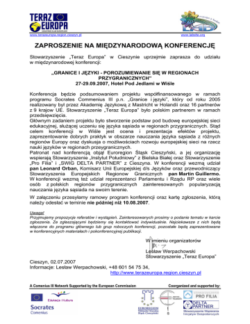 www.terazeuropa.region.cieszyn.pl www.labsite.org ZAPROSZENIE NA MIĘDZYNARODOWĄ KONFERENCJĘ Stowarzyszenie „Teraz Europa” w Cieszynie uprzejmie zaprasza do udziału w międzynarodowej konferencji: „GRANICE I JĘZYKI - POROZUMIEWANIE SIĘ W REGIONACH PRZYGRANICZNYCH” 27-29.09.2007, Hotel Pod Jedlami w Wiśle Konferencja będzie podsumowaniem projektu współfinansowanego w ramach programu Socrates Commenius III p.n. „Granice i języki”, który od roku 2005 realizowany był przez Akademię Językową z Mastricht w Holandii oraz 16 partnerów z 9 krajow UE. Stowarzyszenie „Teraz Europa” było polskim partnerem w ramach przedsięwzięcia. Głównym zadaniem projektu było stworzenie podstaw pod budowę europejskiej sieci edukacyjnej, służącej uczeniu się języka sąsiada w regionach przygranicznych. Stąd celem konferencji w Wiśle jest ocena i prezentacja efektów projektu, zaprezentowanie dobrych praktyk w obszarze nauczania języka sąsiada z różnych regionów Europy oraz dyskusja o możliwościach rozwoju europejskiej sieci na rzecz nauki języków w regionach przeygranicznych. Patronat nad konferencją objął Euroregion Śląsk Cieszyński, a jej organizację wspierają Stowarzyszenie „Instytut Południowy” z Bielska Białej oraz Stowarzyszenie „Pro Filia” i „SWIG DELTA PARTNER” z Cieszyna. W konferencji wezmą udział pan Leonard Orban, Komisarz Unii Europejskiej d/s Języków oraz przewodniczący Stowarzyszenia Europejskich Regionow Granicznych pan Martin Guillermo. W konferencji wezmą też udział reprezentanci Parlamentu i Rządu RP oraz wiele osób z polskich regionów przygranicznych zainteresowanych popularyzacją nauczania języka sąsiada na swoim terenie. W załączeniu przesyłamy ramowy program konferencji oraz kartę zgłoszenia, którą należy odesłać w teminie nie później niż 10.08.2007. Uwaga! Przyjmujemy propozycje referatów i wystąpień. Zainteresowanych prosimy o podanie tematu w karcie zgłoszenia. Ze zgłaszającymi będziemy się kontaktować indywidualnie. Najciekawsze z nich będą włączone do programu głównego lub grup roboczych konferencji, pozostałe będą zaprezentowane w konferencyjnych materiałach i pokonferencyjnej publikacji. W imieniu organizatorów Lesław Werpachowski Stowarzyszenie „Teraz Europa” Cieszyn, 02.07.2007 Informacje: Lesław Werpachowski, +48 601 54 75 34, http://www.terazeuropa.region.cieszyn.pl A Comenius III Network Supported by the European Commission Coorganized and supported by: www.terazeuropa.region.cieszyn.pl www.labsite.org LAB – PROGRAM KONFERENCJI DZIEŃ I 16.00 – 19.00 19.00 DZIEŃ II 08.30 09.00 9.15 Sesja I 9.45 10.15 Sesja II 12.00 13.00 Sesja III 14.30 17.30 DZIEŃ III 9.00 9.15 Sesja IV 10.30 10.50 12.20 13.00 Sesja zamknięcia 15.00 27 września 2007, czwartek Przyjazd uczestników Wystąpienia otwierające i kolacja 28 września 2007, piątek Rejestracja uczestników Otwarcie i powitanie Trasgraniczne komunikowanie się. Wyzwania i możliwości dla innowacji w edukacji - Ruud Halink, Akademia Językowa w Mastricht, Holandia Wyzwania dla nauczania w regionach granicznych w Polsce - Prof. zw. dr hab. Waldemar Pfeiffer – Uniwerystet Adama Mickiewicza w Poznaniu/Uniwersytet Viadrina we Franfurcie nad Odrą. Przerwa kawowa Język i kultura sasiąda - projekty edukacyjne z obszarów pogranicza – sukcesy porażki, problemy i możliwości - przedstawiciele polskich euroregionów Obiad Projekty językowe - przykłady dobrych praktyk (1) Anemone Geiger-Jaillet - Francja: pogranicze franusko-niemieckie, Bente Martinussen - Norwegia: pogranicze norwesko-rosyjskie Michaela Udriste - Rumunia: pograniczne rumuńsko-serbskie Ulrike Schwarz Niemcy: pogranicze niemiecko-holenderskie Grupy robocze – runda 1: − Budowanie polityki wsparcia dla nauczania języka sąsiada − Innowacyjne metody nauczania języka na pograniczu − Szkolenie, doskonalenie i wspieranie metodyczne i programowe nauczycieli Kolacja 29 Września 2007, sobota Wystąpienie programowe – Rola języków we współpracy transgranicznej – jak współpracować na szczeblu europejskim - Martín Guillermo Ramírez, Sekretarz Generalny Stowarzyszenia Europejskich Regionów Granicznych Projekty językowe - przykłady dobrych praktyk (2) Tuula Asikainen Finlandia: pogranicze fińsko-szwedzkie Agustin Arostegi Hiszpania: pogranicze hiszpańsko-francuskie Erika Werlen Szwajcaria: pograniczne szwajcarsko-niemiecko-francuskie Henny Roenneper – pogranicze niemieckie Terhi Tyyskä – pogranicze fińsko rosyjskie Przerwa kawowa Grupy robocze - runda 2: Wnioski i rekomendacje Obiad Podsumowanie konferencji 1. Wnioski z grup roboczych 2. Wystąpienia podsumowujące − Jan Olbrycht – Parlament Europejski − Leonard Orban - Komisarz EU d/s Wielojęzyczności 3. Wnioski z konferencji: Ruud Halink Koordynator projektu „Granice i Języki” Zamkniecie konferencji i wyjazd uczestników na wycieczkę do Cieszyna i Czeskiego Cieszyna A Comenius III Network Supported by the European Commission Coorganized and supported by: www.terazeuropa.region.cieszyn.pl www.labsite.org LAB – FORMULARZ ZŁOSZENIOWY DANE UCZESTNIKA Imię i Nazwisko: Tytuł: Organizacja: Funkcja: Adres: Telefon: Tel. komórkowy: E-mail: OPCJA 1 OPŁTA 230 PLN wyżywienie materiały konferencyjne tłumaczenie symultaniczne OPŁATA KONFERENCYJNA: OPCJA 2 OPŁATA 350 PLN 1 nocleg: 28/29.09.2007 wyżywienie: od obiadu 28.09 do kolacji 29.09.2007 materiały konferencyjne tłumaczenie symultaniczne OPCJA 3 OPŁATA 490 PLN 3 noclegi: 27/28, 28/29, 29/30. 09, wyżywienie: od kolacji 27.09 do śniadania 30.09.2007 materiały konferencyjne tłumaczenie symultaniczne Wybieram opcję nr: Opcja 1 Deklaruję wpłatę kwoty: Opcja 2 Opcja 3 230 PLN 350 zł 490 zł na rachunek bankowy organizatora (IBAN) 39 8113 0007 2001 0071 6204 0001 PREZENTACJA/WYSTĄPINIE PODCZAS KONFERENCJI: Deklaruję przesłanie TAK NIE tekstu prezentacji: Tytuł prezentacji: Ważne! Prosi