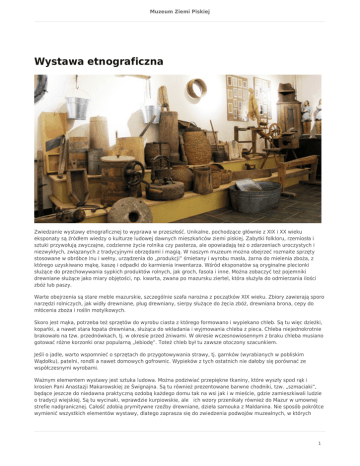 Muzeum Ziemi Piskiej Wystawa etnograficzna Zwiedzanie wystawy etnograficznej to wyprawa w przeszłość. Unikalne, pochodzące głównie z XIX i XX wieku eksponaty są źródłem wiedzy o kulturze ludowej dawnych mieszkańców ziemi piskiej. Zabytki folkloru, rzemiosła i sztuki przywołują zwyczajne, codzienne życie rolnika czy pasterza, ale opowiadają też o zdarzeniach uroczystych i niezwykłych, związanych z tradycyjnymi obrzędami i magią. W naszym muzeum można obejrzeć rozmaite sprzęty stosowane w obróbce lnu i wełny, urządzenia do „produkcji” śmietany i wyrobu masła, żarna do mielenia zboża, z którego uzyskiwano mąkę, kaszę i odpadki do karmienia inwentarza. Wśród eksponatów są oryginalne plecionki służące do przechowywania sypkich produktów rolnych, jak groch, fasola i inne. Można zobaczyć też pojemniki drewniane służące jako miary objętości, np. kwarta, zwana po mazursku ziertel, która służyła do odmierzania ilości zbóż lub paszy. Warte obejrzenia są stare meble mazurskie, szczególnie szafa narożna z początków XIX wieku. Zbiory zawierają sporo narzędzi rolniczych, jak widły drewniane, pług drewniany, sierpy służące do żęcia zbóż, drewniana brona, cepy do młócenia zboża i roślin motylkowych. Skoro jest mąka, potrzeba też sprzętów do wyrobu ciasta z którego formowano i wypiekano chleb. Są tu więc dzieżki, kopańki, a nawet stara łopata drewniana, służąca do wkładania i wyjmowania chleba z pieca. Chleba niejednokrotnie brakowało na tzw. przednówkach, tj. w okresie przed żniwami. W okresie wczesnowiosennym z braku chleba musiano gotować różne korzonki oraz popularną „lebiodę”. Toteż chleb był tu zawsze otoczony szacunkiem. Jeśli o jadle, warto wspomnieć o sprzętach do przygotowywania strawy, tj. garnków (wyrabianych w pobliskim Wądołku), patelni, rondli a nawet domowych gofrownic. Wypieków z tych ostatnich nie dałoby się porównać ze współczesnymi wyrobami. Ważnym elementem wystawy jest sztuka ludowa. Można podziwiać przepiękne tkaniny, które wyszły spod rąk i krosien Pani Anastazji Makarowskiej ze Śwignajna. Są tu również prezentowane barwne chodniki, tzw. „szmaciaki”, będące jeszcze do niedawna praktyczną ozdobą każdego domu tak na wsi jak i w mieście, gdzie zamieszkiwali ludzie o tradycji wiejskiej. Są tu wycinaki, wprawdzie kurpiowskie, ale ich wzory przenikały również do Mazur w umownej strefie nadgranicznej. Całość zdobią prymitywne rzeźby drewniane, dzieła samouka z Maldanina. Nie sposób pokrótce wymienić wszystkich elementów wystawy, dlatego zaprasza się do zwiedzenia podwojów muzealnych, w których 1 Muzeum Ziemi Piskiej każdy znajdzie interesującą siebie tematykę. 2