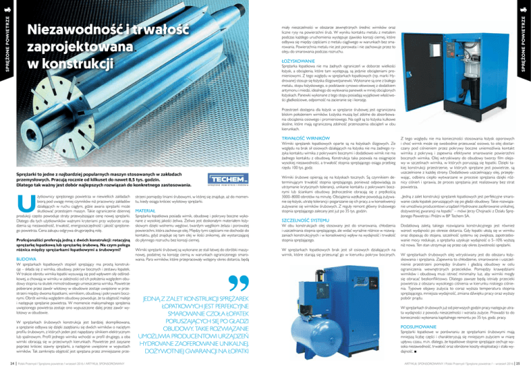 SPRĘŻONE POWIETRZE SPRĘŻONE POWIETRZE Niezawodność i trwałość zaprojektowana w konstrukcji miały nieszczelności w obszarze zewnętrznych średnic wirników oraz liczne rysy na powierzchni śrub. W wyniku kontaktu metalu z metalem podczas każdego uruchomienia występuje zjawisko korozji ciernej, które odbywa się między częściami z metalu ciągliwego w warunkach bez smarowania. Powierzchnia metalu nie jest porowata i nie zachowuje przez to oleju do smarowania podczas rozruchu. ŁOŻYSKOWANIE Sprężarka łopatkowa nie ma żadnych ograniczeń w doborze wielkości łożysk, a obciążenia, które tam występują, są jedynie obciążeniami promieniowymi. Z tego względu w sprężarkach łopatkowych (np. marki Hydrovane) stosuje się łożyska ślizgowe/panewki. Wykonane są one z białego metalu, stopu łożyskowego, o podstawie cynowo-ołowiowej z dodatkiem antymonu i miedzi, idealnego do wylewania panewek w mniej obciążonych łożyskach. Panewki wykonane z tego stopu posiadają wyjątkowe właściwości gładkościowe, odporność na zacieranie się i korozję. Przestrzeń dostępna dla łożysk w sprężarce śrubowej jest ograniczona bliskim położeniem wirników. Łożyska muszą być zdolne do absorbowania obciążenia osiowego i promieniowego. Na ogół są to łożyska kulkowe skośne, które mają ograniczoną zdolność przenoszenia obciążeń w obu kierunkach. TRWAŁOŚĆ WIRNIKÓW Wirniki sprężarek łopatkowych oparte są na łożyskach ślizgowych. Ze względu na brak sił osiowych działających na łożyska nie ma żadnego ryzyka kontaktu wirnika z pokrywami bocznymi i dodatkowo wirnik nie ma żadnego kontaktu z obudową. Konstrukcja taka pozwala na osiągnięcie wysokiej niezawodności, a trwałość stopnia sprężającego osiąga przebieg rzędu 100 tys. godz. Sprężarki to jedne z najbardziej popularnych maszyn stosowanych w zakładach przemysłowych. Pracują rocznie od kilkuset do nawet 8,5 tys. godzin. Dlatego tak ważny jest dobór najlepszych rozwiązań do konkretnego zastosowania. U żytkownicy sprężonego powietrza w niewielkich zakładach biorą pod uwagę mniej czynników niż pracownicy zakładów działających w ruchu ciągłym, gdzie awaria sprężarki może skutkować przestojem maszyn. Takie ograniczenie dziennej produkcji często powoduje straty przewyższające cenę nowej sprężarki. Dlatego dla tych użytkowników ważnymi kryteriami przy wyborze urządzenia są: niezawodność, trwałość, energooszczędność i jakość sprężonego powietrza. Cena zakupu odgrywa drugorzędną rolę. Profesjonaliści preferują jedną z dwóch konstrukcji: rotacyjną sprężarkę łopatkową lub sprężarkę śrubową. Na czym polega różnica między sprężarkami łopatkowymi a śrubowymi? BUDOWA W sprężarkach łopatkowych stopień sprężający ma prostą konstrukcję – składa się z wirnika, obudowy, pokryw bocznych i zestawu łopatek. W trakcie obrotu wirnika łopatki wysuwają się pod wpływem siły odśrodkowej, a chowają w wirniku w zależności od ich położenia względem obudowy stopnia na skutek mimośrodowego umieszczenia wirnika. Powietrze pobierane przez zawór wlotowy w obudowie zostaje uwięzione w przestrzeni między dwoma łopatkami, wirnikiem, obudową i pokrywami bocznymi. Obrót wirnika względem obudowy powoduje, że ta objętość maleje i następuje sprężanie powietrza. W momencie maksymalnego sprężenia uwięzionego powietrza zostaje ono wypuszczone dalej przez zawór wylotowy w obudowie. W sprężarkach śrubowych konstrukcja jest bardziej skomplikowana, a sprężanie odbywa się dzięki zazębianiu się dwóch wirników o naciętym profilu śrubowym, z których jeden jest napędzany silnikiem elektrycznym lub spalinowym. Profil jednego wirnika wchodzi w profil drugiego, a oba wirniki obracają się w przeciwnych kierunkach. Powietrze jest zasysane poprzez króciec ssawny sprężarki, a następnie uwięzione w wypustach wirników. Tak zamknięta objętość jest sprężana przez zmniejszanie prze24 | Polski Przemysł / Sprężone powietrze / wrzesień 2016 / ARTYKUŁ SPONSOROWANY strzeni pomiędzy liniami śrubowymi, w której się znajduje, aż do momentu, kiedy osiąga króciec wylotowy sprężarki. MATERIAŁ Sprężarka łopatkowa posiada wirnik, obudowę i pokrywy boczne wykonane z wysokiej jakości żeliwa. Żeliwo jest doskonałym materiałem łożyskowym dzięki wolnemu węglowi, twardym węglikom żelaza i porowatej powierzchni, która zachowuje olej. Między tymi częściami nie dochodzi do kontaktu, gdyż znajduje się tam olej w ilości znikomej, ale wystarczającej do płynnego rozruchu bez korozji ciernej. Wirniki sprężarki śrubowej są wykonane ze stali łatwej do obróbki maszynowej, podatnej na korozję cierną w warunkach ograniczonego smarowania. Para wirników, które przepracowały wstępny okres dotarcia, będą JEDNĄ Z ZALET KONSTRUKCJI SPRĘŻAREK ŁOPATKOWYCH JEST PERFEKCYJNE SMAROWANIE CZOŁA ŁOPATEK PORUSZAJĄCYCH SIĘ PO GŁADZI OBUDOWY. TAKIE ROZWIĄZANIE UMOŻLIWIA PRODUCENTOWI URZĄDZEŃ HYDROVANE ZAOFEROWANIE UNIKALNEJ, DOŻYWOTNIEJ GWARANCJI NA ŁOPATKI Wirniki śrubowe opierają się na łożyskach tocznych. Są czynnikiem determinującym trwałość stopnia sprężającego, ponieważ odpowiadają za utrzymanie krytycznych tolerancji, unikanie kontaktu z pokrywami bocznymi lub ściankami obudowy. Jednocześnie obracają się z prędkością 3000–8000 obrotów na minutę. Obciążenia wzdłużne powodują zużywanie się łożysk, utratę tolerancji i pogarszanie się ich pracy, a w konsekwencji zużywanie się wirników śrubowych. Z reguły remont główny śrubowego stopnia sprężającego zalecany jest już po 35 tys. godzin. SZCZELNOŚĆ SYSTEMU W obu konstrukcjach olej stosowany jest do smarowania, chłodzenia i uszczelniania stopnia sprężającego, ale widać wyraźnie różnice w rozwiązaniach konstrukcyjnych i w konsekwencji wpływ na wydajność i trwało
