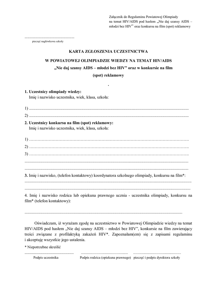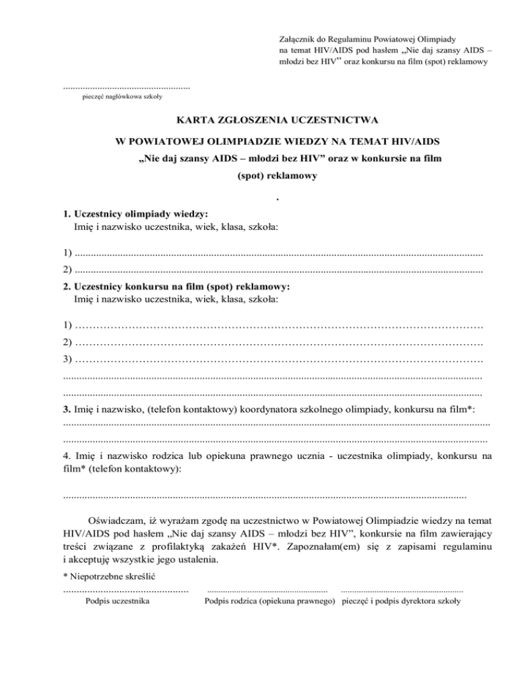 Załącznik do Regulaminu Powiatowej Olimpiady na temat HIV/AIDS pod hasłem „Nie daj szansy AIDS – młodzi bez HIV” oraz konkursu na film (spot) reklamowy .................................................... pieczęć nagłówkowa szkoły KARTA ZGŁOSZENIA UCZESTNICTWA W POWIATOWEJ OLIMPIADZIE WIEDZY NA TEMAT HIV/AIDS „Nie daj szansy AIDS – młodzi bez HIV” oraz w konkursie na film (spot) reklamowy . 1. Uczestnicy olimpiady wiedzy: Imię i nazwisko uczestnika, wiek, klasa, szkoła: 1) ......................................................................................................................................................... 2) ......................................................................................................................................................... 2. Uczestnicy konkursu na film (spot) reklamowy: Imię i nazwisko uczestnika, wiek, klasa, szkoła: 1) ……………………………………………………………………………………………………. 2) ……………………………………………………………………………………………………. 3) ……………………………………………………………………………………………………. ............................................................................................................................................................. ............................................................................................................................................................. 3. Imię i nazwisko, (telefon kontaktowy) koordynatora szkolnego olimpiady, konkursu na film*: ................................................................................................................................................................ ............................................................................................................................................................... 4. Imię i nazwisko rodzica lub opiekuna prawnego ucznia - uczestnika olimpiady, konkursu na film* (telefon kontaktowy): ....................................................................................................................................................... Oświadczam, iż wyrażam zgodę na uczestnictwo w Powiatowej Olimpiadzie wiedzy na temat HIV/AIDS pod hasłem „Nie daj szansy AIDS – młodzi bez HIV”, konkursie na film zawierający treści związane z profilaktyką zakażeń HIV*. Zapoznałam(em) się z zapisami regulaminu i akceptuję wszystkie jego ustalenia. * Niepotrzebne skreślić ............................................... Podpis uczestnika ...................................................... ....................................................... Podpis rodzica (opiekuna prawnego) pieczęć i podpis dyrektora szkoły