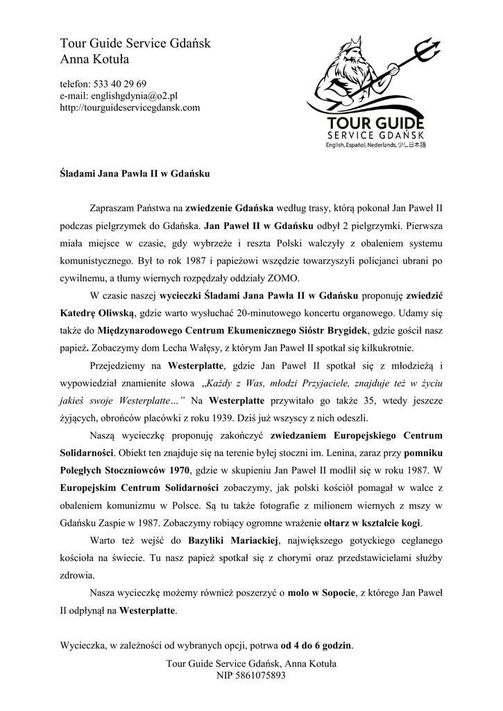 Tour Guide Service Gdańsk Anna Kotuła telefon: 533 40 29 69 e-mail: [email protected] http://tourguideservicegdansk.com Śladami Jana Pawła II w Gdańsku Zapraszam Państwa na zwiedzenie Gdańska według trasy, którą pokonał Jan Paweł II podczas pielgrzymek do Gdańska. Jan Paweł II w Gdańsku odbył 2 pielgrzymki. Pierwsza miała miejsce w czasie, gdy wybrzeże i reszta Polski walczyły z obaleniem systemu komunistycznego. Był to rok 1987 i papieżowi wszędzie towarzyszyli policjanci ubrani po cywilnemu, a tłumy wiernych rozpędzały oddziały ZOMO. W czasie naszej wycieczki Śladami Jana Pawła II w Gdańsku proponuję zwiedzić Katedrę Oliwską, gdzie warto wysłuchać 20-minutowego koncertu organowego. Udamy się także do Międzynarodowego Centrum Ekumenicznego Sióstr Brygidek, gdzie gościł nasz papież. Zobaczymy dom Lecha Wałęsy, z którym Jan Paweł II spotkał się kilkukrotnie. Przejedziemy na Westerplatte, gdzie Jan Paweł II spotkał się z młodzieżą i wypowiedział znamienite słowa „Każdy z Was, młodzi Przyjaciele, znajduje też w życiu jakieś swoje Westerplatte…” Na Westerplatte przywitało go także 35, wtedy jeszcze żyjących, obrońców placówki z roku 1939. Dziś już wszyscy z nich odeszli. Naszą wycieczkę proponuję zakończyć zwiedzaniem Europejskiego Centrum Solidarności. Obiekt ten znajduje się na terenie byłej stoczni im. Lenina, zaraz przy pomniku Poległych Stoczniowców 1970, gdzie w skupieniu Jan Paweł II modlił się w roku 1987. W Europejskim Centrum Solidarności zobaczymy, jak polski kościół pomagał w walce z obaleniem komunizmu w Polsce. Są tu także fotografie z milionem wiernych z mszy w Gdańsku Zaspie w 1987. Zobaczymy robiący ogromne wrażenie ołtarz w kształcie kogi. Warto też wejść do Bazyliki Mariackiej, największego gotyckiego ceglanego kościoła na świecie. Tu nasz papież spotkał się z chorymi oraz przedstawicielami służby zdrowia. Nasza wycieczkę możemy również poszerzyć o molo w Sopocie, z którego Jan Paweł II odpłynął na Westerplatte. Wycieczka, w zależności od wybranych opcji, potrwa od 4 do 6 godzin. Tour Guide Service Gdańsk, Anna Kotuła NIP 5861075893 Ceny biletów wstępu na trasie Śladami Jana Pawła II w Gdańsku (aktualne w marcu 2015): Katedra Oliwska: wstęp bezpłatny, koncert organowy – bilet normalny 4,5 zł, bilet ulgowy 2,5 zł Bazylika Mariacka, wstęp płatny od kwietnia do listopada: bilet normalny – 4 zł, bilet ulgowy – 2 zł Europejskie Centrum Solidarności: bilet normalny – 17 zł, bilet ulgowy – 13 zł. Bilety dla grup minimum 10-osobowych: normalny – 15 zł, ulgowy – 11 zł. Wcześniejsza rezerwacja jest konieczna. Molo w Sopocie: bilet normalny – 7,5 zł, bilet ulgowy – 4 zł Po trasie Śladami Jana Pawła II w Gdańsku oprowadza licencjonowany przewodnik po Gdańsku, Gdyni i Sopocie Anna Kotuła. Dostępne języki: polski, angielski, hiszpański i niderlandzki (holenderski). Tour Guide Service Gdańsk, Anna Kotuła NIP 5861075893