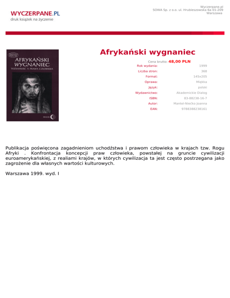 Wyczerpane.pl SOWA Sp. z o.o. ul. Hrubieszowska 6a 01-209 Warszawa Afrykański wygnaniec Cena brutto: Rok wydania: 48,00 PLN 1999 Liczba stron: 368 Format: 145x205 Oprawa: Miękka Język: polski Wydawnictwo: Akademickie Dialog ISBN: 83-88238-16-7 Autor: Mantel-Niećko Joanna EAN: 9788388238161 Publikacja poświęcona zagadnieniom uchodźstwa i prawom człowieka w krajach tzw. Rogu Afryki . Konfrontacja koncepcji praw człowieka, powstałej na gruncie cywilizacji euroamerykańskiej, z realiami krajów, w których cywilizacja ta jest często postrzegana jako zagrożenie dla własnych wartości kulturowych. Warszawa 1999. wyd. I