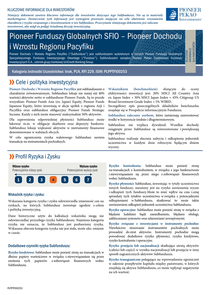 Pioneer Dochodu i Wzrostu Regionu Pacyfiku ("Subfundusz") jest subfunduszem wydzielonym w ramach Pioneer Funduszy Globalnych