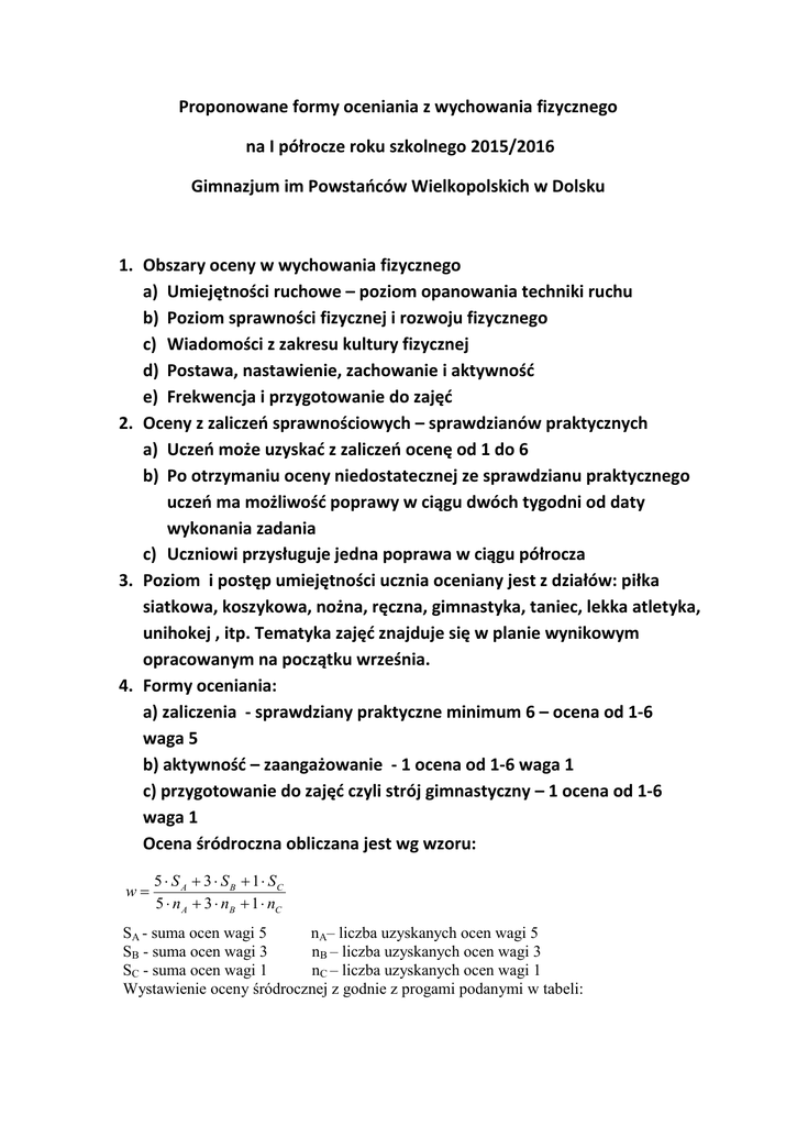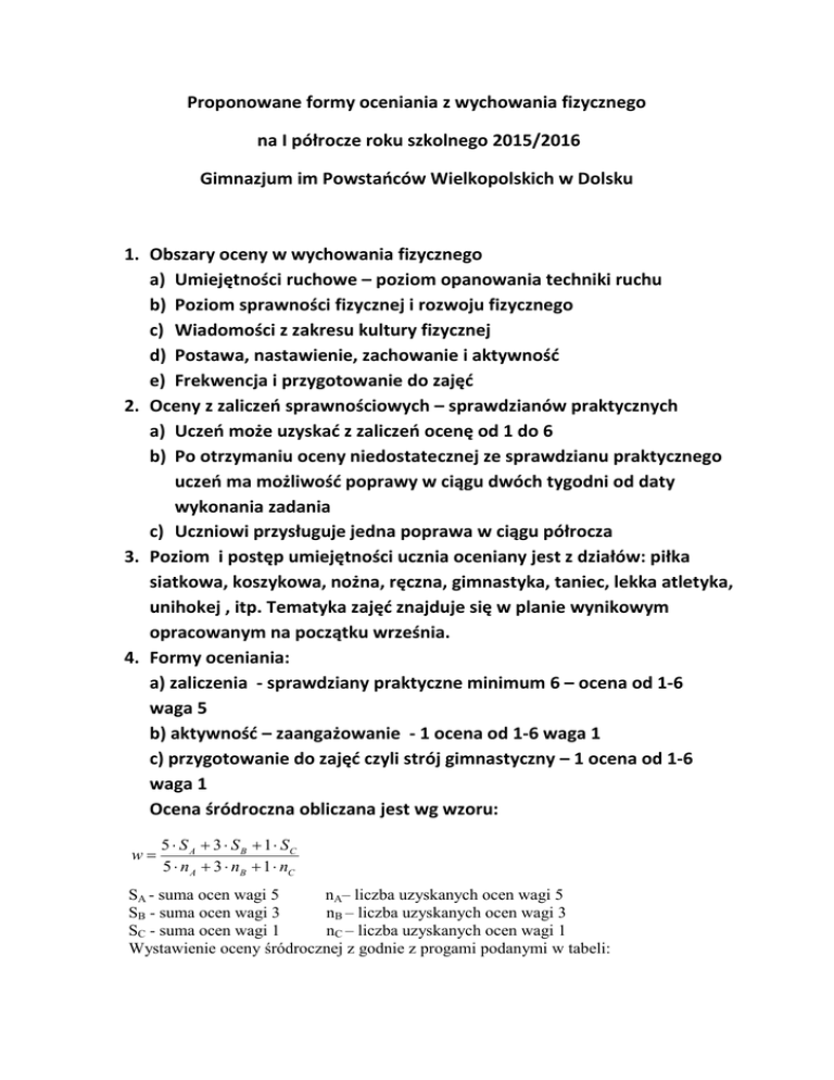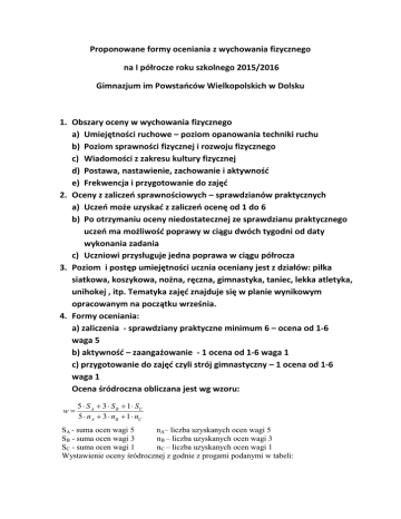 Proponowane formy oceniania z wychowania fizycznego na I półrocze roku szkolnego 2015/2016 Gimnazjum im Powstańców Wielkopolskich w Dolsku 1. Obszary oceny w wychowania fizycznego a) Umiejętności ruchowe – poziom opanowania techniki ruchu b) Poziom sprawności fizycznej i rozwoju fizycznego c) Wiadomości z zakresu kultury fizycznej d) Postawa, nastawienie, zachowanie i aktywność e) Frekwencja i przygotowanie do zajęć 2. Oceny z zaliczeń sprawnościowych – sprawdzianów praktycznych a) Uczeń może uzyskać z zaliczeń ocenę od 1 do 6 b) Po otrzymaniu oceny niedostatecznej ze sprawdzianu praktycznego uczeń ma możliwość poprawy w ciągu dwóch tygodni od daty wykonania zadania c) Uczniowi przysługuje jedna poprawa w ciągu półrocza 3. Poziom i postęp umiejętności ucznia oceniany jest z działów: piłka siatkowa, koszykowa, nożna, ręczna, gimnastyka, taniec, lekka atletyka, unihokej , itp. Tematyka zajęć znajduje się w planie wynikowym opracowanym na początku września. 4. Formy oceniania: a) zaliczenia - sprawdziany praktyczne minimum 6 – ocena od 1-6 waga 5 b) aktywność – zaangażowanie - 1 ocena od 1-6 waga 1 c) przygotowanie do zajęć czyli strój gimnastyczny – 1 ocena od 1-6 waga 1 Ocena śródroczna obliczana jest wg wzoru: w 5 S A 3 S B 1 SC 5 n A 3 nB 1 nC SA - suma ocen wagi 5 nA– liczba uzyskanych ocen wagi 5 SB - suma ocen wagi 3 nB – liczba uzyskanych ocen wagi 3 SC - suma ocen wagi 1 nC – liczba uzyskanych ocen wagi 1 Wystawienie oceny śródrocznej z godnie z progami podanymi w tabeli: warunek ocena 0 ≤ w < 1,5 ndst 1,5 ≤ w < 1,75 ndst+ 1,75 ≤ w < 2,0 dop - 2,0 ≤ w < 2,5 dop 2,5 ≤ w < 2,75 dop+ 2,75 ≤ w < 3,0 dst - 3,0 ≤ w < 3,5 dst 3,5 ≤ w < 3,75 dst+ 3,75 ≤ w < 4,0 db - 4,0 ≤ w < 4,5 db 4,5 ≤ w < 4,75 db+ 4,75 ≤ w < 5,0 bdb - 5,0 ≤ w < 5,5 bdb 5,5 ≤ w < 5,75 bdb+ 5,75 ≤ w < 6,0 cel - w = 6,0 cel Uczeń może uzyskać dodatkowe oceny z przedmiotu a) Za udział w zawodach sportowych poziom ocena waga szkolny i gminny 5 1 powiatowy 5 1 rejonowy/wojewódzki 6 1 ogólnopolski 6 1 międzynarodowy 6 3 a) za uzyskaną w konkursie lokatę, tj. miejsca 1.,2.,3. lub znaczące osiągnięcia uczeń otrzymuje - ocena 6, waga 3. Uczeń ma prawo poprawić tylko jedną wybraną przez siebie formę zaliczenia sprawnościowego ( lepsza ocena wliczana jest do średniej) Marta Dworczyk