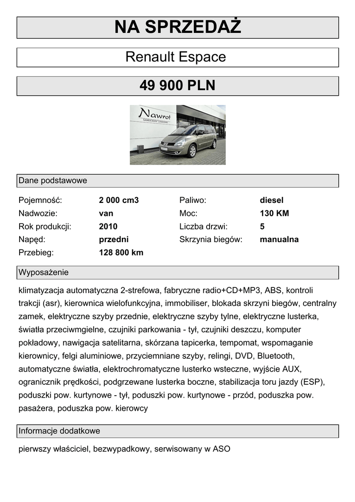 NA SPRZEDAŻ Renault Espace 49 900 PLN Dane podstawowe Pojemność: 2 000 cm3 Paliwo: diesel Nadwozie: van Moc: 130 KM Rok produkcji: 2010 Liczba drzwi: 5 Napęd: przedni Skrzynia biegów: manualna Przebieg: 128 800 km Wyposażenie klimatyzacja automatyczna 2-strefowa, fabryczne radio+CD+MP3, ABS, kontroli trakcji (asr), kierownica wielofunkcyjna, immobiliser, blokada skrzyni biegów, centralny zamek, elektryczne szyby przednie, elektryczne szyby tylne, elektryczne lusterka, światła przeciwmgielne, czujniki parkowania - tył, czujniki deszczu, komputer pokładowy, nawigacja satelitarna, skórzana tapicerka, tempomat, wspomaganie kierownicy, felgi aluminiowe, przyciemniane szyby, relingi, DVD, Bluetooth, automatyczne światła, elektrochromatyczne lusterko wsteczne, wyjście AUX, ogranicznik prędkości, podgrzewane lusterka boczne, stabilizacja toru jazdy (ESP), poduszki pow. kurtynowe - tył, poduszki pow. kurtynowe - przód, poduszka pow. pasażera, poduszka pow. kierowcy Informacje dodatkowe pierwszy właściciel, bezwypadkowy, serwisowany w ASO Opis Opis pojazdu Samochód w 100% bezwypadkowy. Stan Techniczny idealny. Pełna historia serwisowa do wglądu. WYPOSAŻENIE: - kolorowa nawigacja - DVD + monitory LCD w zagłówkach - klimatyzacja automatyczna dwu strefowa, - system głośnomówiący Bluetooth do telefonu - tylne siedzenia z wbudowanymi pasami bezpieczeństwa, składane do położenia stolika, mocowane na prowadnicach, przystosowane do mocowania fotelików dziecięcych ISOFIX - pół skórzana tapicerka - centralny zamek z pilota - bez kluczykowa obsługa hands free - światła przeciwmgłowe - czujniki parkowania - poprzeczki dachowe - podgrzewane lusterka - elektryczna regulacja lusterek - elektrycznie otwierane szyby - przyciemniane szyby - regulacja wysokości świateł drogowych - komputer pokładowy - skórzana kierownica - sterowanie radiem przy kierownicy - kierownica regulowana w dwóch płaszczyznach - blokada kierownicy - skrzynia 6- cio biegowa - radio CD/MP3 - airbag x 8 sztuk - tempomat - limiter prędkości - regulacja wysokości fotela kierowcy - uchwyty na napoje - ESP (układ kontroli toru jazdy) + układ kontroli podsterowności + ABS (układ zapobiegania poślizgowi kół przy ruszaniu) - immobiliser - wyłącznik poduszki powietrznej pasażera z przodu - zagłówki z regulacją wysokości - 3 gniazda 12V - atermiczna przednia szyba - automatyczny hamulec postojowy, elektromechaniczny - felgi aluminiowe 17'' Szczegółowe informacje : Błażej Lemanik 501 557 255 blemanik(malpka)nawrot.pl