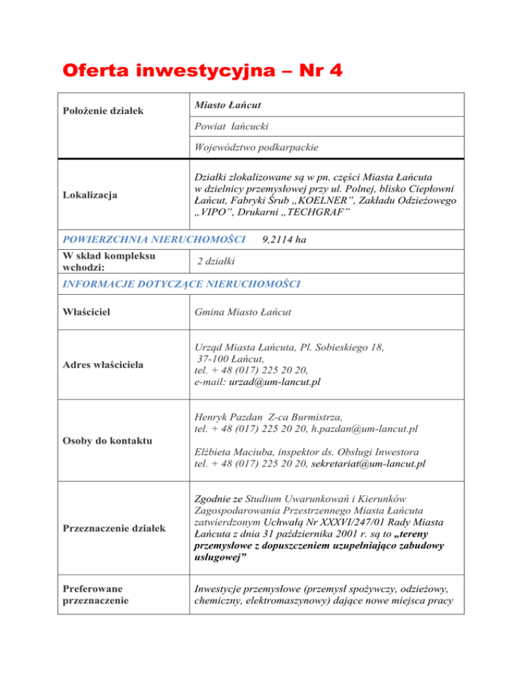 Oferta inwestycyjna – Nr 4 Położenie działek Miasto Łańcut Powiat łańcucki Województwo podkarpackie Lokalizacja Działki zlokalizowane są w pn. części Miasta Łańcuta w dzielnicy przemysłowej przy ul. Polnej, blisko Ciepłowni Łańcut, Fabryki Śrub „KOELNER”, Zakładu Odzieżowego „VIPO”, Drukarni „TECHGRAF” POWIERZCHNIA NIERUCHOMOŚCI W skład kompleksu wchodzi: 9,2114 ha 2 działki INFORMACJE DOTYCZĄCE NIERUCHOMOŚCI Właściciel Gmina Miasto Łańcut Adres właściciela Urząd Miasta Łańcuta, Pl. Sobieskiego 18, 37-100 Łańcut, tel. + 48 (017) 225 20 20, e-mail: [email protected] Henryk Pazdan Z-ca Burmistrza, tel. + 48 (017) 225 20 20, [email protected] Osoby do kontaktu Elżbieta Maciuba, inspektor ds. Obsługi Inwestora tel. + 48 (017) 225 20 20, [email protected] Przeznaczenie działek Zgodnie ze Studium Uwarunkowań i Kierunków Zagospodarowania Przestrzennego Miasta Łańcuta zatwierdzonym Uchwałą Nr XXXVI/247/01 Rady Miasta Łańcuta z dnia 31 października 2001 r. są to „tereny przemysłowe z dopuszczeniem uzupełniająco zabudowy usługowej” Preferowane przeznaczenie Inwestycje przemysłowe (przemysł spożywczy, odzieżowy, chemiczny, elektromaszynowy) dające nowe miejsca pracy Forma nabycia Preferowana sprzedaż prawa użytkowania wieczystego terenu na rzecz inwestora w drodze przetargu nieograniczonego, wg zasady – 25% ceny wylicytowanej, reszta w ratach rocznych rozłożona na 40 lat. W uzasadnionych potrzebach inwestora dopuszcza się sprzedaż nieruchomości na własność w drodze przetargu nieograniczonego. Wartość nieruchomości określa każdorazowo rzeczoznawca. Orientacyjna cena: ok. 6 tys. za 1 ar Sytuacja prawnie uregulowana – Nr KW RZ1A/00032515/8, Nr działki 5203 Nr KW 34352, Nr działki 5787 CHARAKTERYSTYKA TERENÓW Klasa gruntów wraz z powierzchnią Ł II (łąki trwałe) – 2,0415 ha R III a (grunty orne) – 6,3677 ha R III b (grunty orne) – 0,7580 ha W (rowy) – 0,0442 ha Czy były prowadzone Nie badania geologiczne Ryzyko wystąpienia zalań Nie lub obsunięć terenu Przeszkody podziemne Przeszkody występujące na powierzchni terenu Budynki i zabudowania na terenie Nie Brak Brak POŁĄCZENIA KOMUNIKACYJNE Droga dojazdowa do terenu Autostrada/droga krajowa/ droga wojewódzka Droga gminna asfaltowa, 4-metrowej szerokości, nośności - 110 kN Prowadzone prace projektowe związane z przebudową ulicy Autostrada w odległości ok. 3 km (dostęp przez wjazd w węźle Łańcut w Woli Małej z drogi Nr 877) Droga krajowa Nr 4 (E 40) Jędrzychowice-Korczowa w odległości ok. 3 km Droga wojewódzka 881 (ul. Kraszewskiego) w odległości ok.1 km Droga wojewódzka Nr 877 Naklik-Leżajsk-Szklary w odległości 1,5 km Kolej Najbliższe lotnisko międzynarodowe Najbliższe miasto wojewódzkie Linia kolejowa E- 30 Zgorzelec – Medyka Najbliższa stacja kolejowa w Łańcucie w odległości ok. 1 km Bocznica kolejowa - dostęp w bezpośredniej odległości Jasionka/koło Rzeszowa w odległości ok. 15 km Rzeszów w odległości ok. 20 km ISTNIEJĄCA INFRASTRUKTURA NA TERENIE Miasto zapewnia dostęp do sieci wodociągowej, kanalizacji sanitarnej, kanalizacji deszczowej, wykona drogę wewnętrzną. Dysponenci sieci gazowej i elektrycznej deklarują zabezpieczenie gazu i energii elektrycznej stosownie do potrzeb przedłożonych przez inwestorów.