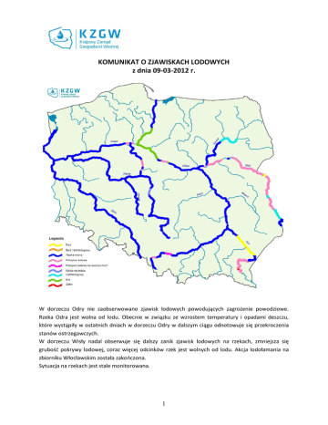 KOMUNIKAT O ZJAWISKACH LODOWYCH z dnia 09-03-2012 r. W dorzeczu Odry nie zaobserwowano zjawisk lodowych powodujących zagrożenie powodziowe. Rzeka Odra jest wolna od lodu. Obecnie w związku ze wzrostem temperatury i opadami deszczu, które wystąpiły w ostatnich dniach w dorzeczu Odry w dalszym ciągu odnotowuje się przekroczenia stanów ostrzegawczych. W dorzeczu Wisły nadal obserwuje się dalszy zanik zjawisk lodowych na rzekach, zmniejsza się grubość pokrywy lodowej, coraz więcej odcinków rzek jest wolnych od lodu. Akcja lodołamania na zbiorniku Włocławskim została zakończona. Sytuacja na rzekach jest stale monitorowana. 1 W związku zanikiem zjawisk lodowych na rzekach oraz zakończeniem akcji lodołamania, Krajowy Zarząd Gospodarki Wodnej zawiesza przygotowywanie komunikatów o zjawiskach lodowych. Dolna Wisła W dniu dzisiejszym w regionie wodnym Dolnej Wisły nie zaobserwowano zjawisk lodowych powodujących zagrożenie powodziowe. Na odcinku od zapory we Włocławek do ok. 846 km (ok. 10 km poniżej Grudziądza) spływa kra uruchomiona przez lodołamanie na zbiorniku Włocławek. Zagrożenie nie występuje. Lodołamacz Lew stacjonuje w Fordonie (w stanie rezerwy), Wydra i Lemur w Chełmnie (w stanie rezerwy), Mors i Foka w Grudziądzu (w stanie rezerwy) a Żbik w Przegalinie (w stanie rezerwy). Lodołamacze Orka i Rekin pozostają w stanie pogotowania w rejonie mostu w Kwidzynie (ochrona mostu). Środkowa Wisła W ciągu doby zaobserwowano dalsze zanikanie zjawisk lodowych na rzekach. Stopniowo zmniejsza się zasięg zjawisk lodowych na Narwi, Bugu i Wiśle. Aktualnie sytuacja jest stabilna, nie stwarzająca bezpośredniego zagrożenia. Wszystkie potencjalnie miejsca zatorogenne są pod stałą obserwacją. W dniu wczorajszym, 8 marca br., o godz. 17:00 zakończono akcję lodołamania na zbiorniku Włocławek. W dniu dzisiejszym (9 marca br.) sześć lodołamaczy (i Gepard) stacjonuje przy stopniu wodnym we Włocławku. Pięć lodołamaczy pozostaje w stanie rezerwy (Kangur, Basior, Niedźwiedź, Bawół, Jaguar) a lodołamacz Gepard jest w stanie awarii. W ciągu ostatniej doby stany wody na rzekach w regionie Wisły środkowej układały się głównie w strefie stanów średnich i wysokich. Na głównych rzekach regionu zaobserwowano spadki stanów wody oraz lokalne stabilizację. W regionie wodnym Środkowej Wisły nie zaobserwowano stanów alarmowych. Przekroczenie stanów ostrzegawczych zanotowano na Bugu w Dorohusku (o 69 cm) i w Strzyżowie (o 24 cm), na Krznie w Malowej Górze (o 18 cm). Górna Wisła W związku z nocnymi przymrozkami na południu Polski sytuacja lodowa jest stabilna. Nie prognozuje się rozwoju sytuacji związanej ze zlodzeniem rzek, która mogłaby powodować zagrożenie powodziowe. Przy utrzymujących się obecnie warunkach pogodowych zjawiska lodowe stopniowo zanikają. Spiętrzenia lodowe na Sanie, Jasionce, Łososinie i Popradzie utrzymują się nadal w miejscach wskazanych w poprzednich komunikatach. Spiętrzenie na Wisłoku ustąpiło, występuje jedynie 2 zlodzenie zbiornika Rzeszów. W chwili obecnej powstałe spiętrzenia nie stwarzają zagrożenia i są monitorowane na bieżąco przez służby terenowe RZGW. Mała Wisła Sytuacja hydrologiczna jest stabilna. Brak zagrożenia powodziowego. Rzeka Wisła jest wolna od lodu, z wyjątkiem zbiornika Goczałkowice, na większości powierzchni którego występuje pokrywa lodowa. Odra W dorzeczu Odry nie zaobserwowano zjawisk lodowych powodujących zagrożenie powodziowe. Rzeka Odra jest wolna od lodu. Pokrywa lodowa o grubości do 8 cm występuje jedynie na kanale żeglugowym (nawigacyjnym) we Wrocławiu, w kanałach przyśluzowych i częściowo na odcinku od Kędzierzyna-Koźla do miejscowości Lipki (od 98,6 km do 216,42 km). Częściowa pokrywa lodowa utrzymuje się na zbiornikach Topola, Kozielno, Otmuchów, Nysa, Bukówka, Dobromierz, Sosnówka i Turawa. W dalszym ciągu odnotowuje się przekroczenia stanów ostrzegawczych w regionie Środkowej Odry, jednak ich ilość się zmniejsza. Stan ostrzegawczy przekroczony jest na 10 wodowskazach: sześciu na Odrze, jednym na Kaczawie, jednym na Baryczy, dwóch na Bobrze. Nie zaobserwowano przekroczenia stanów alarmowych. Zamknięta dla żeglugi jest cała Odra w administracji RZGW we Wrocławiu. W dniu dzisiejszym lodołamacz „Borsuk” stacjonuje w górnym awanporcie w Brzegu Dolnym. Urządzenia zrzutowe jazów odrzańskich są drożne. Warta Rzeka Warta jest wolna od zjawisk lodowych, z wyjątkiem zbiorników Jeziorsko i Poraj oraz dwukilometrowego odcinka w Zawierciu. Na Prośnie nie występują zjawiska lodowe. Na Drodze Wodnej Noteć cienka pokrywa lodowa utrzymuje się na Kanale Ślesińskim i Bydgoskim, w okolicach śluzy Dębinek (na odcinku ok. 600 m), a także na jeziorze Gopło. Lodołamacz Lis pozostaje w gotowości w odcinku ujściowym (km 4+000) rzeki Warty. Stany wody w regionie wodnym Warty wykazują ogólną tendencję spadkową. Nadal przekroczony jest stan ostrzegawczy na wodowskazie w Kostrzynie. Lokalnie zaobserwowano niewielki wzrost stanów wody na Noteci i Warcie. Nie zaobserwowano zagrożeń związanych z podwyższonymi stanami wód. ZBIORNIKI Wszystkie zbiorniki retencyjne w dorzeczu Odry, Wisły, posiadają wolne pojemności powodziowe, znacznie większe niż wymagane instrukcjami gospodarowania wodą. Jedynie zbiornik Nysa, zbiornik 3 Otmuchów i zbiornik Pilchowice znajdują się nieznacznie w strefie piętrzenia pojemności powodziowej, nie powoduje to jednak zagrożenia. Zbiorniki retencyjne nadal gromadzą nadmiar dopływającej wody. Odnotowano zmniejszenie dopływu do zbiorników. Suche zbiorniki przeciwpowodziowe nie piętrzą wody. Komunikat o zjawiskach lodowych został opracowany na podstawie danych z regionalnych zarządów gospodarki wodnej (RZGW) przez: Aleksandrę Seliga-Piórkowską Wydział Ochrony Przeciwpowodziowej Krajowy Zarząd Gospodarki Wodnej Tel. 22 37 20 256 4