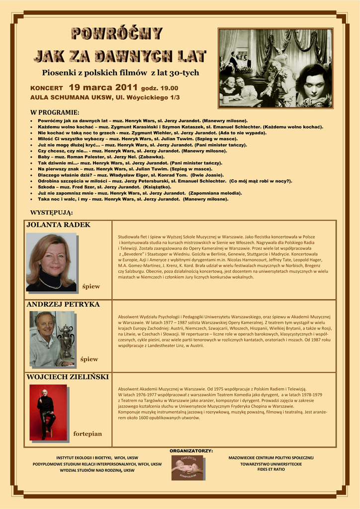 Piosenki z polskich filmów z lat 30-tych KONCERT 19 marca 2011 godz. 19.00 AULA SCHUMANA UKSW, Ul. Wóycickiego 1/3 W PROGRAMIE: Powróćmy jak za dawnych lat – muz. Henryk Wars, sł. Jerzy Jurandot. (Manewry miłosne). Każdemu wolno kochać – muz. Zygmunt Karasiński i Szymon Kataszek, sł. Emanuel Schlechter. (Każdemu wolno kochać). Nie kochać w taką noc to grzech - muz. Zygmunt Wiehler, sł. Jerzy Jurandot. (Ada to nie wypada). Miłość Ci wszystko wybaczy – muz. Henryk Wars, sł. Julian Tuwim. (Szpieg w masce). Już nie mogę dłużej kryć... – muz. Henryk Wars, sł. Jerzy Jurandot. (Pani minister tańczy). Czy chcesz, czy nie... - muz. Henryk Wars, sł. Jerzy Jurandot. (Manewry miłosne). Baby – muz. Roman Palester, sł. Jerzy Nel. (Zabawka). Tak dziwnie mi...- muz. Henryk Wars, sł. Jerzy Jurandot. (Pani minister tańczy). Na pierwszy znak – muz. Henryk Wars, sł. Julian Tuwim. (Szpieg w masce). Dlaczego właśnie dziś? – muz. Władysław Eiger, sł. Konrad Tom. (Dwie Joasie). Odrobina szczęścia w miłości – muz. Jerzy Petersburski, sł. Emanuel Schlechter. (Co mój mąż robi w nocy?). Szkoda – muz. Fred Szer, sł. Jerzy Jurandot. (Książątko). Już nie zapomnisz mnie - muz. Henryk Wars, sł. Jerzy Jurandot. (Zapomniana melodia). Taka noc i walc, i my - muz. Henryk Wars, sł. Jerzy Jurandot. (Manewry miłosne). WYSTĘPUJĄ: JOLANTA RADEK Studiowała flet i śpiew w Wyższej Szkole Muzycznej w Warszawie. Jako flecistka koncertowała w Polsce i kontynuowała studia na kursach mistrzowskich w Sienie we Włoszech. Nagrywała dla Polskiego Radia i Telewizji. Została zaangażowana do Opery Kameralnej w Warszawie. Przez wiele lat współpracowała z „Bevedere” i Staatsoper w Wiedniu. Gościła w Berlinie, Genewie, Stuttgarcie i Madrycie. Koncertowała w Europie, Azji i Ameryce z wybitnymi dyrygentami m.in. Nicolas Harnoncourt, Jeffrey Tate, Leopold Hager, M.A. Gomez-Martinez, J. Krenz, K. Kord. Brała udział w wielu festiwalach muzycznych w Norbisch, Bregenz czy Salzburgu. Obecnie, poza działalnością koncertową, jest docentem na uniwersytetach muzycznych w wielu miastach w Niemczech i członkiem Jury licznych konkursów wokalnych. śpiew ANDRZEJ PETRYKA Absolwent Wydziału Psychologii i Pedagogiki Uniwersytetu Warszawskiego, oraz śpiewu w Akademii Muzycznej w Warszawie. W latach 1977 – 1987 solista Warszawskiej Opery Kameralnej. Z teatrem tym wystąpił w wielu krajach Europy Zachodniej: Austrii, Niemczech, Szwajcarii, Włoszech, Hiszpanii, Wielkiej Brytanii, a także w Rosji, na Litwie, w Czechach i Słowacji. W repertuarze – liczne role w operach barokowych, klasycystycznych i współczesnych, cykle pieśni, oraz wiele partii tenorowych w rozlicznych kantatach, oratoriach i mszach. Od 1987 roku współpracuje z Landestheater Linz, w Austrii. śpiew WOJCIECH ZIELIŃSKI Absolwent Akademii Muzycznej w Warszawie. Od 1975 współpracuje z Polskim Radiem i Telewizją. W latach 1976-1977 współpracował z warszawskim Teatrem Komedia jako dyrygent, a w latach 1978-1979 z Teatrem na Targówku w Warszawie jako aranżer, kompozytor i dyrygent. Prowadzi zajęcia w zakresie jazzowego kształcenia słuchu w Uniwersytecie Muzycznym Fryderyka Chopina w Warszawie. Komponuje muzykę instrumentalną jazzową i rozrywkową, muzykę poważną, filmową i teatralną. Jest aranżerem około 1600 opublikowanych utworów. fortepian ORGANIZATORZY: INSTYTUT EKOLOGII I BIOETYKI, WFCH, UKSW PODYPLOMOWE STUDIUM RELACJI INTERPERSONALNYCH, WFCH, UKSW WYDZIAŁ STUDIÓW NAD RODZINĄ, UKSW MAZOWIECKIE CENTRUM POLITYKI SPOŁECZNEJ TOWARZYSTWO UNIWERSYTECKIE FIDES ET RATIO