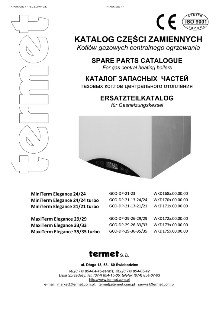 K-xxx-2014-ELEGANCE K-xxx:2014 KATALOG CZĘŚCI ZAMIENNYCH Kotłów gazowych centralnego ogrzewania SPARE PARTS CATALOGUE For gas central heating boilers КАТАЛОГ ЗАПАСНЫХ ЧАСТЕЙ газовых котлов центрального отопления ERSATZTEILKATALOG für Gasheizungskessel MiniTerm Elegance 24/24 MiniTerm Elegance 24/24 turbo MiniTerm Elegance 21/21 turbo GCO-DP-21-23 GCO-DP-21-13-24/24 GCO-DP-21-13-21/21 WKD168x.00.00.00 WKD170x.00.00.00 WKD171x.00.00.00 MaxiTerm Elegance 29/29 MaxiTerm Elegance 33/33 MaxiTerm Elegance 35/35 turbo GCO-DP-29-26-29/29 GCO-DP-29-26-33/33 GCO-DP-29-36-35/35 WKD172x.00.00.00 WKD173x.00.00.00 WKD175x.00.00.00 s.a. ul. Długa 13, 58-160 Świebodzice tel.(0 74) 854-04-46-serwis; fax.(0 74) 854-05-42 Dział Sprzedaży: tel. (074) 854-15-05; telefax (074) 854-07-03 http://www.termet.com.pl e-mail: [email protected], [email protected] [email protected] K-xxx-2014-ELEGANCE K-xxx:2014 WPROWADZENIE Katalog części zamiennych kotła grzewczego przeznaczony jest głównie dla sprzedawców i punktów usługowych zajmujących się zamawianiem i rozprowadzaniem części, naprawą i konserwacją kotła w okresie gwarancyjnym i pogwarancyjnym. Katalog zawiera rysunek zestawieniowy kotła na którym pokazane są jego części i zespoły ich położenie i sposób zamocowania w wyrobie. Każda część na rysunku oznaczona jest numerem (pozycją), pod którym w odpowiedniej tabeli podawane są: nazwa, nr rysunku oraz opis miejsca zamontowania. Te części, których nie można było pokazać na rysunku występują w tabelach pod odpowiednią liczba porządkową. Przy zamawianiu określonych części należy powołać się na niniejszy katalog podając pełną nazwę części lub zespołu oraz nr rysunku. INTRODUCTION Spare parts catalogue is dedicated mainly for salesmen and servicing stations that deal with ordering and selling spare parts for boilers as well as repairing and making all maintenance operations of boilers during guarantee period and after it. Spare parts catalogue includes the assembly drawing of the boiler where its components, assemblies and their localisation and way of its fastening in the product are presented on. Every spare part on the drawing has its own number (item), which is stated in a proper table with a name of a part, its drawing number and a description of the a place where a component is installed in. The parts that could not be presented on the drawing are listed in tables below the proper ordinal number. To order a part it is necessary to refer to this Spare Parts Catalogue and give a full name of a spare part or its drawing number. ВВЕДЕНИЕ Каталог запасных частей газовых котлов центрального отоплени предназначен прежде всего для продавцов и фирм занимающихся сервисом, ремонтом, консервацией в течении гарантийного и после гарантийного срока. В каталоге находятся сборочный чертёж который указывает узлы и элементы котла, их расположение и метод крепления в котле. Кажлая часть на сборочном чертеже обозначена номером (позиция) под котором в соответствующей табели находится: наименоване, номер чертежа, описание места установления и вид. Части которых не возможно указать на сборочным чертеже находятся в табели под соответствующим порядковым номером. При заказе определённых части надо создаться на настоящий каталог подавая полное наименование части или узла а также номер чертежа. EINWEISUNG Der Ersatzteilkatalog für die Heizungskessels ist hauptsächlich für Verkäufer und Kundendienst bestimmt, die sich mit Bestellen und Verteilen des Teiles, mit Reparatur und Konservierung des Kessels beschäftigen. Das Verzeichnis enthält die Zusammenstellungszeichnung des Kessels auf welchem sind die Teile, Baugruppen, deren Platzierung und die Art des Befestigung in der Gerät, gezeigt. Jeder Teil ist auf der Zeichnung mit eine Nummer bezeichnet (Position), unter deren, in der angemessenen Tabelle werden die Details mit der Benennung, Zeich.-Nr. und Platzierung, zu finden. Diese Teile, die auf der Zeichnung zu zeigen nicht möglich waren , treten in den Tabellen unter angemessen Ordnungszahl auf. Bei Bestellung bestimmter Details sollte die Benennung oder Bezeichnung der Teile und die Zeichnungsnummer genannt werden. Tabela 1 / Table 1 Data / numer seryjny wprowadzenia pomy OTMSL 15/5 Nazwa / typ / numer kotła Name/ type/ number of boiler MiniTerm Elegance 24/24 MiniTerm Elegance 24/24 turbo MiniTerm Elegance 21/21 turbo MaxiTerm Elegance 29/29 MaxiTerm Elegance 33/33 MaxiTerm Elegance 35/35 turbo GCO-DP-21-23 GCO-DP-21-13-24/24 GCO-DP-21-13-21/21 GCO-DP-29-26-29/29 GCO-DP-29-26-33/33 GCO-DP-29-36-35/35 Date / serial number to introduce production with OTMSL 15/5 pump WKD168x.00.00.00 WKD170x.00.00.00 WKD171x.00.00.00 WKD172x.00.00.00 WKD173x.00.00.00 WKD175x.00.00.00 2014-03 2014-04 2014-03 1681/PL/00449/1410 1703/PL/00763/1409 1711/PL/00863/1409 1721/PL/00031/1416 1735/EX/00080/1416 1755/AZ/00122/1408 O1 O1 Z7 2 9 O2 Z3 7 U4 MaxiTerm U5 Z7 U3 19 8 O6 11a 14 13 15.1 U1 U1 P1 15 Z1 4 O2 Z3 O2 Z3 10 U4 11 5 Z5 rys. H3a O2 22 Z1 Rys. / Draw 1a MiniTerm Elegance 24/24– WKD168x.00.00.00 MaxiTerm Elegance 29/29– WKD172x.00.00.00 MaxiTerm Elegance 33/33– WKD173x.00.00.00 Wersja z pompą OTMSL 15/5 W produkcji od: patrz tabela 1 Version with OTMSL 15/5 pump In the production from: see tabl