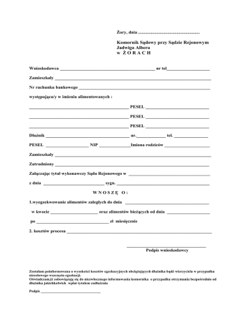 śory, dnia ...................................................... Komornik Sądowy przy Sądzie Rejonowym Jadwiga Albera w śORACH Wnioskodawca __________________________________________ nr tel___________________ Zamieszkały _____________________________________________________________________ Nr rachunku bankowego __________________________________________________________ występująca/y w imieniu alimentowanych : ____________________________________________ PESEL ____________________________ ____________________________________________ PESEL ____________________________ ____________________________________________ PESEL ____________________________ DłuŜnik _____________________________________ ur._____________ tel. _______________ PESEL ___________________ NIP ______________Imiona rodziców ____________________ Zamieszkały _____________________________________________________________________ Zatrudniony ____________________________________________________________________ Załączając tytuł wykonawczy Sądu Rejonowego w ____________________________________ z dnia ___________________________ sygn. _________________________________________ WNOSZĘ O: 1.wyegzekwowanie alimentów zaległych do dnia _____________________________________ w kwocie _____________________ oraz alimentów bieŜących od dnia ___________________ po ________________________________ zł miesięcznie 2. kosztów procesu ________________________________________________________________ ___________________________________ Podpis wnioskodawcy Zostałam poinformowana o wysokości kosztów egzekucyjnych obciąŜających dłuŜnika bądź wierzyciela w przypadku niecelowego wszczęcia egzekucji. Oświadczam,iŜ zobowiązuję się do niezwłocznego informowania komornika o przypadku otrzymania bezpośrednio od dłuŜnika jakichkolwiek wpłat tytułem zadłuŜenia Podpis ________________________________