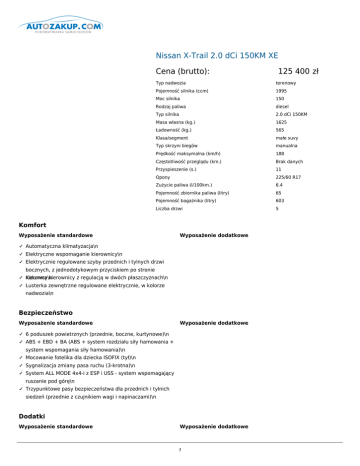 Nissan X-Trail 2.0 dCi 150KM XE Cena (brutto): Typ nadwozia terenowy Pojemność silnika (ccm) 1995 Moc silnika 150 Rodzaj paliwa diesel Typ silnika 2.0 dCi 150KM Masa własna (kg.) 1625 Ładowność (kg.) 565 Klasa/segment małe suvy Typ skrzyni biegów manualna Prędkość maksymalna (km/h) 188 Częstotliwość przeglądu (km.) Brak danych Przyspieszenie (s.) 11 Opony 225/60 R17 Zużycie paliwa (l/100km.) 6.4 Pojemność zbiornika paliwa (litry) 65 Pojemność bagażnika (litry) 603 Liczba drzwi 5 Komfort Wyposażenie standardowe Wyposażenie dodatkowe ✓ Automatyczna klimatyzacja\n ✓ Elektryczne wspomaganie kierownicy\n ✓ Elektrycznie regulowane szyby przednich i tylnych drzwi bocznych, z jednodotykowym przyciskiem po stronie ✓ Kolumna kierowcy\n kierownicy z regulacją w dwóch płaszczyznach\n ✓ Lusterka zewnętrzne regulowane elektrycznie, w kolorze nadwozia\n Bezpieczeństwo Wyposażenie standardowe Wyposażenie dodatkowe ✓ 6 poduszek powietrznych (przednie, boczne, kurtynowe)\n ✓ ABS + EBD + BA (ABS + system rozdziału siły hamowania + system wspomagania siły hamowania)\n ✓ Mocowanie fotelika dla dziecka ISOFIX (tył)\n ✓ Sygnalizacja zmiany pasa ruchu (3-krotna)\n ✓ System ALL MODE 4x4-i z ESP i USS - system wspomagający ruszanie pod górę\n ✓ Trzypunktowe pasy bezpieczeństwa dla przednich i tylnich siedzeń (przednie z czujnikiem wagi i napinaczami)\n Dodatki Wyposażenie standardowe 125 400 zł Wyposażenie dodatkowe 1 ✓ 17" felgi ze stopów metali lekkich, opony 225/60 R17 ✕ Dywaniki gumowe przód i tył 235 PLN ✓ 2 DIN odtwarzacz CD z 4 głośnikami + Bluetooth + gniazdo ✕ Lakier metaliczny lub perłowy 3200 PLN MP3 ✓ 2 tylne nawiewy ✕ Listwy boczne 504 PLN ✓ Aktywne zagłówki foteli przednich z regulacją wysokości + 3 ✕ Siatka na bagaże, pozioma 193 PLN tylne zagłówki ✓ Centralnie umieszczony schowek w przedniej konsoli ✕ Zaczep holowniczy stały 1456 PLN ✓ Centralny zamek sterowany pilotem + immobilizer + instalacja do montażu alarmu\n ✓ Chromowana atrapa chłodnicy\n ✓ Dwa haczyki na zakupy w panelu bagażnika + 8 dodatkowych przydatnych zaczepów\n ✓ Dwie prędkości wycieraczek przednich z trybem pracy przerywanej + tylna wycieraczka z trybem pracy ✓ Dzielona przerywanej\n tylna kanapa w stosunku 60/40\n ✓ Fotel kierowcy (z oparciem lędźwiowym, regulowana wysokość (60mm) z podnośnikiem siedzenia)\n ✓ Komputer pokładowy z białym, kolorowym wyświetlaczem i wskaźnikiem przełączania biegów.\n ✓ Kontrolki świetlne wskazujące brak zapiętych pasów bezpieczeństwa oraz niedomkniętych drzwi\n ✓ Listwy nadkoli (czarne) i chlapacze\n ✓ Podłokietnik kierowcy oraz schowki drzwi bocznych\n ✓ Przedni podłokietnik\n ✓ Przednie reflektory halogenowe z gładkim kloszem\n ✓ Schowek na rękawiczki z podłączeniem do gniazda elektrycznego i podświetleniem\n ✓ Schowek w górnej części deski rozdzielczej: ✓ Sterowanie niewykończony\n systemem audio w kole kierownicy\n ✓ Światła (1 w przestrzeni bagażowej, 2 w kokpicie kierowcy, 1 w tylnej części pasażerskiej)\n ✓ Słupek C: kolor srebrny\n ✓ Tapicerka w pełni czarna\n ✓ Tylne lampy w technologii LED\n ✓ Uchwyty na kubki z funkcją schładzania i grzania (2 w konsoli przedniej, 2 umieszczone w konsoli tylnej)\n ✓ Wnętrze lamp przednich w kolorze srebrnym\n ✓ Włącznik centralnego zamka w konsoli kierowcy oraz blokada dziecięca w drzwiach tylnych\n ✓ Zderzaki w kolorze nadwozia\n ✓ Zewnętrzne klamki drzwi czarne\n Doprecyzowanie oferty Kontakt: Nazwa użytkownika: admin Nazwa firmy: qqq 2 Adres: qqq 12, 41-706 qqq1, NIP: 954 REGON: 1 Telefon: 123, 1 Fax: 1 Email: 1 www: 3