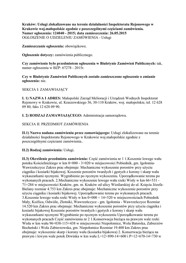 Kraków: Usługi zlokalizowane na terenie działalności Inspektoratu Rejonowego w Krakowie woj.małopolskie zgodnie z poszczególnymi częściami zamówienia. Numer ogłoszenia: 124040 - 2015; data zamieszczenia: 26.05.2015 OGŁOSZENIE O UDZIELENIU ZAMÓWIENIA - Usługi Zamieszczanie ogłoszenia: obowiązkowe. Ogłoszenie dotyczy: zamówienia publicznego. Czy zamówienie było przedmiotem ogłoszenia w Biuletynie Zamówień Publicznych: tak, numer ogłoszenia w BZP: 67278 - 2015r. Czy w Biuletynie Zamówień Publicznych zostało zamieszczone ogłoszenie o zmianie ogłoszenia: nie. SEKCJA I: ZAMAWIAJĄCY I. 1) NAZWA I ADRES: Małopolski Zarząd Melioracji i Urządzeń Wodnych Inspektorat Rejonowy w Krakowie, ul. Kraszewskiego 36, 30-110 Kraków, woj. małopolskie, tel. 12 628 09 80, faks 12 628 09 90. I. 2) RODZAJ ZAMAWIAJĄCEGO: Administracja samorządowa. SEKCJA II: PRZEDMIOT ZAMÓWIENIA II.1) Nazwa nadana zamówieniu przez zamawiającego: Usługi zlokalizowane na terenie działalności Inspektoratu Rejonowego w Krakowie woj.małopolskie zgodnie z poszczególnymi częściami zamówienia.. II.2) Rodzaj zamówienia: Usługi. II.3) Określenie przedmiotu zamówienia: Część zamówienia nr 1 1.Koszenie lewego wału potoku Kościelnickiego w km 0+000 - 3+020 w miejscowości Pobiednik, gm. IgołomiaWawrzeńczyce Zakres prac obejmuje: Mechaniczne wykoszenie porostów przy użyciu ciągnika i kosiarki bijakowej. Koszenie porostów twardych i gęstych z korony i skarp wału wykaszarkami ręcznymi. Wygrabienie po ręcznym wykoszeniu. Uporządkowanie terenu po wykonanych pracach. 2.Mechaniczne wykoszenie lewego wału rzeki Wisły w km 66+531 71+284 w miejscowości Kraków, gm. m. Kraków od ulicy Wioślarskiej do ul. Księcia JózefaBielany rozmiar 4.753 km Zakres prac obejmuje: Mechaniczne wykoszenie porostów przy użyciu ciągnika i kosiarki bijakowej. Uporządkowanie terenu po wykonanych pracach. 3.Koszenie lewego wału rzeki Wisły w km 0+000 ÷ 14+520 w miejscowościach Pobiednik Mały, Koźlica, Odwiśle, Złotniki, Wawrzeńczyce - gm. Igołomia - Wawrzeńczyce Rozmiar 14.520 km Zakres prac obejmuje: Mechaniczne wykoszenie porostów przy użyciu ciągnika i kosiarki bijakowej Koszenie porostów twardych i gęstych z korony i skarp wału wykaszarkami ręcznymi Wygrabienie po ręcznym wykoszeniu Uporządkowanie terenu po wykonanych pracach Część zamówienia nr 2 1.Konserwacja bieżąca na prawym wale rzeki Wisła w km wału 96+038-115+438 w miejscowości Niepołomice, Wola Batorska, Zabierzów Bocheński i Wola Zabierzowska, gm. Niepołomice Rozmiar 19.400 km Zakres prac obejmuje: wykoszenie skarp i korony wału (kosiarka bijakowa) 2. Konserwacja bieżąca na prawym i lewym wale potok Drwinka w km wału L=12+890-14+600 i P=12+670-14+730 w miejscowości Chobot i Wola Zabierzowska, gm. Niepołomice Rozmiar 3.770 km Zakres prac obejmuje: wykoszenie skarp i korony wału (mechaniczne - kosiarka bijakowa) 3. Konserwacja bieżąca na prawym wale potok Podłężanka w km wału 0+000-2+700 w miejscowości Niepołomice, gm. Niepołomice Rozmiar: 2.700 km Zakres pra c obejmuje: wykoszenie skarp i korony wału (mechaniczne - kosiarka bijakowa) 4.Konserwacja bieżąca na prawym wale potoku Głogoczówka w km 0+000 - 0+470 w m. Głogoczów, gm. Myślenice Rozmiar: 0.470 km Zakres prac obejmuje: wykoszenie skarp i korony wału (mechanicznekosiarka bijakowa) Część zamówienia nr 3 1.Konserwacja bieżąca- wykoszenie lewego wału potoku Podłężanka w km 0+000 -2+850 w miejscowości: Grabie, Węgrzce Wielkie, gm. Wieliczka. Rozmiar: 2.850 km Zakres prac obejmuje: wykoszenie korpusu wału (skarp i korony wału) mechanicznie - kosiarką bijakową 2. Konserwacja bieżąca - wykoszenie wałów cofkowych rzeki Serafa prawego w km 0+000 - 3+250 L= 3,250 km lewego w km 0+000 2+950 L= 2,950 km w miejscowości: Brzegi, Kokotów ,gm. Wieliczka Rozmiar: 6.200 km Zakres prac obejmuje: mechaniczne wykoszenie skarp i korony wałów - kosiarką bijakową 3. Konserwacja bieżąca - wykoszenie wałów cofkowych potoku Zabawka prawego w km 0+000 -1+211 L= 1,211 km lewego w km 0+000 -1+139 L= 1,139 km w miejscowości: Brzegi, Kokotów,gm. Wieliczka Rozmiar: 2,350 km Zakres prac obejmuje: mechaniczne wykoszenie skarp i korony wałów - kosiarką bijakową 4. Konserwacja bieżąca - wykoszenie wałów cofkowych rzeki Drwina Długa prawego w km 0+000 -1+260 L= 1,260 km lewego w km 0+000 -1+270 L= 1,270 km w miejscowości: Brzegi ,gm. Wieliczka Rozmiar: 2,530 km Zakres prac obejmuje: mechaniczne wykoszenie skarp i korony wałów - kosiarką bijakową 5.Konserwacja bieżąca- wykoszenie prawego wału rzeki Wisła w km 90+800 - 96+038 w miejscowości Brzegi , Grabie,gm. Wieliczka Rozmiar : 5.238 km Zakres prac obejmuje: mechaniczne wykoszenie skarp i korony wału kosiarką bijakową Część zamówienia nr 4 1. Konserwacja lewego wału rzeki Wisły w km 0+000 - 2+820 m. Nowe Brzesko, Hebdów, gmina Nowe Brzesko, powiat proszowicki Rozmiar : 2.820 km Zakres prac obejmuje: Wykoszenie porostów, mechaniczne koszenie porostów ze skarp wału, ciągnik + kosiarka bijakowa Wykoszenie porostów, ręcznie ze skarp wału, porost gęsty, twardy z wygrabieniem 2.Konserwacja wałów rzeki Szreniawy km 0+000 - 2+420P, 0+000 - 0+960L, m. Witów, Sokołowice , gmina Koszyce, powiat proszowicki Rozmiar 3.380 km Zakres prac obejmuje: Wykoszenie porostów, mechaniczne koszenie porostów ze skarp wału, ciągnik + kosiarka bijakowa Wykoszenie porostów, ręcznie ze skarp wału, porost gęsty, twardy z wygrabieniem Ręczne ścinanie, krzaki średniej gęstości ze skarp wału według wskazań w terenie 3. Konserwacja wałów rzeki Wisły km 0+000 - 1+760, 0+000 - 4+300, 0+000 - 0+960, 0+000 1+780, 0+000 - 1+360m. Morsko, Sokołowice, Przemyków, Witów, Piotrowice, gmina Koszyce, powiat proszowicki Rozmiar 10.160 km Zakres prac obejmuje: Wykoszenie porostów, mechaniczne koszenie porostów ze skarp wału, ciągnik + kosiarka bijakowa Wykoszeni