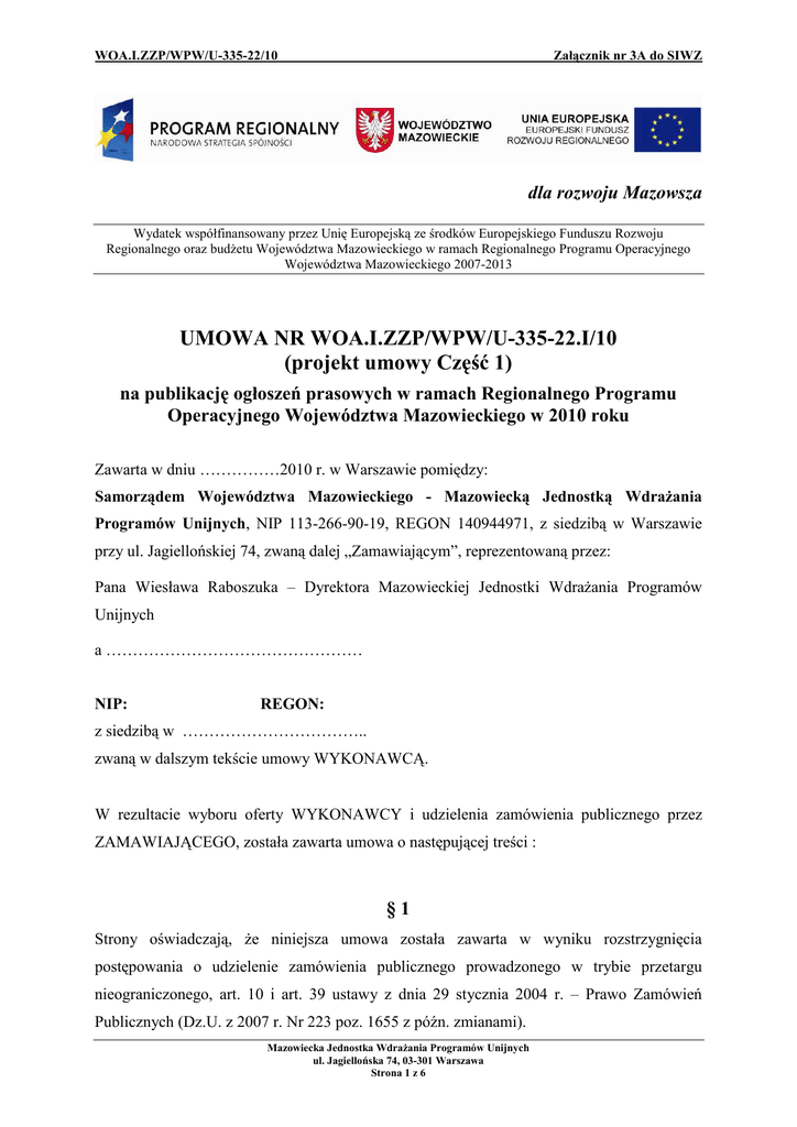 WOA.I.ZZP/WPW/U-335-22/10 Załącznik nr 3A do SIWZ dla rozwoju Mazowsza dla rozwoju Mazowsza Wydatek współfinansowany przez Unię Europejską ze środków Europejskiego Funduszu Rozwoju Regionalnego oraz budŜetu Województwa Mazowieckiego w ramach Regionalnego Programu Operacyjnego Województwa Mazowieckiego 2007-2013 UMOWA NR WOA.I.ZZP/WPW/U-335-22.I/10 (projekt umowy Część 1) na publikację ogłoszeń prasowych w ramach Regionalnego Programu Operacyjnego Województwa Mazowieckiego w 2010 roku Zawarta w dniu ……………2010 r. w Warszawie pomiędzy: Samorządem Województwa Mazowieckiego - Mazowiecką Jednostką WdraŜania Programów Unijnych, NIP 113-266-90-19, REGON 140944971, z siedzibą w Warszawie przy ul. Jagiellońskiej 74, zwaną dalej „Zamawiającym”, reprezentowaną przez: Pana Wiesława Raboszuka – Dyrektora Mazowieckiej Jednostki WdraŜania Programów Unijnych a ………………………………………… NIP: REGON: z siedzibą w …………………………….. zwaną w dalszym tekście umowy WYKONAWCĄ. W rezultacie wyboru oferty WYKONAWCY i udzielenia zamówienia publicznego przez ZAMAWIAJĄCEGO, została zawarta umowa o następującej treści : §1 Strony oświadczają, Ŝe niniejsza umowa została zawarta w wyniku rozstrzygnięcia postępowania o udzielenie zamówienia publicznego prowadzonego w trybie przetargu nieograniczonego, art. 10 i art. 39 ustawy z dnia 29 stycznia 2004 r. – Prawo Zamówień Publicznych (Dz.U. z 2007 r. Nr 223 poz. 1655 z późn. zmianami). Mazowiecka Jednostka WdraŜania Programów Unijnych ul. Jagiellońska 74, 03-301 Warszawa Strona 1 z 6 WOA.I.ZZP/WPW/U-335-22/10 Załącznik nr 3A do SIWZ §2 1. Przedmiotem umowy jest usługa polegająca na zamieszczaniu w prasie – w dzienniku o zasięgu ogólnopolskim lub regionalnym, obejmującym swoim zasięgiem cały obszar województwa a mazowieckiego, WYKONAWCA zobowiązuje ZAMAWIAJĄCEGO ogłoszeń ogłoszeń się do prasowych prasowych. ZAMAWIAJĄCY zamieszczania Mazowieckiej przekazywanych Jednostki zleca, przez WdraŜania Programów Unijnych w ramach Regionalnego Programu Operacyjnego Województwa Mazowieckiego w okresie od dnia podpisania umowy do 15 grudnia 2010 r. Opis przedmiotu zamówienia jest integralną częścią niniejszej umowy. Zakres zamówienia obejmuje dla kaŜdego ogłoszenia jego skład według wytycznych ZAMAWIAJĄCEGO (układ treści, grafiki ) i dostosowanie ich przez WYKONAWCĘ do szaty graficznej danego dziennika, przy zachowaniu parametrów opisanych w – Opisie przedmiotu zamówienia. Ogłoszenia będą publikowane w pełnym kolorze, na stronach ogłoszeniowych dziennika. 2. Umowa pomiędzy ZAMAWIAJĄCYM a WYKONAWCĄ zostaje zawarta na okres od dnia podpisania umowy do dnia 15 grudnia 2010 r. 3. Zamieszczanie ogłoszeń następować będzie sukcesywnie, zgodnie z bieŜącymi potrzebami ZAMAWIAJĄCEGO, kaŜdorazowo na podstawie odrębnych zleceń przekazanych WYKONAWCY. Zlecenie publikacji następować będzie pisemnie na podstawie zatwierdzonego projektu ogłoszenia opracowanego przez WYKONAWCĘ. W imieniu ZAMAWIAJĄCEGO bieŜące pisemne zlecenia będą dokonywane przez Wydział Promocji i Wydawnictw Mazowieckiej Jednostki WdraŜania Programów Unijnych. 4. ZAMAWIAJĄCY zobowiązuje się do dostarczania WYKONAWCY materiałów dotyczących ogłoszeń określonych w § 2 ust. 1, nie później niŜ na dwa dni robocze przed datą publikacji, a w szczególnych przypadkach w przeddzień druku danego nakładu do godziny 13.00. 5. Publikacja ogłoszeń odbywać się będzie na podstawie kaŜdorazowego pisemnego zlecenia oraz ostateczną datę zamieszczenia ogłoszenia. zawierającego treść ogłoszenia, materiały graficzne niezbędne do jego przygotowania. 6. ZAMAWIAJĄCY kaŜdorazowo Ŝąda przedstawienia do akceptacji zlecanego do druku ogłoszenia. Mazowiecka Jednostka WdraŜania Programów Unijnych ul. Jagiellońska 74, 03-301 Warszawa Strona 2 z 6 WOA.I.ZZP/WPW/U-335-22/10 Załącznik nr 3A do SIWZ 7. WYKONAWCA zobowiązuje się do publikacji ogłoszeń prasowych stanowiących przedmiot niniejszej umowy nie później niŜ w dniu ogłoszenia konkursu przez Mazowiecką Jednostkę WdraŜania Programów Unijnych. 8. WYKONAWCA zobowiązuje się do zachowania szaty graficznej przedmiotowych ogłoszeń zgodnej z wytycznymi Ministerstwa Rozwoju Regionalnego na podstawie księgi znaku przekazanej przez ZAMAWIAJĄCEGO, a w treści kaŜdego ogłoszenia zostanie umieszczony zapis: „Ogłoszenie współfinansowane przez Unię Europejską ze środków Europejskiego Funduszu Rozwoju Regionalnego oraz budŜetu województwa mazowieckiego w ramach Regionalnego Programu Operacyjnego Województwa Mazowieckiego 2007-2013”. 9. W przypadku niewykorzystania powierzchni na publikację ogłoszeń prasowych na zlecenie ZAMAWIAJĄCEGO WYKONAWCA zobowiązuje się do zamieszczania innych informacji w ramach Regionalnego Programu Operacyjnego Województwa Mazowieckiego. 10. Zamawiający dopuszcza moŜliwość udzielenia zamówienia uzupełniającego, w zakresie przewidzianym w art. 67 ust. 1 pkt 6 ustawy Prawo Zamówień Publicznych z dnia 29 stycznia 2004 r. (Dz. U. z 2007 r. nr 223 poz. 1655 z późn. zmianami). §3 1. Strony ustalają zgodnie z ofertą WYKONAWCY z dnia …………… stawkę publikacji za 1 cm² ogłoszenia prasowego w wysokości……………….zł (słownie:…………………zł) Całkowita wartość zamówienia wynosi …………… brutto zł (słownie:.........................). Nazwa dziennika w którym zamieszczone zostaną ogłoszenia: …………………………. Wymiar jednego ogłoszenia: ……………………………….. Cena jednostkowa brutto za 1 cm2 powierzchni ogłoszenia w edycji poniedziałkowej:…zł. Cena jednostkowa brutto za 1 cm2 powierzchni ogłoszenia w edycji wtorkowej: ….…zł. Cena jednostkowa brutto za 1 cm2 powierzchni ogłoszenia w edycji środowej: ………zł. Cena jednostkowa brutto za 1 cm2 powier