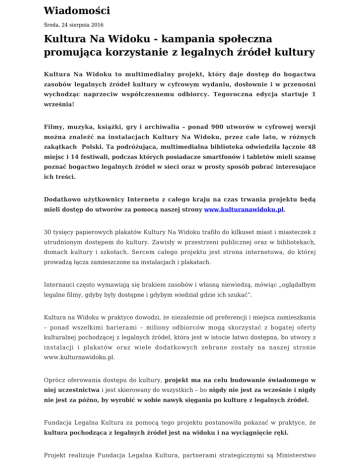 Wiadomości Środa, 24 sierpnia 2016 Kultura Na Widoku - kampania społeczna promująca korzystanie z legalnych źródeł kultury Kultura Na Widoku to multimedialny projekt, który daje dostęp do bogactwa zasobów legalnych źródeł kultury w cyfrowym wydaniu, dosłownie i w przenośni wychodząc naprzeciw współczesnemu odbiorcy. Tegoroczna edycja startuje 1 września! Filmy, muzyka, książki, gry i archiwalia – ponad 900 utworów w cyfrowej wersji można znaleźć na instalacjach Kultury Na Widoku, przez całe lato, w różnych zakątkach Polski. Ta podróżująca, multimedialna biblioteka odwiedziła łącznie 48 miejsc i 14 festiwali, podczas których posiadacze smartfonów i tabletów mieli szansę poznać bogactwo legalnych źródeł w sieci oraz w prosty sposób pobrać interesujące ich treści. Dodatkowo użytkownicy Internetu z całego kraju na czas trwania projektu będą mieli dostęp do utworów za pomocą naszej strony www.kulturanawidoku.pl. 30 tysięcy papierowych plakatów Kultury Na Widoku trafiło do kilkuset miast i miasteczek z utrudnionym dostępem do kultury. Zawisły w przestrzeni publicznej oraz w bibliotekach, domach kultury i szkołach. Sercem całego projektu jest strona internetowa, do której prowadzą łącza zamieszczone na instalacjach i plakatach. Internauci często wymawiają się brakiem zasobów i własną niewiedzą, mówiąc „oglądałbym legalne filmy, gdyby były dostępne i gdybym wiedział gdzie ich szukać”. Kultura na Widoku w praktyce dowodzi, że niezależnie od preferencji i miejsca zamieszkania – ponad wszelkimi barierami – miliony odbiorców mogą skorzystać z bogatej oferty kulturalnej pochodzącej z legalnych źródeł, która jest w istocie łatwo dostępna, bo utwory z instalacji i plakatów oraz wiele dodatkowych zebrane zostały na naszej stronie www.kulturnawidoku.pl. Oprócz oferowania dostępu do kultury, projekt ma na celu budowanie świadomego w niej uczestnictwa i jest skierowany do wszystkich – bo nigdy nie jest za wcześnie i nigdy nie jest za późno, by wyrobić w sobie nawyk sięgania po kulturę z legalnych źródeł. Fundacja Legalna Kultura za pomocą tego projektu postanowiła pokazać w praktyce, że kultura pochodząca z legalnych źródeł jest na widoku i na wyciągnięcie ręki. Projekt realizuje Fundacja Legalna Kultura, partnerami strategicznymi są Ministerstwo Kultury i Dziedzictwa Narodowego oraz Polski Instytut Sztuki Filmowej. Oprac. MW, na podstawie materiałów prasowych