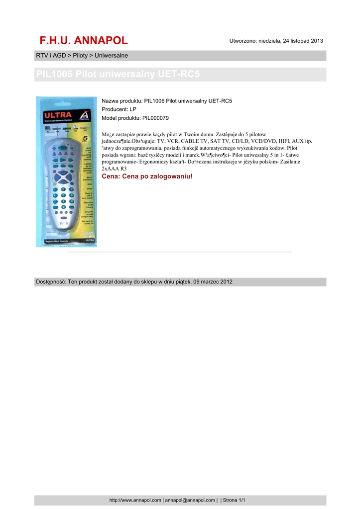 F.H.U. ANNAPOL Utworzono: niedziela, 24 listopad 2013 RTV i AGD > Piloty > Uniwersalne PIL1006 Pilot uniwersalny UET-RC5 Nazwa produktu: PIL1006 Pilot uniwersalny UET-RC5 Producent: LP Model produktu: PIL000079 Mo¿e zast±piæ prawie ka¿dy pilot w Twoim domu. Zastêpuje do 5 pilotow jednocze¶nie.Obs³uguje: TV, VCR, CABLE TV, SAT TV, CD/LD, VCD/DVD, HIFI, AUX itp. ³atwy do zaprogramowania, posiada funkcjê automatycznego wyszukiwania kodow. Pilot posiada wgran± bazê tysiêcy modeli i marek.W³a¶ciwo¶ci- Pilot uniwesalny 5 in 1- £atwe programowanie- Ergonomiczy kszta³t- Do³±czona instrukacja w jêzyku polskim- Zasilanie 2xAAA R3 Cena: Cena po zalogowaniu! Dostępność: Ten produkt został dodany do sklepu w dniu piątek, 09 marzec 2012 http://www.annapol.com | [email protected] | | Strona 1/1