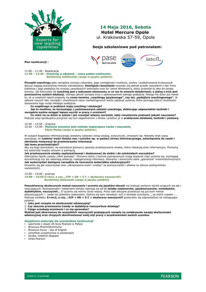 14 Maja 2016, Sobota Hotel Mercure Opole ul. Krakowska 57-59, Opole Sesje szkoleniowe pod patronatem: Plan konferencji : 11:00 – 11:40 - Rejestracja 11:40 – 12:40 - Coaching w edukacji – nowa paleta możliwości, Bartłomiej Jaślikowski (sesja w języku polskim) Początki coachingu jako narzędzia rozwoju człowieka, jego umiejętności myślenia, analizy i podejmowania krytycznych decyzji sięgają starożytnej metody sokratejskiej. Dzisiejsze rozumienie wywodzi się jednak przede wszystkim z idei Tima Gallweya i jego podejścia do rozwoju zawodowych tenisistów oraz Sir Johna Whitmore’a, który przeniósł te idee do świata biznesu. Od kilkunastu lat coaching jest z sukcesem stosowany w co raz to nowych dziedzinach, a jedną z nich jest powszechny system edukacji, którego jakość wzrasta wraz z zastosowaniem takiego podejścia. Nikogo nie dziwi już nawet to, że w ostatnich latach pojawiły się nowe terminy „coachingu językowego”, czy też „podejścia coachingowego”. W zalewie nowych idei, narzędzi i chwytliwych nazw marketingowych warto zadawać pytania, które pomogą odkryć możliwości stosowania tego wciąż młodego podejścia: · Co wspólnego w praktyce mają coaching i edukacja? · Jak to możliwe, że korzystając z podstawowych założeń coachingu, dobierając odpowiednie techniki i narzędzia można osiągać lepsze wyniki w pracy z uczniami? · Co robić na co dzień w szkole i jak rozwijać własny warsztat, żeby nieustannie podnosić jakość nauczania? Podczas sesji spróbujemy przyjrzeć się tym zagadnieniom z bliska i przekuć je w praktyczne działania, techniki i postawy. 12:40 – 12:50 – przerwa 12:50 – 13:50 - Myślenie wizualne jako metoda wspierajaca naukę i nauczanie, Edyta Madej (sesja w języku polskim) W czasach bogactwa informacyjnego jesteśmy zalewani nową wiedzą, wytycznymi, zmianami itp. Niestety brak czasu powoduje, że nadmiar treści dotyka nas i uczniów np. w postaci stresu informacyjnego, zniechęcenia do nauki i obniżenia motywacji do przetwarzania informacji. Jak temu przeciwdziałać? Aby się tego dowiedzieć, na warsztacie poznamy sposoby przekazywania wiedzy, które redukcją stres informacyjny. Poznamy też zależność między stresem a pamięcią. Jak przekazywanie wiedzy zoptymalizować i dostosować do siebie i do zaistniałych warunków? Odkryjemy tajniki zasady „Dłoń pamięta”. Poznamy które z technik pamięciowych mogą wspierać chęć uczenia się, wzmagają koncentrację czy też ułatwiają selekcję i kategoryzację informacji. Poznamy i stworzymy bank „gotowców” mnemotechnicznych. Jak wykorzystać dostępne narzędzia do tworzenia materiałów edukacyjnych? Dowiemy się jak wykorzystać moc „obrazowania myśli i wiedzy” za pomocą kartki i ołówka (w obliczu podręczników wieloletnich). 13:50 – 14:00 - przerwa 14:00 – 15:00 E=mc2, a czy….VIP + OK + 5 C = skuteczny nauczyciel?, Bartłomiej Jaśikowski (sesja w języku polskim) Poszukiwaczy skutecznych metod nauczania i uczenia się języków obcych nie brakuje zarówno wśród uczących się jak i nauczających. Rozważaniami i badaniami tematu zajmują się od lat sztaby naukowców, językoznawców, metodyków, dydaktyków, nauczycieli… O uczeniu się wiemy coraz więcej. Przez sale lekcyjne przetoczył się już bum metod aktywizujących i …nadal nie jesteśmy zadowoleni. Zdarza się nam narzekać: ech ci dzisiejsi uczniowie…, za moich czasów …. Podczas wykładu: E=mc2, a czy….VIP + OK + 5 C = skuteczny nauczyciel? postaramy się odpowiedzieć na następujące pytania: 1. Jaka jest recepta na skuteczność edukacyjną? 2. Czy obecnie promowane trendy w dydaktyce rzeczywiście działają? 3. Czego oczekują uczniowie i co się sprawdza? Wykład jest skierowany do wszystkich nauczycieli szukających recepty na zwiększenie swojej skuteczności edukacyjnej oraz chcących skonfrontować swój styl pracy z oczekiwaniami swoich uczniów. Wyjątkowe materiały dla uczestników konferencji! • upominek z okazji 25-lecia Pearson w Polsce • Broszura Mnemotechniczna • Broszura Focus - Use of English • certyfikat uczestnictwa w szkoleniach • teczka, notatnik długopis • torba Pearson
