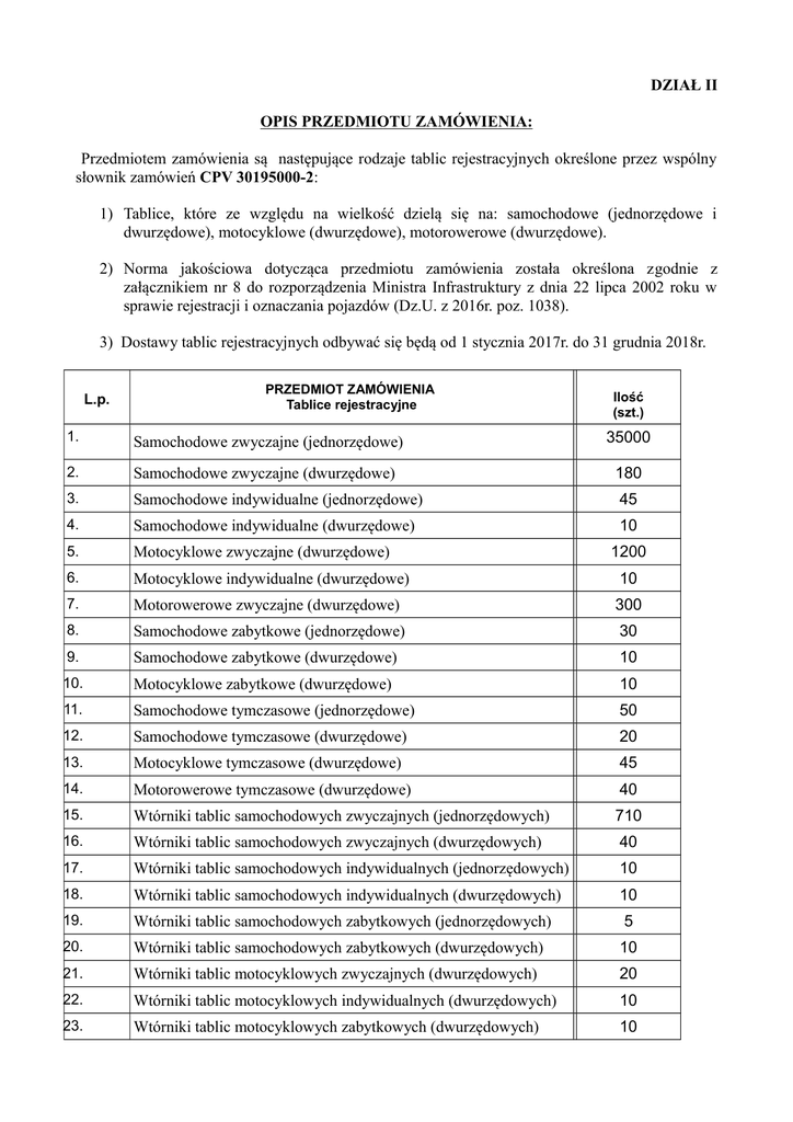 DZIAŁ II OPIS PRZEDMIOTU ZAMÓWIENIA: Przedmiotem zamówienia są następujące rodzaje tablic rejestracyjnych określone przez wspólny słownik zamówień CPV 30195000-2: 1) Tablice, które ze względu na wielkość dzielą się na: samochodowe (jednorzędowe i dwurzędowe), motocyklowe (dwurzędowe), motorowerowe (dwurzędowe). 2) Norma jakościowa dotycząca przedmiotu zamówienia została określona zgodnie z załącznikiem nr 8 do rozporządzenia Ministra Infrastruktury z dnia 22 lipca 2002 roku w sprawie rejestracji i oznaczania pojazdów (Dz.U. z 2016r. poz. 1038). 3) Dostawy tablic rejestracyjnych odbywać się będą od 1 stycznia 2017r. do 31 grudnia 2018r. L.p. PRZEDMIOT ZAMÓWIENIA Tablice rejestracyjne Ilość (szt.) 1. Samochodowe zwyczajne (jednorzędowe) 35000 2. Samochodowe zwyczajne (dwurzędowe) 180 3. Samochodowe indywidualne (jednorzędowe) 45 4. Samochodowe indywidualne (dwurzędowe) 10 5. Motocyklowe zwyczajne (dwurzędowe) 6. Motocyklowe indywidualne (dwurzędowe) 10 7. Motorowerowe zwyczajne (dwurzędowe) 300 8. Samochodowe zabytkowe (jednorzędowe) 30 9. Samochodowe zabytkowe (dwurzędowe) 10 10. Motocyklowe zabytkowe (dwurzędowe) 10 11. Samochodowe tymczasowe (jednorzędowe) 50 12. Samochodowe tymczasowe (dwurzędowe) 20 13. Motocyklowe tymczasowe (dwurzędowe) 45 14. Motorowerowe tymczasowe (dwurzędowe) 40 15. Wtórniki tablic samochodowych zwyczajnych (jednorzędowych) 710 16. Wtórniki tablic samochodowych zwyczajnych (dwurzędowych) 40 17. Wtórniki tablic samochodowych indywidualnych (jednorzędowych) 10 18. Wtórniki tablic samochodowych indywidualnych (dwurzędowych) 10 19. Wtórniki tablic samochodowych zabytkowych (jednorzędowych) 5 20. Wtórniki tablic samochodowych zabytkowych (dwurzędowych) 10 21. Wtórniki tablic motocyklowych zwyczajnych (dwurzędowych) 20 22. Wtórniki tablic motocyklowych indywidualnych (dwurzędowych) 10 23. Wtórniki tablic motocyklowych zabytkowych (dwurzędowych) 10 1200 L.p. 24. PRZEDMIOT ZAMÓWIENIA Tablice rejestracyjne Ilość (szt.) Wtórniki tablic motorowerowych zwyczajnych (dwurzędowych) RAZEM: 25 37800 Tablice dyplomatyczne i badawcze nie zostały ujęte w powyższym przedmiocie zamówienia z uwagi na to, iż brak jest na terenie miasta Płocka placówek dyplomatycznych oraz ośrodków badawczo rozwojowych przemysłu motoryzacyjnego. WYMAGANIA, KTÓRE SĄ NIEZBĘDNE DO OCENY SPEŁNIANIA PRZEZ WYKONAWCĘ WARUNKÓW O KTÓRYCH MOWA W ART 22 USTAWY: 1. Produkcja tablic rejestracyjnych jest działalnością regulowaną w rozumieniu przepisów ustawy z dnia 2 lipca 2004 r. o swobodzie działalności gospodarczej ( Dz.U. z 2015 r. poz. 584, ze zmianami) i wymaga wpisu do rejestru przedsiębiorców produkujących tablice rejestracyjne co należy udokumentować posiadaniem aktualnego zezwolenia na produkcję tablic rejestracyjnych wydane przez właściwego Wojewodę lub Marszałka Województwa zgodnie z art. 75a ustawy z dnia 20 czerwca 1997 r. - Prawo o ruchu drogowym ( Dz. U. z 2012. poz. 1137 ze zmianami). 2. Wymagany jest certyfikat na zgodność tablic rejestracyjnych lub materiałów służących do ich produkcji z warunkami technicznymi o którym mowa w art. 75a ust 2 pkt 2 ustawy z dnia 20 czerwca 1997 r. - Prawo o ruchu drogowy ( Dz. U. 2012. poz. 1137 ze zmianami) wydany przez Instytut Transportu Samochodowego w Warszawie. 3. Dostarczane tablice rejestracyjne z wytłoczonym numerem muszą być umieszczone w opakowaniach jednostkowych lub zbiorczych wraz z opisem tj. : nazwa producenta, specyfikacja zawartości opakowania, w szczególności ilość tablic i zakres numerów rejestracyjnych.