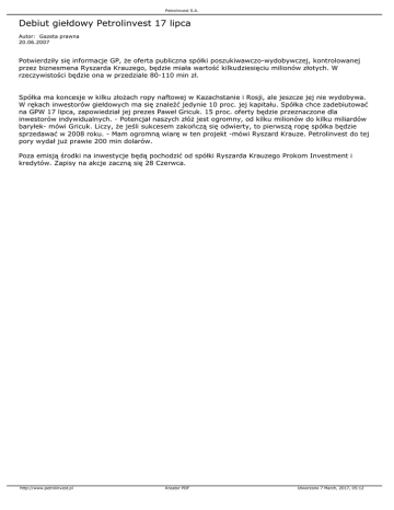 Petrolinvest S.A. Debiut giełdowy Petrolinvest 17 lipca Autor: Gazeta prawna 20.06.2007 Potwierdziły się informacje GP, że oferta publiczna spółki poszukiwawczo-wydobywczej, kontrolowanej przez biznesmena Ryszarda Krauzego, będzie miała wartość kilkudziesięciu milionów złotych. W rzeczywistości będzie ona w przedziale 80-110 min zł. Spółka ma koncesje w kilku złożach ropy naftowej w Kazachstanie i Rosji, ale jeszcze jej nie wydobywa. W rękach inwestorów giełdowych ma się znaleźć jedynie 10 proc. jej kapitału. Spółka chce zadebiutować na GPW 17 lipca, zapowiedział jej prezes Paweł Gricuk. 15 proc. oferty będzie przeznaczone dla inwestorów indywidualnych. - Potencjał naszych złóż jest ogromny, od kilku milionów do kilku miliardów baryłek- mówi Gricuk. Liczy, że jeśli sukcesem zakończą się odwierty, to pierwszą ropę spółka będzie sprzedawać w 2008 roku. - Mam ogromną wiarę w ten projekt -mówi Ryszard Krauze. Petrolinvest do tej pory wydał już prawie 200 min dolarów. Poza emisją środki na inwestycje będą pochodzić od spółki Ryszarda Krauzego Prokom Investment i kredytów. Zapisy na akcje zaczną się 28 Czerwca. http://www.petrolinvest.pl Kreator PDF Utworzono 7 March, 2017, 05:12