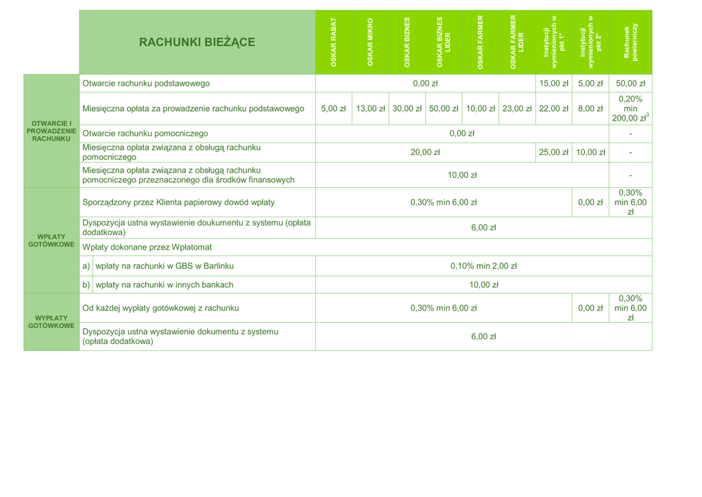 Miesięczna opłata związana z obsługą rachunku pomocniczego przeznaczonego dla środków finansowych Sporządzony przez Klienta papierowy dowód wpłaty Dyspozycja ustna wystawienie doukumentu z systemu (opłata dodatkowa) OSKAR FARMER LIDER OSKAR FARMER 13,00 zł 30,00 zł 50,00 zł 10,00 zł 23,00 zł 22,00 zł 8,00 zł 0,20% min 200,00 zł3 OSKAR BIZNES LIDER 50,00 zł OSKAR BIZNES 5,00 zł 5,00 zł 0,00 zł 20,00 zł 25,00 zł 10,00 zł 10,00 zł 0,30% min 6,00 zł - 0,00 zł 0,30% min 6,00 zł 0,00 zł 0,30% min 6,00 zł 6,00 zł Wpłaty dokonane przez Wpłatomat a) wpłaty na rachunki w GBS w Barlinku 0,10% min 2,00 zł b) wpłaty na rachunki w innych bankach 10,00 zł Od każdej wypłaty gotówkowej z rachunku WYPŁATY GOTÓWKOWE 15,00 zł 0,00 zł Otwarcie rachunku pomocniczego Miesięczna opłata związana z obsługą rachunku pomocniczego WPŁATY GOTÓWKOWE Rachunek powierniczy OTWARCIE I PROWADZENIE RACHUNKU Instytucji wymienionych w pkt 2* Miesięczna opłata za prowadzenie rachunku podstawowego Instytucji wymienionych w pkt 1* Otwarcie rachunku podstawowego OSKAR MIKRO OSKAR RABAT RACHUNKI BIEŻĄCE Dyspozycja ustna wystawienie dokumentu z systemu (opłata dodatkowa) 0,30% min 6,00 zł 6,00 zł Rachunek powierniczy Instytucji wymienionych w pkt 2* Instytucji wymienionych w pkt 1* OSKAR FARMER LIDER OSKAR FARMER OSKAR BIZNES LIDER OSKAR BIZNES OSKAR MIKRO OSKAR RABAT RACHUNKI BIEŻĄCE Przelew wewnętrzny (za każdy przelew) a) papierowy 3,00 zł b) wykonany kartą Oskar Biznes Plus 0,00 zł - c) wykonany przez CUE e-GBS Biznes lub e-GBS Corpo 0,00 zł - d) dyspozycja przelewu środków z rachunku bieżącego na rachunek lokaty terminowej lub spłatę kredytu w GBS Banku 0,00 zł - e) dyspozycja ustna wystawienia dokumentu z systemu (opłata dodatkowa) 5,00 zł Przelew zewnętrzny (za każdy przelew) PRZELEWY a) papierowy 6,50 zł 7,00 zł b) wykonany kartą Oskar Biznes Plus 3,00 zł - d) wykonany przez CUE e-GBS Biznes 1,00 zł - e) wykonany przez CUE e-GBS Corpo 2,50 zł - f) realizacja wysokokwotowych przelewów za pośrednictwem systemu SORBNET w kwocie niższej niż 1 mln zł 25,00 zł w kwocie wyższej lub równej 1 mln zł 15,00 zł Automatyczny z salda rachunku w terminie wynikającym z umowy lub dyspozycji Klienta (za każdy przelew) Realizacja zlecenia stałego wewnętrznego 14,00 zł 0,00 zł - 3,00 zł - Realizacja zlecenia stałego zewnętrznego ze stałą i zmienną kwotą a) za wykonanie każdego zlecenia ZLECENIA STAŁE b) za wykonanie każdego zlecenia z wykorzystaniem usługi CUE e-GBS Biznes 1,00 zł - c) za wykonanie każdego zlecenia z wykorzystaniem usługi CUE e-GBS CORPO 2,50 zł - Realizacja jednorazowego zlecenia stałego w oddziale banku 7,00 zł - Rachunek powierniczy Instytucji wymienionych w pkt 2* Instytucji wymienionych w pkt 1* OSKAR FARMER LIDER OSKAR FARMER OSKAR BIZNES LIDER OSKAR BIZNES OSKAR MIKRO OSKAR RABAT RACHUNKI BIEŻĄCE Złożenie/ modyfikacja/ odwołanie dyspozycji zlecenia stałego ze stałą i zmienną kwotą ZLECENIA STAŁE POLECENIE ZAPŁATY a) w oddziale banku 3,00 zł - 0,00 zł - Zawiadomienie o braku środków na realizację zlecenia 8,00 zł - Realizacja wewnętrznego polecenia zapłaty 0,00 zł - Realizacja zewnętrznego polecenia zapłaty 3,00 zł - Przyjęcie/ modyfikacja/ odwołanie polecenia zapłaty 3,00 zł - b) z wykorzystaniem usługi CUE e-GBS Biznes i e-GBS CORPO Wyciągi okresowe wykonywane przez Klienta osobiście za pomocą usługi CUE e-GBS Biznes, e-GBS CORPO, za pomocą karty Oskar Biznes Plus (za okres do 3 miesięcy) lub przekazywane raz w miesiącu zgodnie z dyspozycją Klienta zawartą w umowie Na życzenie Klienta sporządzenie i wysyłanie wyciągów częściej niż raz w miesiącu. Opłata za każdy wyciąg. WYCIĄGI 0,00 zł 10,00 zł + koszty wysyłki Sporządzenie odpisu (opłata za każdy odpis, stawka podstawowa) a) każdego miesięcznego wyciągu 15,00 zł b) załącznika bez wyciągu 7,00 zł Sporządzenie historii operacji na rachunku na życzenie Klienta a) z roku bieżącego 50,00 zł b) z lat ubiegłych 70,00 zł Jeżeli odpis dotyczy lat ubiegłych- opłatę podwyższa się o połowę stawki podstawowej odpowiednio za każdy rok USŁUGA e-GBS BIZNES Opłata miesięczna za bierny i aktywny dostęp do usługi CUE e-GBS Biznes 0,00 zł - Wydanie jednego tokena do rachunku lub wydanie nowego tokena (np. w razie zgubienia, zniszczenia, itp.) lub wymiany tokena po upływie jego terminu ważności 50,00 zł - USŁUGA e-GBS CORPO USŁUGA GBS SMS BLANKIETY I KSIĄŻECZKI CZEKOWE Rachunek powierniczy Instytucji wymienionych w pkt 2* Instytucji wymienionych w pkt 1* OSKAR FARMER LIDER OSKAR FARMER OSKAR BIZNES LIDER OSKAR BIZNES OSKAR MIKRO OSKAR RABAT RACHUNKI BIEŻĄCE Instalacja i 2 godzinne szkolenie 50,00 zł - Wydanie 2 kart i 1 czytnika (za komplet) 50,00 zł - Wydanie kolejnego czytnika lub karty (za sztukę) 30,00 zł - Obsługa- opłata miesięczna 100,00 zł - Ponowna instalacja na życzenie lub z winy Klienta 50,00 zł - Dodatkowe szkolenie- opłata za godzinę 50,00 zł - Opłata za uszkodzenie karty lub czytnika (za sztukę) 50,00 zł - Nie zwrócenie karty lub czytnika do banku w ciągu 30 dni od daty wezwania (za sztukę) 50,00 zł - Aktywna usługa GBS SMS 7,00 zł 0,00 zł 7,00 zł 0,00 zł 7,00 zł - Za jeden blankiet 5,00 zł - Inkaso czeku 20,00 zł - Potwierdzenie jednego czeku 20,00 zł - 150,00 zł + opłata notarialna - b) inkaso weksla c) przyjęcie weksla do dyskonta- w zależności od kwoty d) rozpatrzenie weksla złożonego do dyskonta 30,00 zł 1,50% 100,00 zł - Za realizację tytułu wykonawczego oraz dokumentu mającego moc takiego tytułu a) jednorazowo b) opłata za każdy przelew przy częściowej realizacji tytułu Za wydanie na żądanie Posiadacza rachunku zaświadczeń: (w jednym egzemplarzu) 20,00 zł 10,00 zł - Obsługa weksli a) oprotestowanie weksla INNE USŁUGI a) zaświadczenia o posiadaniu rachunku bieżącego b) zaświadczenia, m.in.: o posiad