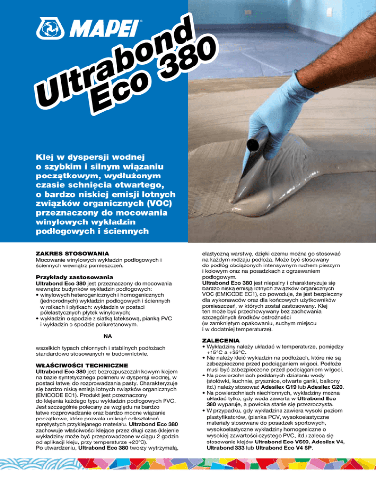 d n 0 o 8 b 3 a r t o l c U E Klej w dyspersji wodnej o szybkim i silnym wiązaniu początkowym, wydłużonym czasie schnięcia otwartego, o bardzo niskiej emisji lotnych związków organicznych (VOC) przeznaczony do mocowania winylowych wykładzin podłogowych i ściennych ZAKRES STOSOWANIA Mocowanie winylowych wykładzin podłogowych i ściennych wewnątrz pomieszczeń. Przykłady zastosowania Ultrabond Eco 380 jest przeznaczony do mocowania wewnątrz budynków wykładzin podłogowych: • winylowych heterogenicznych i homogenicznych (jednorodnych) wykładzin podłogowych i ściennych w rolkach i płytkach; wykładzin w postaci półelastycznych płytek winylowych; • wykładzin o spodzie z siatką lateksową, pianką PVC i wykładzin o spodzie poliuretanowym. NA wszelkich typach chłonnych i stabilnych podłożach standardowo stosowanych w budownictwie. WŁAŚCIWOŚCI TECHNICZNE Ultrabond Eco 380 jest bezrozpuszczalnikowym klejem na bazie syntetycznego polimeru w dyspersji wodnej, w postaci łatwej do rozprowadzania pasty. Charakteryzuje się bardzo niską emisją lotnych związków organicznych (EMICODE EC1). Produkt jest przeznaczony do klejenia każdego typu wykładzin podłogowych PVC. Jest szczególnie polecany ze względu na bardzo łatwe rozprowadzanie oraz bardzo mocne wiązanie początkowe, które pozwala uniknąć odkształceń sprężystych przyklejanego materiału. Ultrabond Eco 380 zachowuje właściwości klejące przez długi czas (klejenie wykładziny może być przeprowadzone w ciągu 2 godzin od aplikacji kleju, przy temperaturze +23ºC). Po utwardzeniu, Ultrabond Eco 380 tworzy wytrzymałą, elastyczną warstwę, dzięki czemu można go stosować na każdym rodzaju podłoża. Może być stosowany do podłóg obciążonych intensywnym ruchem pieszym i kołowym oraz na posadzkach z ogrzewaniem podłogowym. Ultrabond Eco 380 jest niepalny i charakteryzuje się bardzo niską emisją lotnych związków organicznych VOC (EMICODE EC1), co powoduje, że jest bezpieczny dla wykonawców oraz dla końcowych użytkowników pomieszczeń, w których został zastosowany. Klej ten może być przechowywany bez zachowania szczególnych środków ostrożności (w zamkniętym opakowaniu, suchym miejscu i w dodatniej temperaturze). ZALECENIA • Wykładziny należy układać w temperaturze, pomiędzy +15°C a +35°C. • Nie należy kleić wykładzin na podłożach, które nie są zabezpieczone przed podciąganiem wilgoci. Podłoże musi być zabezpieczone przed podciąganiem wilgoci. • Na powierzchniach poddanych działaniu wody (stołówki, kuchnie, prysznice, otwarte ganki, balkony itd.) należy stosować Adesilex G19 lub Adesilex G20. • Na powierzchniach niechłonnych, wykładziny można układać tylko, gdy woda zawarta w Ultrabond Eco 380 wyparuje, a powłoka stanie się przezroczysta. • W przypadku, gdy wykładzina zawiera wysoki poziom plastyfikatorów, (pianka PCV, wysokoelastyczne materiały stosowane do posadzek sportowych, wysokoelastyczne wykładziny homogeniczne o wysokiej zawartości czystego PVC, itd.) zaleca się stosowanie klejów Ultrabond Eco VS90, Adesilex V4, Ultrabond 333 lub Ultrabond Eco V4 SP. nd 0 o b 38 a r Ult Eco Aplikacja Ultrabond Eco 380 WYTYCZNE STOSOWANIA Przygotowanie podłoża Podłoża muszą być równe, suche, chłonne, odporne na siły ściskające i rozciągające, odkurzone, pozbawione luźno związanych części, pęknięć, farb, wosków, olejów, rdzy i śladów gipsu oraz innych produktów utrudniających wiązanie. W przypadku podłoży niechłonnych należy przestrzegać zaleceń co do czasu oczekiwania znajdujących się w karcie technicznej. W każdym przypadku, muszą być przestrzegane lokalne normy i standardy obowiązujące dla danego kraju. Generalną zasadą jest, że poziom wilgotności podłoża, nie powinien być wyższy niż 2,5 do 3 % dla podkładów cementowych i 0,5 % dla podkładów gipsowych lub anhydrytowych. Ważne jest, aby podkład był zabezpieczony przed podciąganiem wilgoci z podłoża. Podkłady pływające mocowane na lekkim betonie lub materiałach izolacyjnych oraz podkłady układane bezpośrednio na gruncie muszą być odizolowane od podłoża przy użyciu izolacji paroszczelnej. W przypadku podłoży, które nie są dostatecznie gładkie należy zastosować odpowiednią samopoziomującą masę szpachlową, aby przygotować powierzchnię do instalacji wykładziny. Aby naprawić pęknięcia powierzchni, wzmocnić słaby podkład, wykonać nowy podkład szybkoschnący lub wyrównać powierzchnię, należy zapoznać się z katalogami produktów MAPEI, w których znajdują się informacje na temat przygotowywania podłoża lub skontaktować się z Działem Technicznym MAPEI. Montaż arkuszy wykładziny winylowej Aklimatyzacja Przed ułożeniem wykładziny, należy przeprowadzić zarówno aklimatyzację kleju jak i wykładziny w odpowiedniej temperaturze. W tym celu wykładzina powinna być wyjęta z opakowania na kilka godzin przed mocowaniem. Arkusze powinny zostać rozwinięte tak, aby proces aklimatyzacji przebiegł szybciej żeby umożliwić likwidację naprężeń, które powstały w wykładzinie podczas jej składowania. Nanoszenie kleju Przed użyciem należy dobrze rozmieszać klej w wiaderku. Za pomocą odpowiedniej szpachelki zębatej (w zależności od podłoża i typu spodu wykładziny, należy użyć szpachelki Mapei numer 1 lub 2 lub podobnej A1 lub A2), nanieść na podłoże wymaganą ilość (250-300 g/m2) Ultrabond Eco 380 i rozprowadzić klej w równomiernej warstwie. Przed aplikacją należy upewnić się, że podłoże posiada odpowiednie parametry. Montaż wykładziny Zgodnie z instrukcją i wskazaniami producenta wykładziny podłogowej. Wykładziny podłogowe w postaci arkuszy lub płytek powinny być układane na Ultrabond Eco 380 po zalecanym czasie przesychania, który wynosi 10-20 minut przy temperaturze +23°C. W przypadku montażu wykładziny na podłożach niechłonnych czas