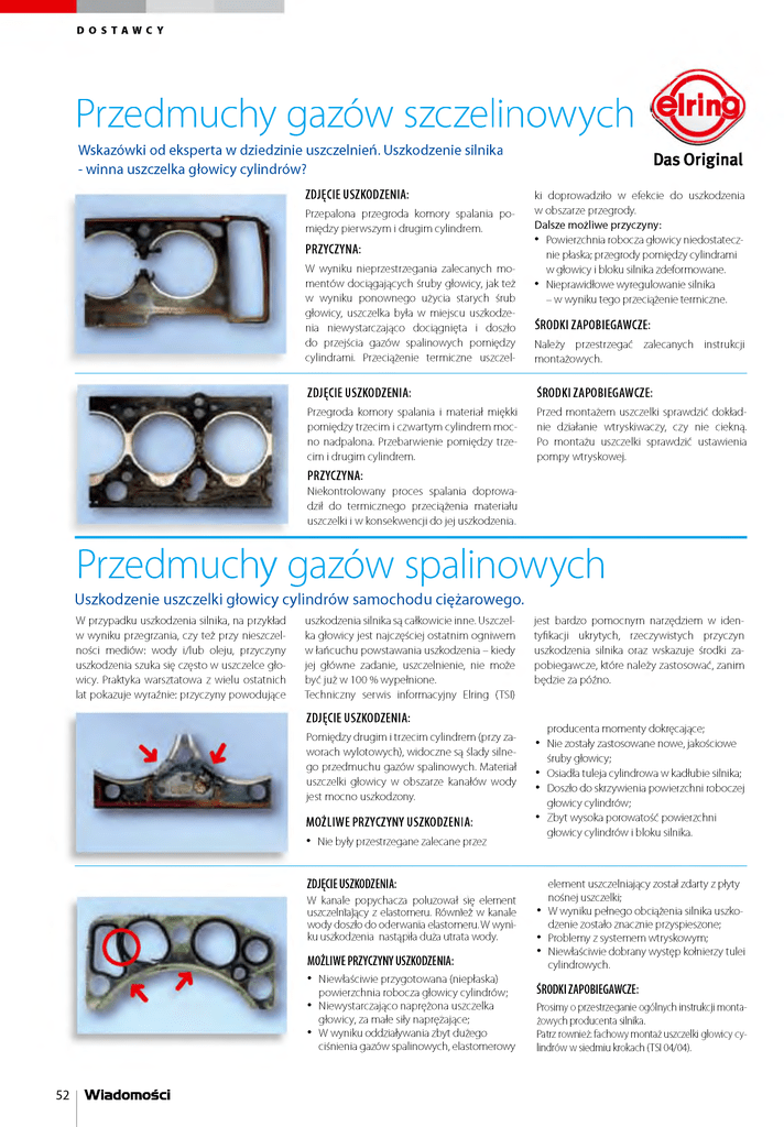 DOSTAWCY Przedmuchy gazów szczelinowych Celrm' Wskazówki od eksperta w dziedzinie uszczelnień. Uszkodzenie silnika - winna uszczelka głowicy cylindrów? z d j ę c ie u s z k o d z e n ia : Przepalona przegroda komory spalania po między pierwszym i drugim cylindrem. PRzYCzYNA: W wyniku nieprzestrzegania zalecanych mo mentów dociągających śruby głowicy, jak też w wyniku ponownego użycia starych śrub głowicy, uszczelka była w miejscu uszkodze nia niewystarczająco dociągnięta i doszło do przejścia gazów spalinowych pom iędzy cylindrami. Przeciążenie termiczne uszczel Das Original ki doprowadziło w efekcie do uszkodzenia w obszarze przegrody. Dalsze możliwe przyczyny: • Powierzchnia robocza głowicy niedostatecz nie płaska; przegrody pomiędzy cylindrami w głowicy i bloku silnika zdeformowane. • Nieprawidłowe wyregulowanie silnika - w wyniku tego przeciążenie termiczne. ś r o d k i z a p o b ie g a w c z e : Należy przestrzegać montażowych. zalecanych instrukcji z d j ę c ie u s z k o d z e n ia : śRODKI zAPOBIEGAW CzE: Przegroda komory spalania i materiał miękki pom iędzy trzecim i czwartym cylindrem m oc no nadpalona. Przebarwienie pom iędzy trze cim i drugim cylindrem. Przed montażem uszczelki sprawdzić dokład nie działanie wtryskiwaczy, czy nie ciekną. Po montażu uszczelki sprawdzić ustawienia pompy wtryskowej. PR z YC z YNA: Niekontrolowany proces spalania doprowa dził do term icznego przeciążenia materiału uszczelki i w konsekwencji do jej uszkodzenia. Przedmuchy gazów spalinowych Uszkodzenie uszczelki głowicy cylindrów samochodu ciężarowego. W przypadku uszkodzenia silnika, na przykład w wyniku przegrzania, czy też przy nieszczel ności mediów: wody i/lub oleju, przyczyny uszkodzenia szuka się często w uszczelce gło wicy. Praktyka warsztatowa z wielu ostatnich lat pokazuje wyraźnie: przyczyny powodujące uszkodzenia silnika są całkowicie inne. Uszczel ka głow icy jest najczęściej ostatnim ogniwem w łańcuchu powstawania uszkodzenia - kiedy jej główne zadanie, uszczelnienie, nie może być ju ż w 100 % wypełnione. Techniczny serwis informacyjny Elring (TSI) z d j ę c ie u s z k o d z e n ia : Pomiędzy drugim i trzecim cylindrem (przy za worach wylotowych), widoczne są ślady silne go przedmuchu gazów spalinowych. Materiał uszczelki głow icy w obszarze kanałów wody jest m ocno uszkodzony. MOŻLIW E PR z YC z YNY uszKO D zEN IA: • Nie były przestrzegane zalecane przez zd ję c ie u szk o d zen ia : W kanale popychacza poluzował się element uszczelniający z elastomeru. Również w kanale wody doszło do oderwania elastomeru. W wyni ku uszkodzenia nastąpiła duża utrata wody. m o żliw e p r z y c z y n y u s zk o d z en ia : • Niewłaściwie przygotowana (niepłaska) powierzchnia robocza głow icy cylindrów; • Niewystarczająco naprężona uszczelka głowicy, za małe siły naprężające; • W wyniku oddziaływania zbyt dużego ciśnienia gazów spalinowych, elastomerowy 52 Wiadomości jest bardzo pom ocnym narzędziem w iden tyfikacji ukrytych, rzeczywistych przyczyn uszkodzenia silnika oraz wskazuje środki za pobiegawcze, które należy zastosować, zanim będzie za późno. producenta momenty dokręcające; • Nie zostały zastosowane nowe, jakościowe śruby głowicy; • Osiadła tuleja cylindrowa w kadłubie silnika; • Doszło do skrzywienia powierzchni roboczej głowicy cylindrów; • Zbyt wysoka porowatość powierzchni głowicy cylindrów i bloku silnika. element uszczelniający został zdarty z płyty nośnej uszczelki; • W wyniku pełnego obciążenia silnika uszko dzenie zostało znacznie przyspieszone; • Problemy z systemem wtryskowym; • Niewłaściwie dobrany występ kołnierzy tulei cylindrowych. śRODKI za p o b ie g a w c ze : Prosimy o przestrzeganie ogólnych instrukcji monta żowych producenta silnika. Patrz rownież: fachowy montaż uszczelki głowicy cy lindrów w siedmiu krokach (TSI 04/04).