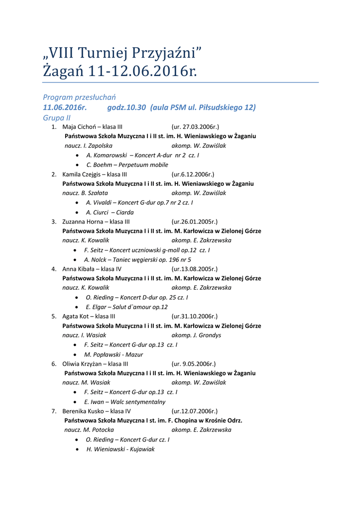 „VIII Turniej Przyjazni” Żagan 11-12.06.2016r. Program przesłuchań 11.06.2016r. godz.10.30 (aula PSM ul. Piłsudskiego 12) Grupa II 1. Maja Cichoń – klasa III (ur. 27.03.2006r.) Państwowa Szkoła Muzyczna I i II st. im. H. Wieniawskiego w Żaganiu naucz. I. Zapolska akomp. W. Zawiślak A. Komarowski – Koncert A-dur nr 2 cz. I C. Boehm – Perpetuum mobile 2. Kamila Czejgis – klasa III (ur.6.12.2006r.) Państwowa Szkoła Muzyczna I i II st. im. H. Wieniawskiego w Żaganiu naucz. B. Szałata akomp. W. Zawiślak A. Vivaldi – Koncert G-dur op.7 nr 2 cz. I A. Ciurci – Ciarda 3. Zuzanna Horna – klasa III (ur.26.01.2005r.) Państwowa Szkoła Muzyczna I i II st. im. M. Karłowicza w Zielonej Górze naucz. K. Kowalik akomp. E. Zakrzewska F. Seitz – Koncert uczniowski g-moll op.12 cz. I A. Nolck – Taniec węgierski op. 196 nr 5 4. Anna Kibała – klasa IV (ur.13.08.2005r.) Państwowa Szkoła Muzyczna I i II st. im. M. Karłowicza w Zielonej Górze naucz. K. Kowalik akomp. E. Zakrzewska O. Rieding – Koncert D-dur op. 25 cz. I E. Elgar – Salut d`amour op.12 5. Agata Kot – klasa III (ur.31.10.2006r.) Państwowa Szkoła Muzyczna I i II st. im. M. Karłowicza w Zielonej Górze naucz. I. Wasiak akomp. J. Grondys F. Seitz – Koncert G-dur op.13 cz. I M. Popławski - Mazur 6. Oliwia Krzyżan – klasa III (ur. 9.05.2006r.) Państwowa Szkoła Muzyczna I i II st. im. H. Wieniawskiego w Żaganiu naucz. M. Wasiak akomp. W. Zawiślak F. Seitz – Koncert G-dur op.13 cz. I E. Iwan – Walc sentymentalny 7. Berenika Kusko – klasa IV (ur.12.07.2006r.) Państwowa Szkoła Muzyczna I st. im. F. Chopina w Krośnie Odrz. naucz. M. Potocka akomp. E. Zakrzewska O. Rieding – Koncert G-dur cz. I H. Wieniawski - Kujawiak 8. Klara Lachowicz – klasa IV (ur.9.11.2005r.) Państwowa Szkoła Muzyczna I st. im. G. Bacewicz w Nowej Soli naucz. M. Tofilska akomp. J. Kalbarczyk A. Vivaldi - Koncert a-moll op. 3 nr 6 cz. I C. Boehm – Introdukcja i Polonez Przerwa Godz. 12.00 9. Martyna Fijałkowska – klasa III/4 (ur.6.03.2003r.) Państwowa Szkoła Muzyczna I st. im. Z. Noskowskiego w Świebodzinie naucz. J. Pietsch akomp. J. Hadzicka A. Vivaldi – Koncert G-dur op.7 nr 2 cz. I M. Gąsieniec – Taniec hiszpański 10. Magda Łazowska – klasa III (ur.4.01.2006r.) Państwowa Szkoła Muzyczna I i II st. im. M. Karłowicza w Zielonej Górze naucz. K. Kowalik akomp. E. Zakrzewska A. Komarowski – Koncert A-dur nr 2 cz. I A. Clebanoff – Taniec milionera 11. Aleksandra Mandryk – klasa III (ur.7.03.2006r.) Państwowa Szkoła Muzyczna I i II st. im. M. Karłowicza w Zielonej Górze naucz. K. Kowalik akomp. E. Zakrzewska G. Hollander – Koncert szkolny op.62 cz. I J. Ellerton – Tarantella op.15 nr 4 12. Marcin Mosorzewski – klasa IV (ur.20.04.2005r.) Państwowa Szkoła Muzyczna I st. im. G. Bacewicz w Nowej Soli naucz. A. Świdziński akomp. A. Chojnowska F. Seitz – Koncert D-dur op.15 cz. I Ch. Dancla – Wariacja nr 5 op.89 13. Dominika Nerga – klasa IV (ur.8.09.2005r.) Państwowa Szkoła Muzyczna I st. im. G. Ph. Telemanna w Żarach naucz. J. Pietsch akomp. P. Rokitnicki O. Rieding – Koncert D-dur op. 25 cz. I E. Severn - Taniec Polski 14. Anna Nosewicz – klasa IV (ur.1.02.2006r.) Państwowa Szkoła Muzyczna I st. im. F. Chopina w Krośnie Odrz. naucz. M. Potocka akomp. E. Zakrzewska O. Rieding – Koncert D-dur cz. I H. Wieniawski – Pieśń Polska 15. Julia Orszulik – klasa III (ur.28.01.2006r.) Państwowa Szkoła Muzyczna I i II st. im. M. Karłowicza w Zielonej Górze naucz. I. Wasiak akomp. J. Grondys A. Vivaldi - Koncert a-moll op. 3 nr 6 cz. I A. Ciurci – Ciarda 16. Blanka Pałys – klasa IV (ur.27.02.2005r.) Szkoła Muzyczna I i II st. im. T. Szeligowskiego w Gorzowie Wlkp. naucz. E. Tomasińska akomp. K. Tomasińska F. Seitz – Koncert uczniowski g-moll op.12 cz. I E. Młynarski – Mazur Przerwa Godz. 13.30 17. Julia Klockowska-Bartosik – klasa III (ur.25.05.2005r.) Szkoła Muzyczna I i II st. w Gorzowie Wlkp. naucz. J. Wróbel akomp. P. Kojtych F. Huber – Koncert F-dur op.7 cz. I M. Popławski - Mazur 18. Natalia Grabowska – klasa IV (ur.30.05.2004r.) Szkoła Muzyczna I i II st. im. T. Szeligowskiego w Gorzowie Wlkp. naucz. H. Szurkało akomp. K. Tomasińska L. Portoff – Concertino op.92 cz.I J. Ellerton - Tarantella 19. Aleksandra Szcześniak – klasa III (ur.9.06.2006r.) Państwowa Szkoła Muzyczna I st. im. F. Chopina w Krośnie Odrz. naucz. M. Potocka akomp. E. Zakrzewska A. Vivaldi – Koncert g-moll cz.I J. Haydn - Rondo 20. Weronika Uziębło – klasa III (ur.13.12.2006r.) Państwowa Szkoła Muzyczna I st. im. F. Chopina w Krośnie Odrz. naucz. M. Zaniewska-Domańska akomp. E. Zakrzewska A. Vivaldi - Koncert a-moll op. 3 nr 6 cz. I A. Gąsieniec – Taniec hiszpański 21. Joanna Tumińska – klasa III (ur.5.05.2006r.) Państwowa Szkoła Muzyczna I i II st. im. M. Karłowicza w Zielonej Górze naucz. I. Wasiak akomp. J. Grondys A. Janszynow – Concertino op.35 E. Jenkinson – Taniec elfów Ogłoszenie wyników Grupy II godz.15.00 Przerwa obiadowa Grupa III godz.16.30 1. Mikołaj Górny – klasa V (ur.31.08.2008r.) Państwowa Szkoła Muzyczna I i II st. im. M. Karłowicza w Zielonej Górze naucz. I. Wasiak akomp. J. Grondys Ch. Dancla – Etiuda nr 1 op.73 E. Lalo – Symfonia hiszpańska op. 21 cz. I P. Sarasate – Introdukcja i Tarantella op.43 2. Witold Kamiński – klasa VI (ur.2.07.2003r.) Państwowa Szkoła Muzyczna I i II st. im. M. Karłowicza w Zielonej Górze naucz. K. Kowalik akomp. E. Zakrzewska Ch. Dancla – Etiuda nr 4 op.73 E. Lalo – Symfonia hiszpańska op. 21 cz. I F. Kreisler – Preludium i Allegro w stylu Pugnianiego 3. Izabela Krzystek – klasa VI (ur.27.03.2003r.) Państwowa Szkoła Muzyczna I i II st. im. M. Karłowicza w Zielonej Górze naucz. I. Wasiak akomp. J. Grondys Ch. Dancla – Etiuda nr 1 op.73 Ch. Beriot - Koncert nr 7 G-dur op. 76 cz. I M. de Falla – Taniec hiszpański 4. Joanna Pisarczyk – klasa V