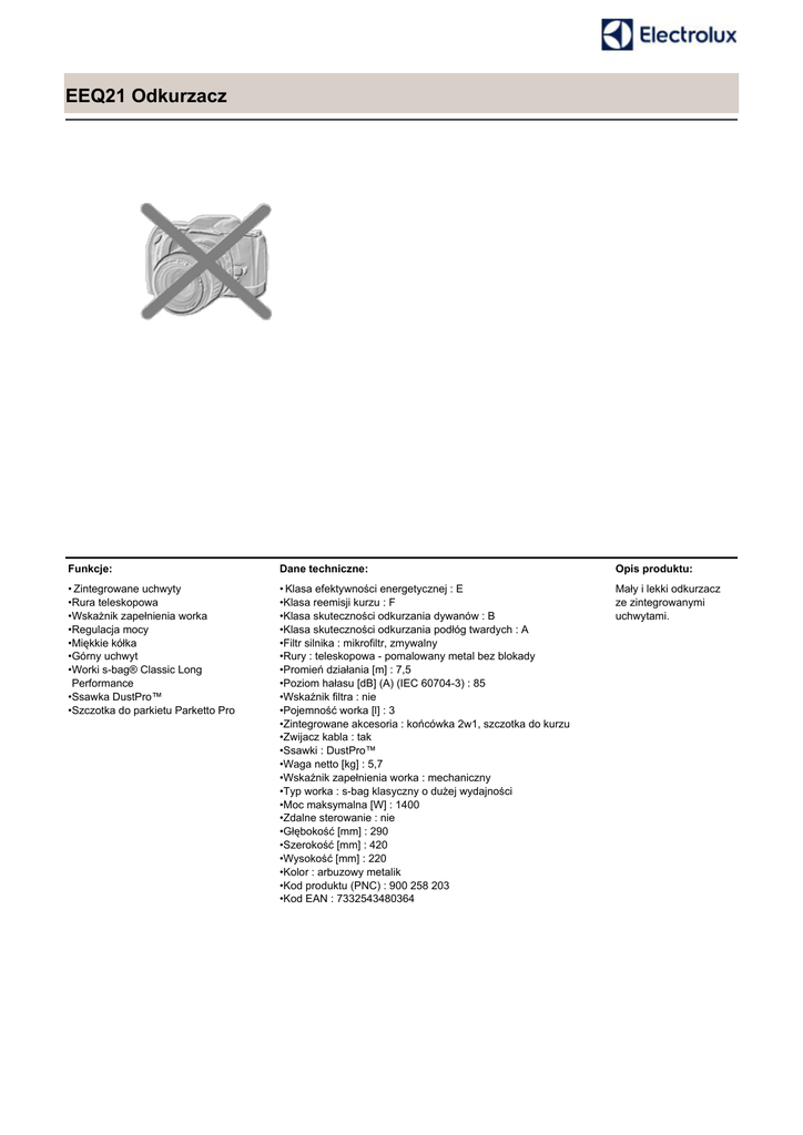 EEQ21 Odkurzacz Funkcje: Dane techniczne: Opis produktu: • Zintegrowane uchwyty •Rura teleskopowa •Wskażnik zapełnienia worka •Regulacja mocy •Miękkie kółka •Górny uchwyt •Worki s-bag® Classic Long Performance •Ssawka DustPro™ •Szczotka do parkietu Parketto Pro • Klasa efektywności energetycznej : E •Klasa reemisji kurzu : F •Klasa skuteczności odkurzania dywanów : B •Klasa skuteczności odkurzania podłóg twardych : A •Filtr silnika : mikrofiltr, zmywalny •Rury : teleskopowa - pomalowany metal bez blokady •Promień działania [m] : 7,5 •Poziom hałasu [dB] (A) (IEC 60704-3) : 85 •Wskaźnik filtra : nie •Pojemność worka [l] : 3 •Zintegrowane akcesoria : końcówka 2w1, szczotka do kurzu •Zwijacz kabla : tak •Ssawki : DustPro™ •Waga netto [kg] : 5,7 •Wskaźnik zapełnienia worka : mechaniczny •Typ worka : s-bag klasyczny o dużej wydajności •Moc maksymalna [W] : 1400 •Zdalne sterowanie : nie •Głębokość [mm] : 290 •Szerokość [mm] : 420 •Wysokość [mm] : 220 •Kolor : arbuzowy metalik •Kod produktu (PNC) : 900 258 203 •Kod EAN : 7332543480364 Mały i lekki odkurzacz ze zintegrowanymi uchwytami.