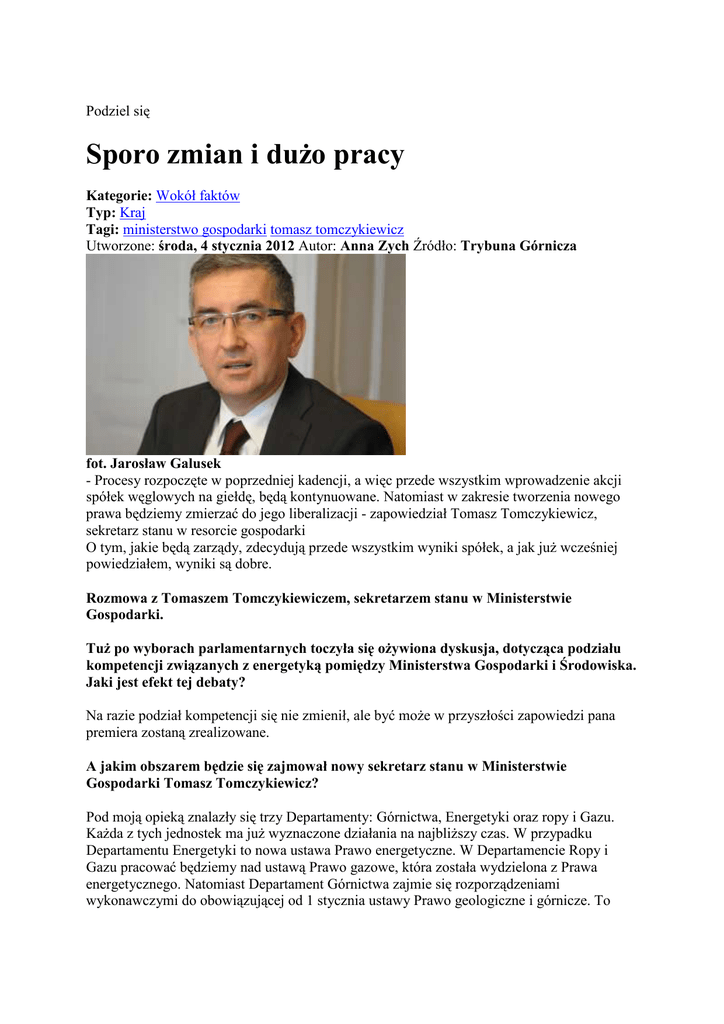 Podziel się Sporo zmian i dużo pracy Kategorie: Wokół faktów Typ: Kraj Tagi: ministerstwo gospodarki tomasz tomczykiewicz Utworzone: środa, 4 stycznia 2012 Autor: Anna Zych Źródło: Trybuna Górnicza fot. Jarosław Galusek - Procesy rozpoczęte w poprzedniej kadencji, a więc przede wszystkim wprowadzenie akcji spółek węglowych na giełdę, będą kontynuowane. Natomiast w zakresie tworzenia nowego prawa będziemy zmierzać do jego liberalizacji - zapowiedział Tomasz Tomczykiewicz, sekretarz stanu w resorcie gospodarki O tym, jakie będą zarządy, zdecydują przede wszystkim wyniki spółek, a jak już wcześniej powiedziałem, wyniki są dobre. Rozmowa z Tomaszem Tomczykiewiczem, sekretarzem stanu w Ministerstwie Gospodarki. Tuż po wyborach parlamentarnych toczyła się ożywiona dyskusja, dotycząca podziału kompetencji związanych z energetyką pomiędzy Ministerstwa Gospodarki i Środowiska. Jaki jest efekt tej debaty? Na razie podział kompetencji się nie zmienił, ale być może w przyszłości zapowiedzi pana premiera zostaną zrealizowane. A jakim obszarem będzie się zajmował nowy sekretarz stanu w Ministerstwie Gospodarki Tomasz Tomczykiewicz? Pod moją opieką znalazły się trzy Departamenty: Górnictwa, Energetyki oraz ropy i Gazu. Każda z tych jednostek ma już wyznaczone działania na najbliższy czas. W przypadku Departamentu Energetyki to nowa ustawa Prawo energetyczne. W Departamencie Ropy i Gazu pracować będziemy nad ustawą Prawo gazowe, która została wydzielona z Prawa energetycznego. Natomiast Departament Górnictwa zajmie się rozporządzeniami wykonawczymi do obowiązującej od 1 stycznia ustawy Prawo geologiczne i górnicze. To bardzo ważny temat, bo będzie miał wpływ nie tylko na funkcjonowanie kopalń, ale także na poziom bezpieczeństwa. Jeden z dzienników snuł przypuszczenia, że Aleksandrę Magaczewską na stanowisku dyrektora Departamentu Górnictwa zastąpi Maciej Kaliski. Czy to prawda? Prawdą jest, że pani Magaczewska przeszła do pracy w Ministerstwie Skarbu Państwa, a dyrektorem departamentu zostaje się w drodze konkursu, tak więc poczekajmy na jego efekt. Konkurs zostanie ogłoszony w najbliższym czasie. Wraz z nowym rokiem Ministerstwo Gospodarki czeka sporo zmian... Istotnie, premier Pawlak zapowiada na przykład stworzenie nowego departamentu, który będzie się zajmował zagadnieniami związanymi z energią odnawialną. Na pewno przed nami dużo pracy. Szacuje się, że tegoroczny zysk netto polskiego górnictwa wynieść może nawet 2 mld zł. Kiedy poznamy wstępne wyniki roku? To pytanie do prezesów spółek węglowych, ale myślę, że wkrótce wstępny szacunek zysków będzie gotowy. Liczby padające w mediach są zbliżone do naszych oczekiwań. Oczywiście główny zysk przypada na Jastrzębską Spółkę Węglową, która jest już spółką giełdową. Skoro już jesteśmy przy JSW - koniec roku obudził niepokoje w tej firmie. Czy w Pana opinii są powody do obaw, że związki mocniej zaakcentują swoje niezadowolenie? Nie powiedziałbym, że były to niepokoje, raczej negatywne opinie dotyczące nowego układu zbiorowego pracy i regulaminów. Taka jest natura związkowców, że odzywają się w takich momentach. Jestem przekonany, że zarząd spółki sobie poradzi, a nowy regulamin będzie służył przede wszystkim jej rozwojowi. Pakiet klimatyczny to zagrożenie, które nadal wisi nad głowami producentów węgla. Czy przedsiębiorcy firm wydobywczych w swoich działaniach antypakietowych mogą liczyć na wsparcie Ministerstwa Gospodarki? Analizując inwestycje w bloki energetyczne oparte na węglu, jakie firmy - te z udziałem skarbu państwa i te prywatne - zrealizują w najbliższych latach, można być spokojnym o rynek zbytu na węgiel energetyczny. Wydaje się, że niektóre zapisy pakietu klimatycznego, związane z koniecznością redukcji emisji, staną się faktem. Nie ma tu o co kruszyć kopii, trzeba się do tych zasad przyzwyczaić. Jestem jednak przekonany, że nie dopuścimy do dalszego zaostrzenia przepisów i stosowania kolejnych restrykcji wobec energetyki opartej na węglu. Nowy wiceminister gospodarki odpowiedzialny za górnictwo opowiada się za polityką przełomu czy kontynuacji? Procesy rozpoczęte w poprzedniej kadencji, a więc przede wszystkim wprowadzenie akcji spółek węglowych na giełdę, będą kontynuowane. Natomiast w zakresie tworzenia nowego prawa będziemy zmierzać do jego liberalizacji. Kolejnym priorytetem jest zagwarantowanie odbiorcy dostępu do taniej energii. Wydaje się, że w tym roku debiuty kolejnych spółek węglowych nie dojdą do skutku. To zależy od kondycji tych firm, które muszą uporządkować jeszcze wiele spraw wewnątrz swoich struktur. Drugą sprawą jest koniunktura na rynku Giełdy Papierów Wartościowych. Dzisiaj wydaje się, że nie jest ona najlepsza. Zobaczymy, jak będzie to wyglądało w połowie roku. Być może koniunktura będzie na tyle dobra, że będzie można myśleć o debiutach kolejnych spółek węglowych. Czy przewiduje Pan przeprowadzenie zmian kadrowych w zarządach spółek węglowych? O tym, jakie będą zarządy, zdecydują przede wszystkim wyniki spółek, a jak już wcześniej powiedziałem, wyniki są dobre.