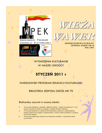 WIEśA WAWER MIESIĘCZNIK KULTURALNY ZESPOŁU SZKÓŁ NR 70 NR 1/2011 WYDARZENIA KULTURALNE W NASZEJ OKOLICY STYCZEŃ 2011 r WARSZAWSKI PROGRAM EDUKACJI KULTURALNEJ BIBLIOTEKA ZESPOŁU SZKÓŁ NR 70 Kulturalny styczeń w naszej szkole: • • • 24 stycznia młodzieŜ z projektu „Młodzi Liderzy” będzie uczestniczyć w wernisaŜu i premierze filmu nt. projektu w Klubie Kultury Falenica 25 stycznia potkanie z Łukaszem Wierzbickiem, pisarzem i podróŜnikiem, którego najnowsza ksiąŜka o niedźwiedziu z Armii Andersa dostała w zeszłym roku wiele nagród 26 stycznia zaprosimy rodziców na tradycyjne Jasełka w wykonaniu młodszych dzieci IMPREZY DLA DZIECI 15 stycznia (sobota), g. 15.00 „Star Wars Extreme” – impreza dla dzieci -w programie imprezy znajdą się: Prezentacje postaci tj. Lord Vader, Bob Fet, rycerze Jedi i inni. Otwarta zostanie Akademia Mocy, w której adepci poznają sztukę walki mieczem świetlnym. Uczestnicy imprezy będą mieli okazję zapoznać się z budową szturmowców i wziąć udział w ich oklejaniu. Na zakończenie odbędzie się konkurs wiedzy z filmu. Klub Kultury „Radość”, ul. Planetowa 36. 15 stycznia (sobota), godz. 12.00 Gorące rytmy karnawału – taniec hula i gorące Hawaje powitają dzieci i rodziców. Zabawę poprowadzi wodzirej. Klub Kultury „Marysin”, ul. Korkowa 96 21 stycznia (piątek), godz. 18.30 Audycja Muzyczna - w wykonaniu uczestników sekcji nauki gry na instrumentach klawiszowych p. ElŜbiety Osiak i Lucyny Affeltowicz. Usłyszymy fortepianowe interpretacje najpiękniejszych kolęd polskich, oraz innowacyjne aranŜacje na keyboard, grane solo i w duetach. Zapraszamy. Klub Kultury „Radość”, ul. Planetowa 36. 23 stycznia (niedziela), godz. 13.00 „Kopciuszek” bajka dla dzieci Klub Kultury „Falenica”, ul. Włókiennicza 54 28 stycznia (piątek), g.18.00 „Rozmowy z Babcią i Dziadkiem” .Spektakl muzyczny w wykonaniu „Melodyjek” i „Intermedium”, reŜyseria Irena Rogowska Klub Kultury „Falenica”, ul. Włókiennicza 54 29 stycznia (sobota), g.16:00 „Karnawał zwierząt”- zabawa karnawałowa dla dzieci. Zapraszamy groźne lwy, szybkie tygrysy, zwinne koty i inne zwierzęta na bal. Zapewniamy konkursy z nagrodami i dobrą zabawę przy dźwiękach natury. Bilety do odbioru w dniu 24.01 (poniedziałek) w godz. 17.0019.30 Klub Kultury „Zastów”, ul. Lucerny 13 PRZEDSTAWIENIA TEATRALNE 22 stycznia (sobota), godz. 15.00 Spektakl teatralny dla dzieci pt. „KsiąŜe i Ŝebrak” w wykonaniu aktorów teatru Art-Re. Sztuka oparta na słynnej powieści Marka Twaina o dwóch chłopcach sobowtórach: księciu i Ŝebraku rozgrywająca się w scenerii średniowiecznej Anglii. Zamiana ról Ŝyciowych bohaterów i co z tego wynikło. Kwestia stosunku do ludzi w zaleŜności od usytuowania w społeczeństwie. Pochwała uczucia sprawiedliwości i przyjaźni. Klub Kultury „Aleksandrów”, ul. Samorządowa 10 KONCERTY, BIESIADY LITERACKIE 11 stycznia (wtorek), godz. 16.30 Koncert zespołu „Appassionata” pod kierownictwem Izabeli Wardak z akompaniamentem Anny Cegielskiej. W programie piosenki zimowe i kolędy. Klub Kultury „Anin”, ul. V Poprzeczna 13 12 stycznia (środa), godz. 18.00 „Na ten Nowy Rok” Koncert noworoczny w wykonaniu uczestników sekcji muzycznej Klubu Kultury „Falenica”, prowadzenie Sławomir Łobaczewski Klub Kultury „Falenica”, ul. Włókiennicza 54 15 stycznia (sobota), godz. 17.00 Koncert noworoczny dla mieszkańców. Klub Kultury „Marysin”, ul. Korkowa 96 19 stycznia (środa), godz. 18.00 „Raz na rockowo” Spotkanie autorskie Jacka Kawy: koncert gitarowy oraz wernisaŜ jego prac (rysunek, malarstwo) Klub Kultury „Falenica”, ul. Włókiennicza 54 28stycznia(piątek), godz.18.00 ,,Jeden dzień w roku” – koncert kolęd i piosenek o tematyce BoŜego Narodzenia w wykonaniu Dziecięco -MłodzieŜowego Zespołu Estradowego, pracującego pod opieką p. Jerzego Ostrowskiego i choreograf p. Anny Marek. Współczesne aranŜacje oraz innowacyjne interpretacje tradycyjnych polskich kolęd, oraz najpiękniejsze świąteczne piosenki Klub Kultury „Radość”, ul. Planetowa 36. SPOTKANIA, PROJEKCJE, WYKŁADY 12 stycznia (środa), godz. 11.40 i 14 stycznia (piątek), godz. 11.40 Spotkanie z podróŜnikiem i literatem Krzysztofem Dworczykiem pt. „Australia i Nowa Zelandia”. Podczas spotkania prelekcja i film autora. Klub Kultury „Anin”, ul. V Poprzeczna 13 15 stycznia (sobota), godz. 16.00 Wieczór Kultury Gruzińskiej prowadzony przez Giorgi Maglakelidze, autora ksiąŜki pt. „Toasty gruzińskie”. W programie: Wykład interaktywny wraz z prezentacją slajdów Poczęstunek tradycyjnymi potrawami kuchni gruzińskiej Klub Kultury „Anin”, ul. V Poprzeczna 13 25 stycznia (wtorek), godz. 16.30 „La Camina – najstarszy szlak pielgrzymkowy Europy do Santiago de Compostella”. Spotkanie z podróŜniczką p. Marianną Rychlicką. W programie prelekcja i pokaz slajdów z wyprawy. Klub Kultury „Anin”, ul. V Poprzeczna 13 WYSTAWY, WARSZTATY, KONKURSY 3 stycznia (poniedziałek) godz. 16.00 – 17.00 Zapraszamy dzieci wraz z rodzicami na rodzinne warsztaty plastyczne -,, Karnawałowe dodatki”,A 5 stycznia (środa) godz. 16.30 na wystawę pt,, Karnawałowe dodatki”. Będzie moŜna obejrzeć balowe akcesoria zrobione przez uczestników warsztatów plastycznych. Klub Kultury „Marysin”, ul. Korkowa 96 8 stycznia (sobota), godz. 17.00 Otwarcie wystawy haftu artystycznego Mirosława Janiszewskiego pt. „Igłą malowane”. Dni zwiedzania wystawy: poniedziałek godz. 12.00 – 18.00, wtorek godz. 12.00 – 21.00, środa, czwartek godz. 12.00 – 18.00. Klub Kultury „Anin”, ul. V Poprzeczna 13 12 stycznia (środa), g.16.00 Zapraszamy na warsztaty plastyczne, na których będziemy robić,, Byśki” – zwierzątka przynoszące szczęście w nowym roku. Klub Kultury „Marysin”, ul. Korkowa 96 24 stycznia (poniedziałek), godz. 18.00 „Warszawa